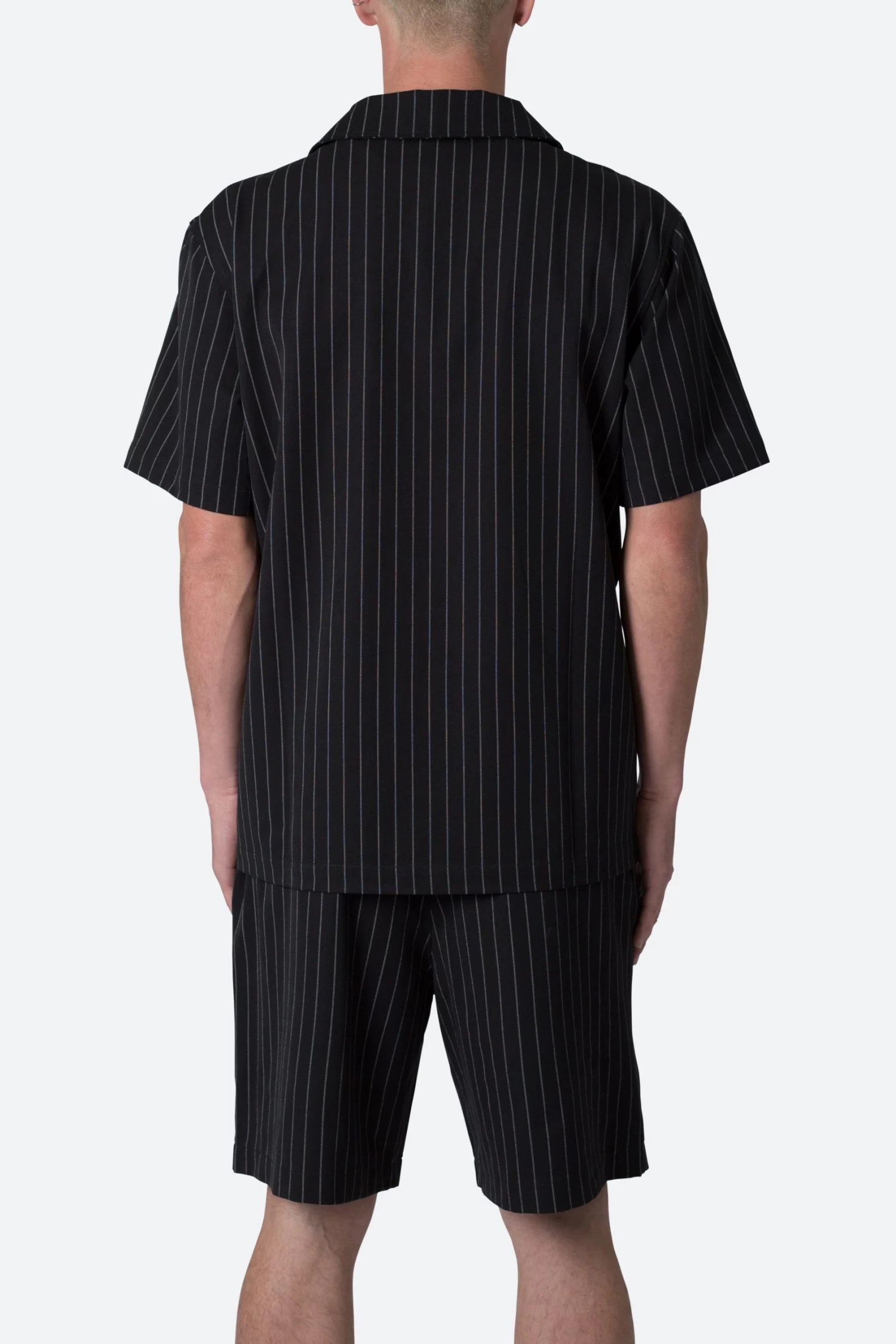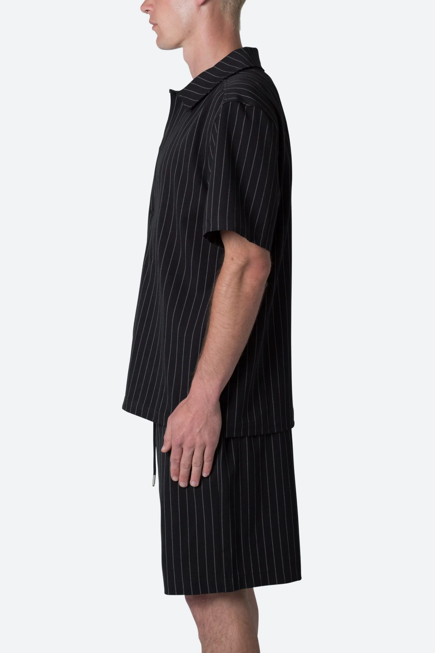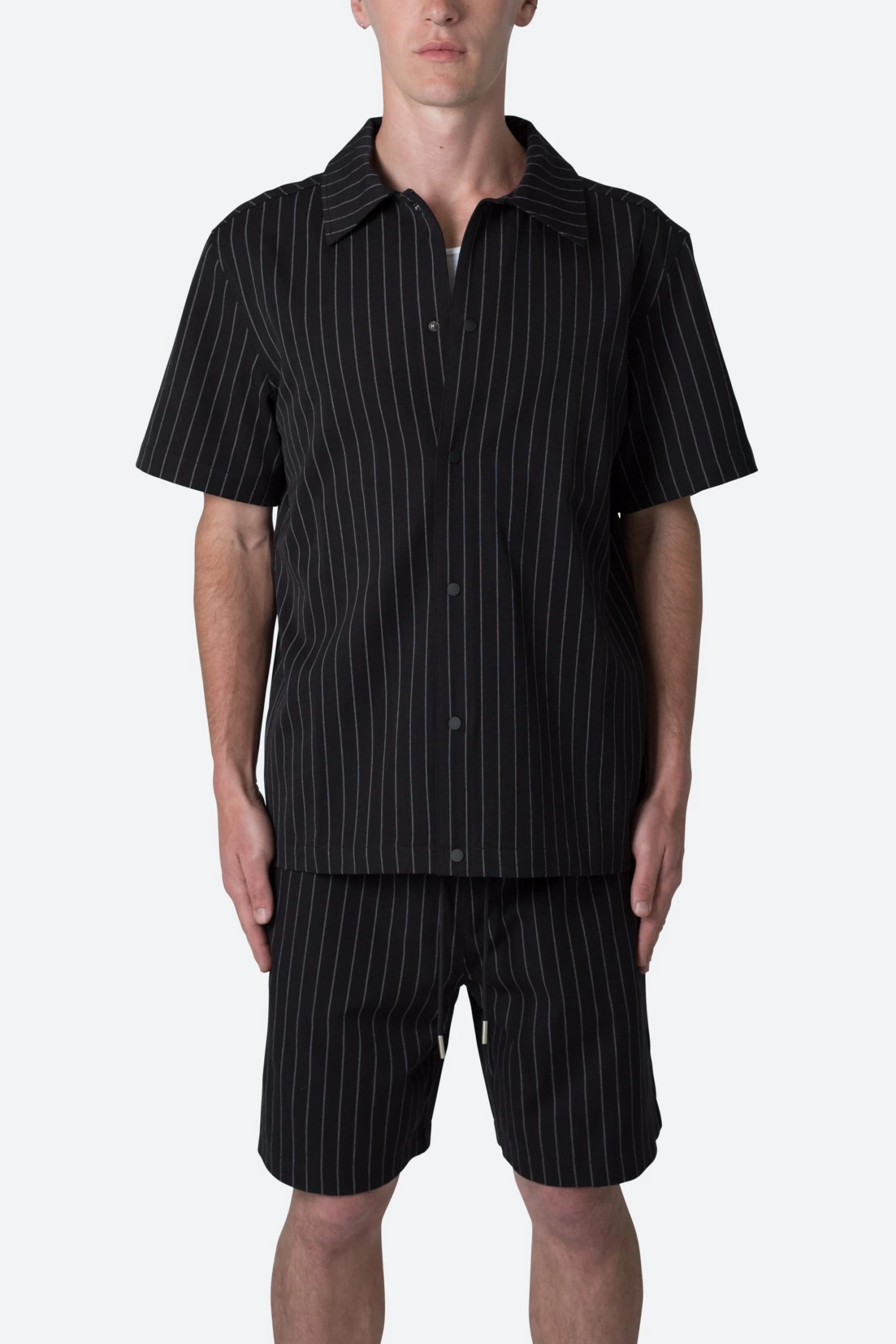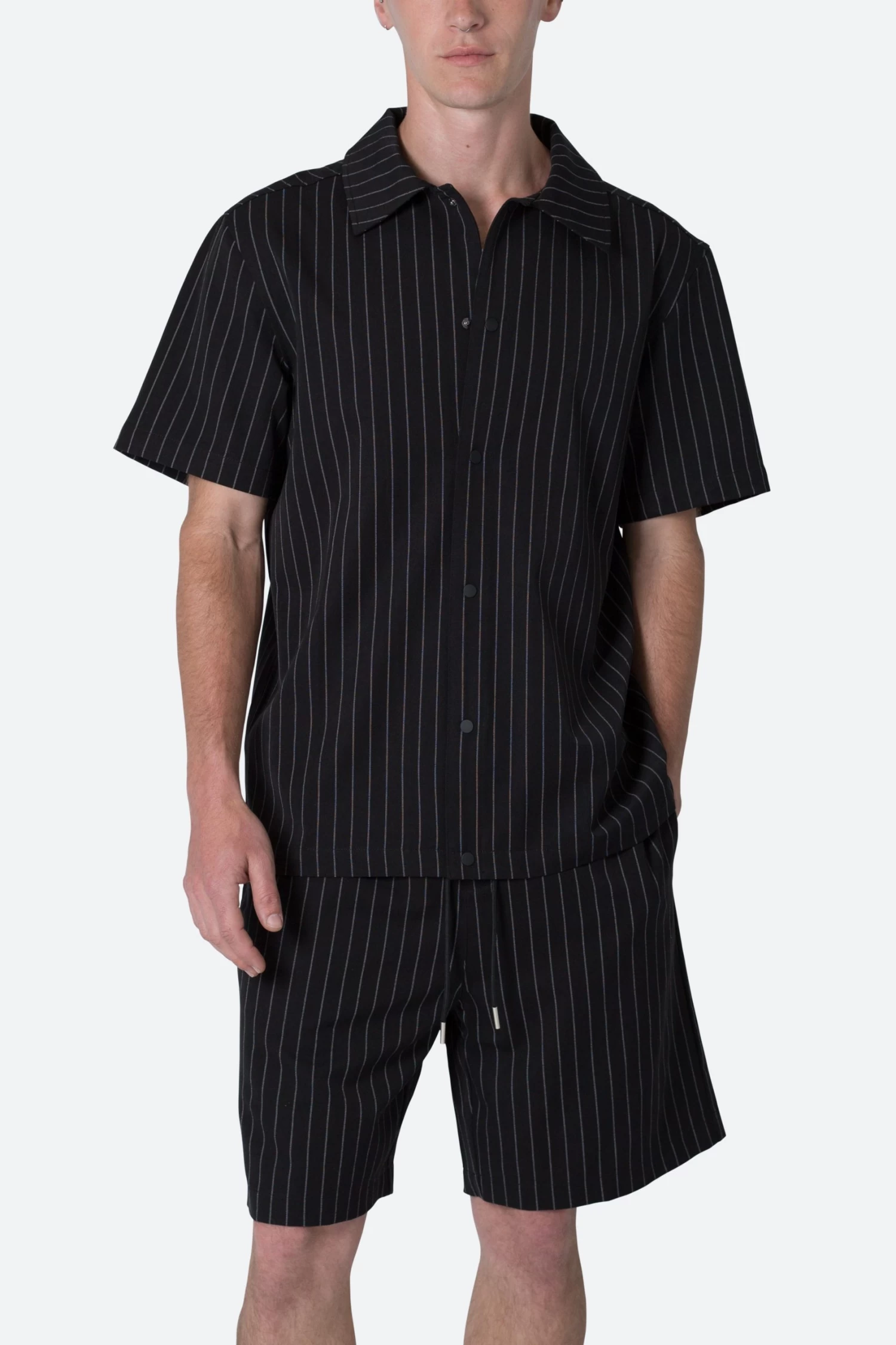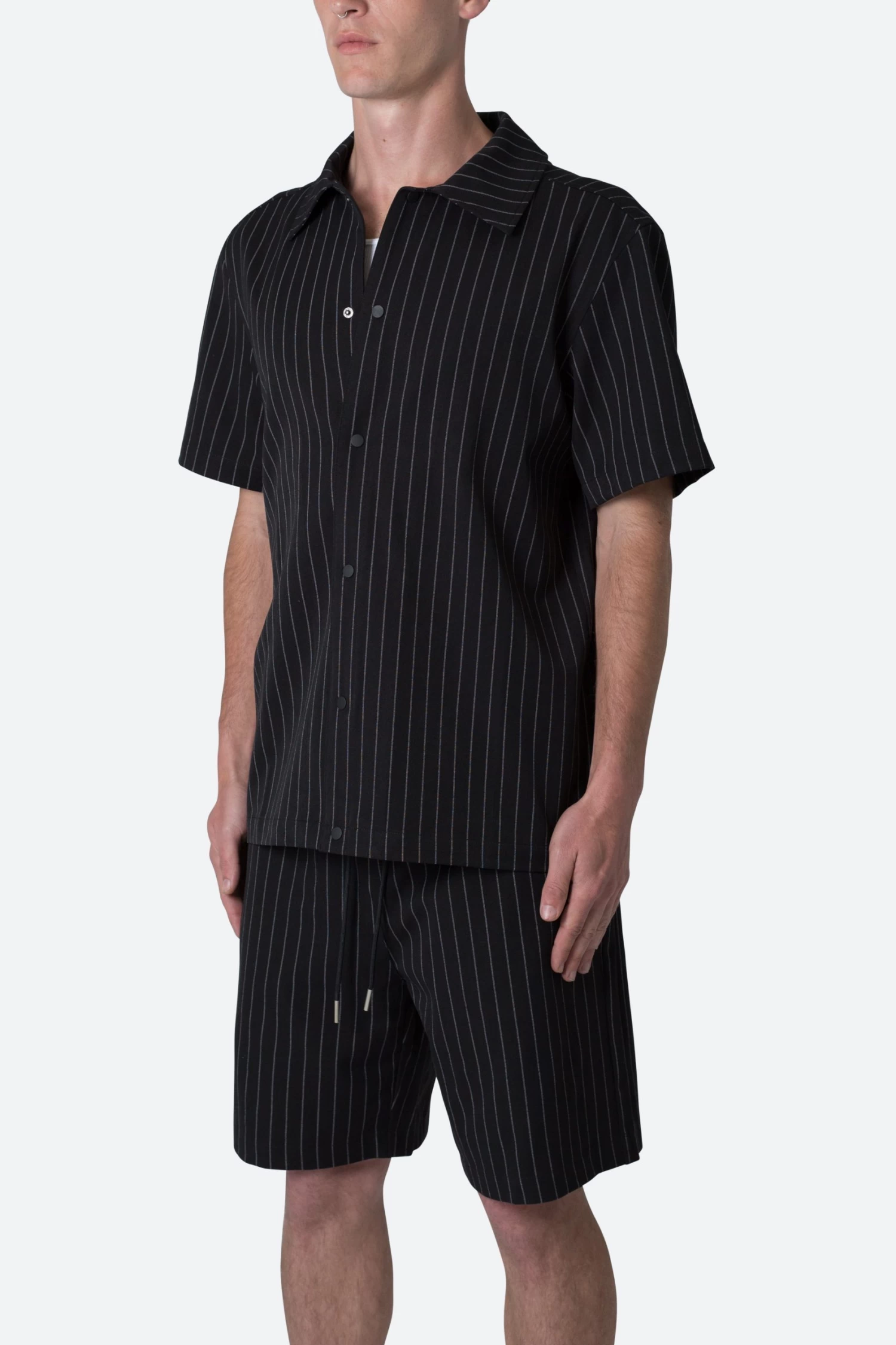 the Pinstripe Short Sleeve Shirt is made from a custom developed fabric. The relaxed-fit shirt features tonal buttons, and jacquard pin striping.
