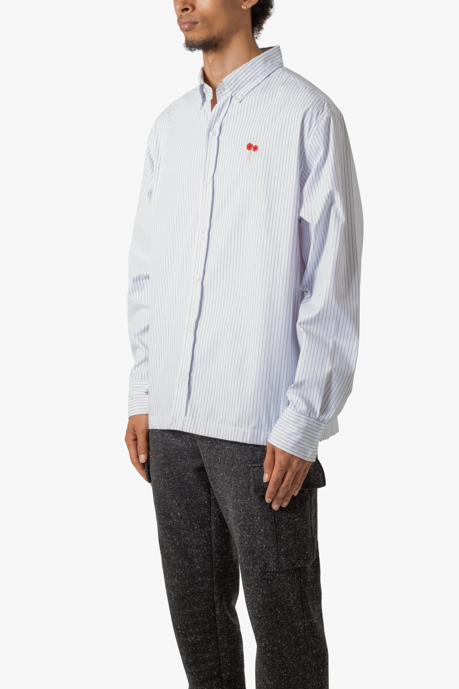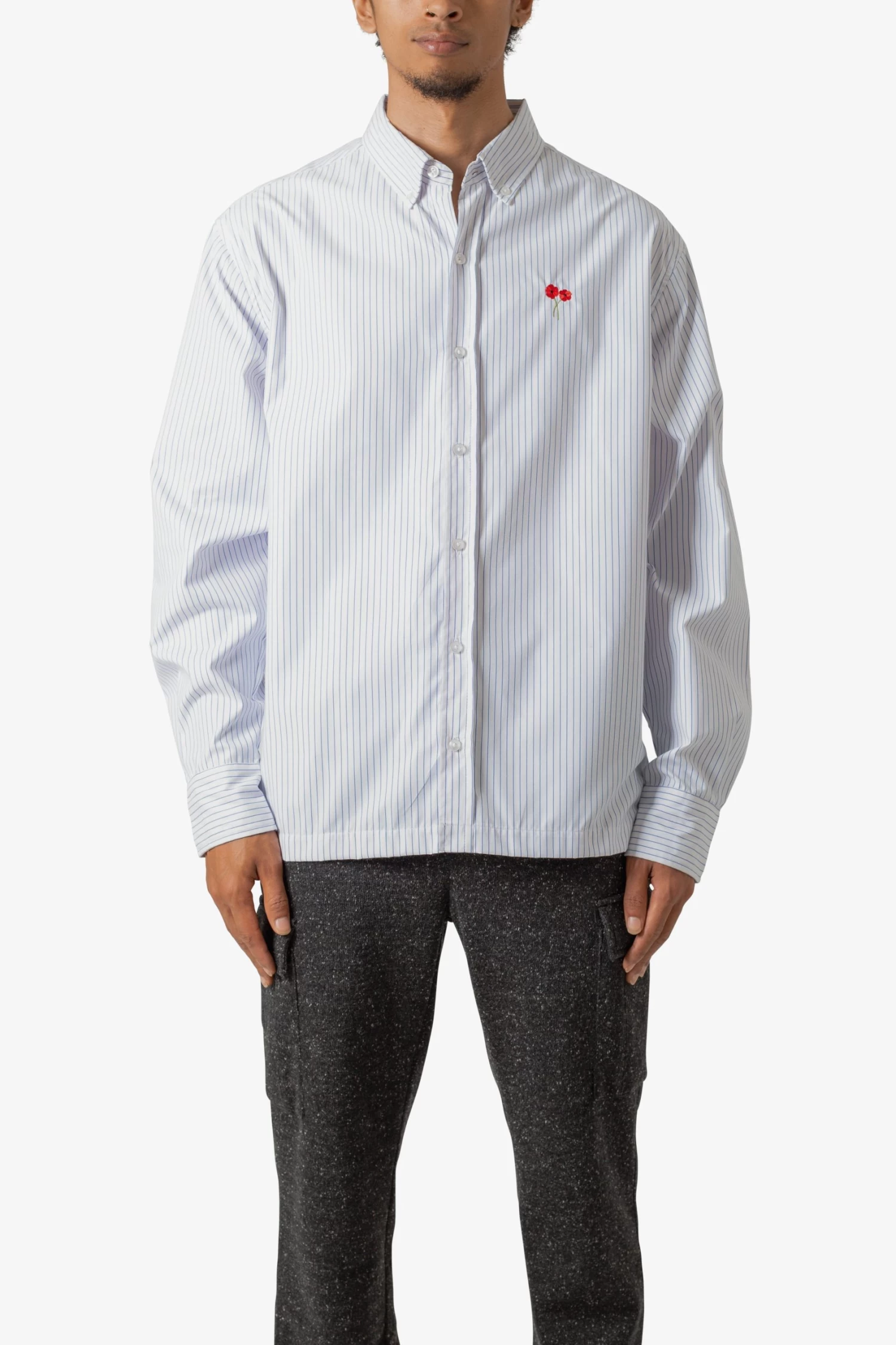 the Poppy Striped Oxford Shirt is designed with an oversized fit and features a flat hemline, pleats at the wrist, an adjustable button closure, slits at the side seam, poppy embroidery at the chest, and all in cotton woven striped fabric.