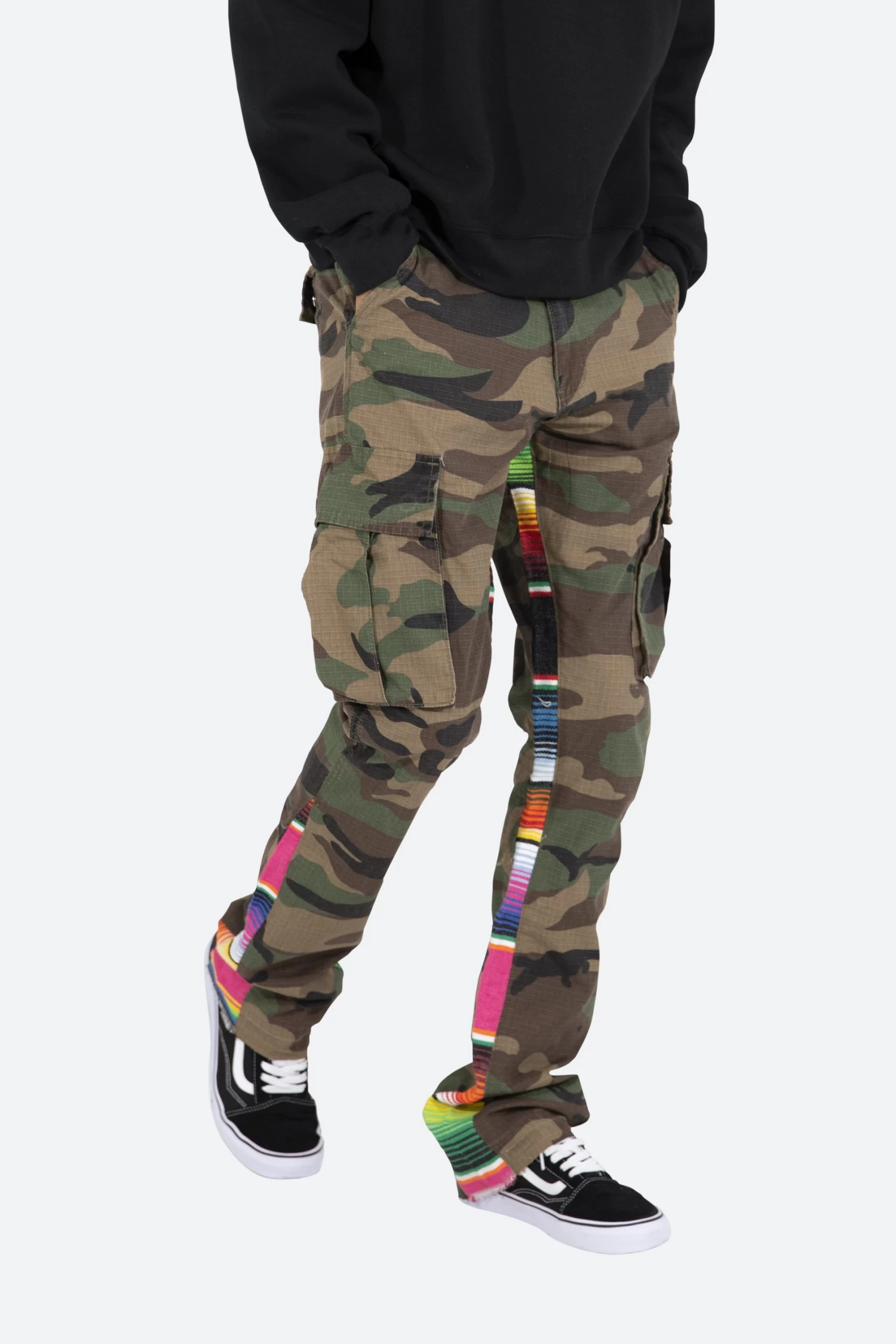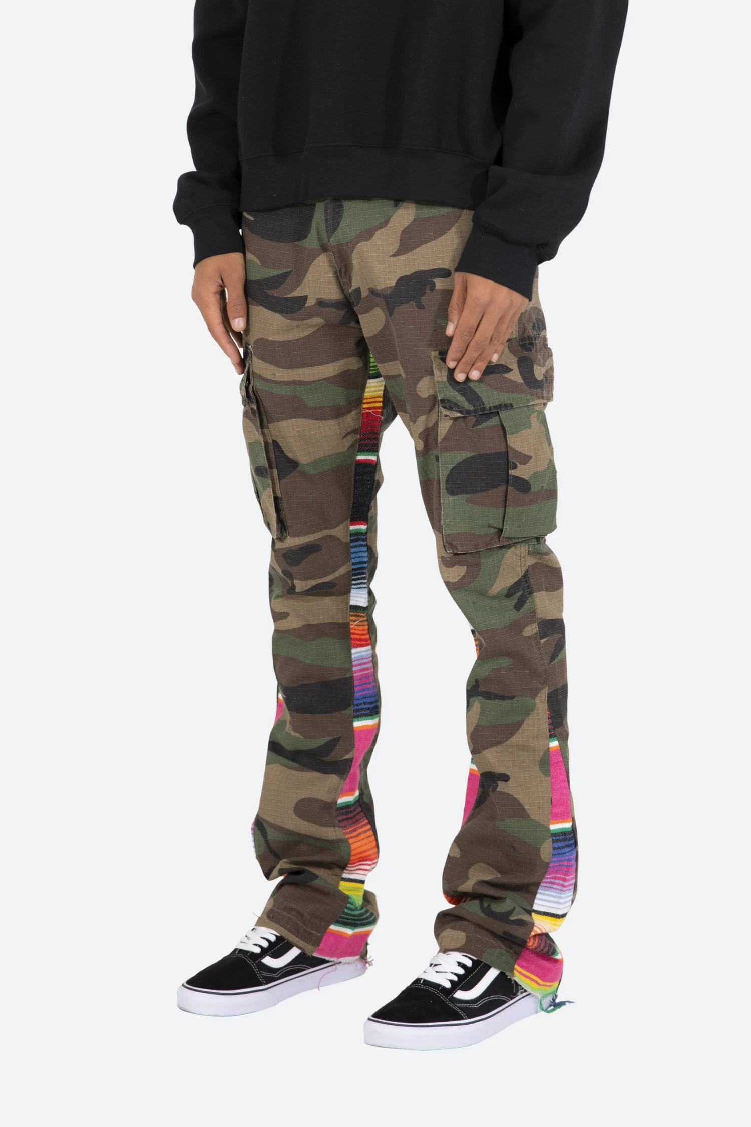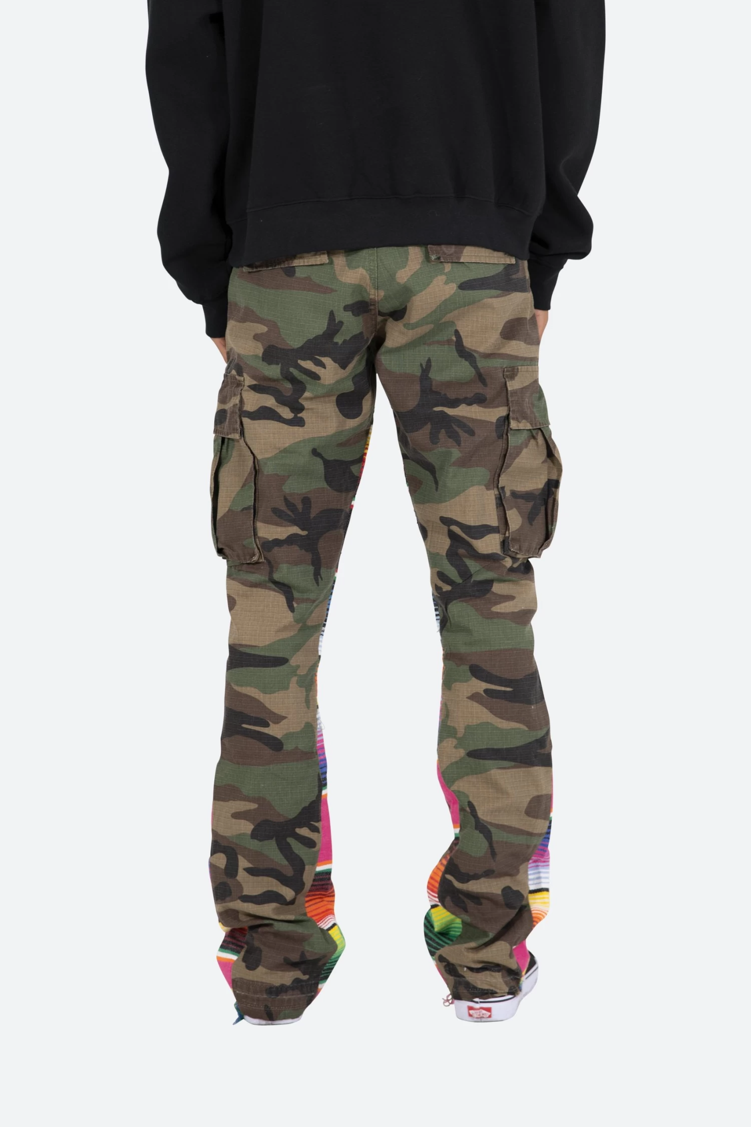 the Serape Bootcut Cargo Pants are designed with our new B fit, which is slim through the thigh and features a slight flare at the leg opening and is constructed from washed camo twill, with a vintage wash and paint splatter, and finished with a contrasting multi color blanket panels.