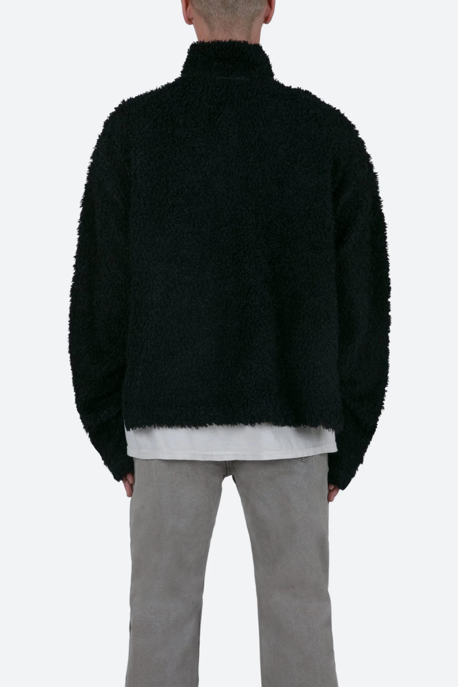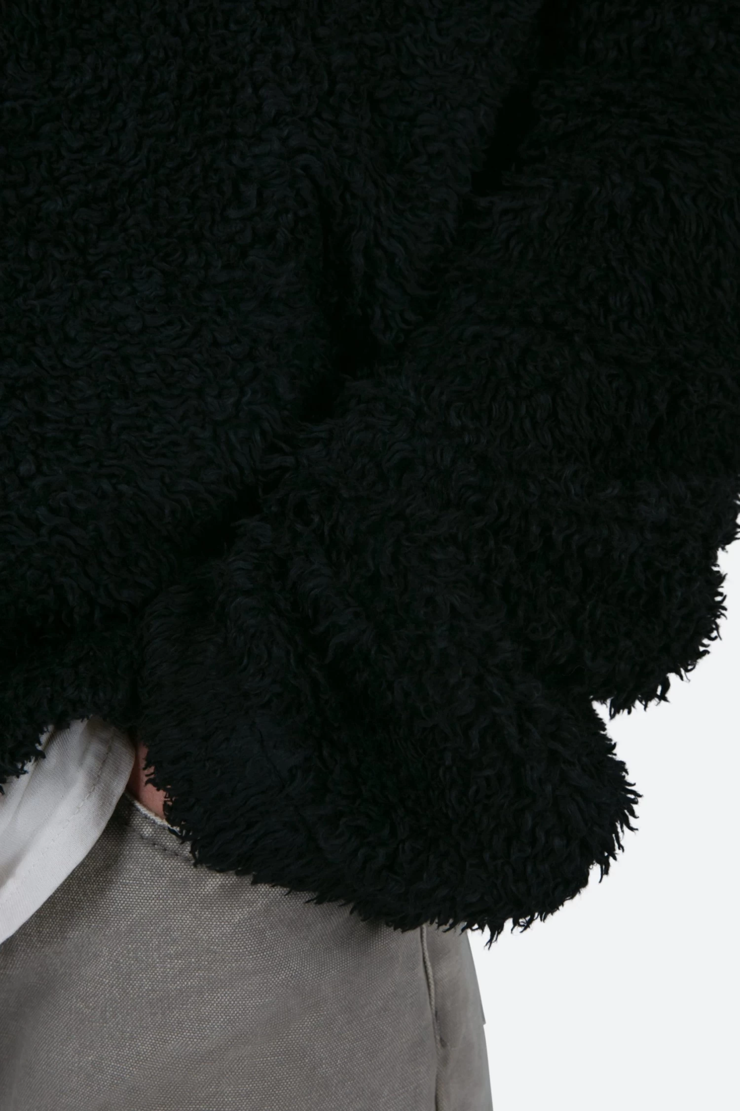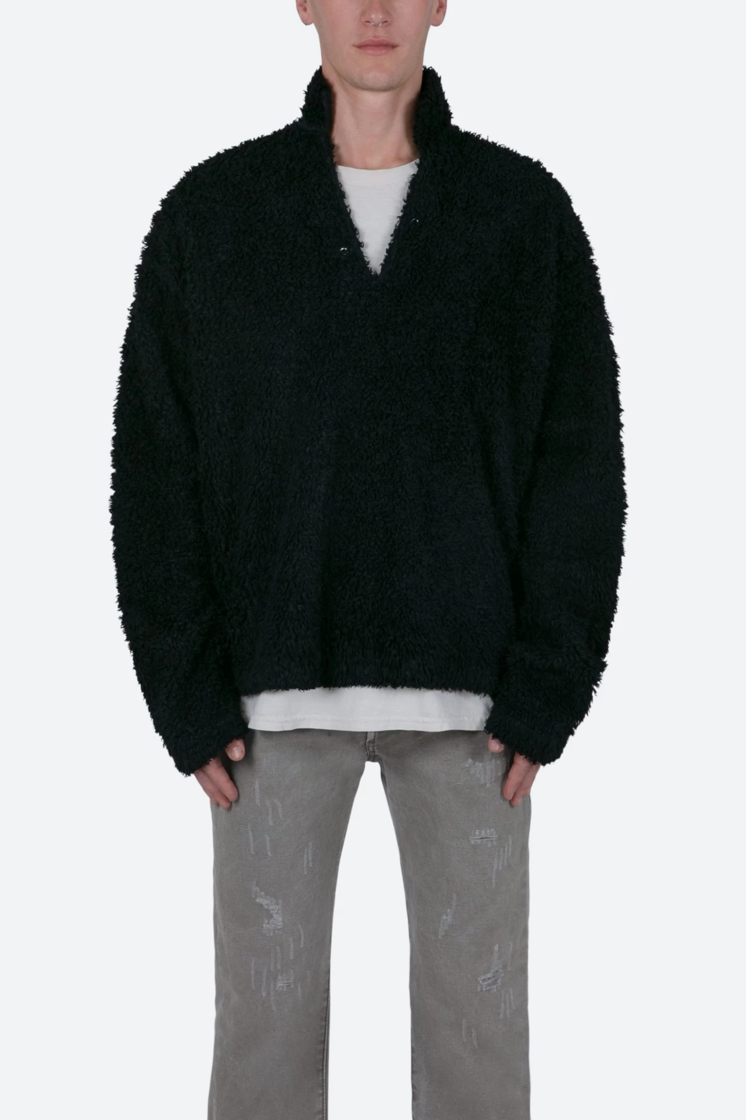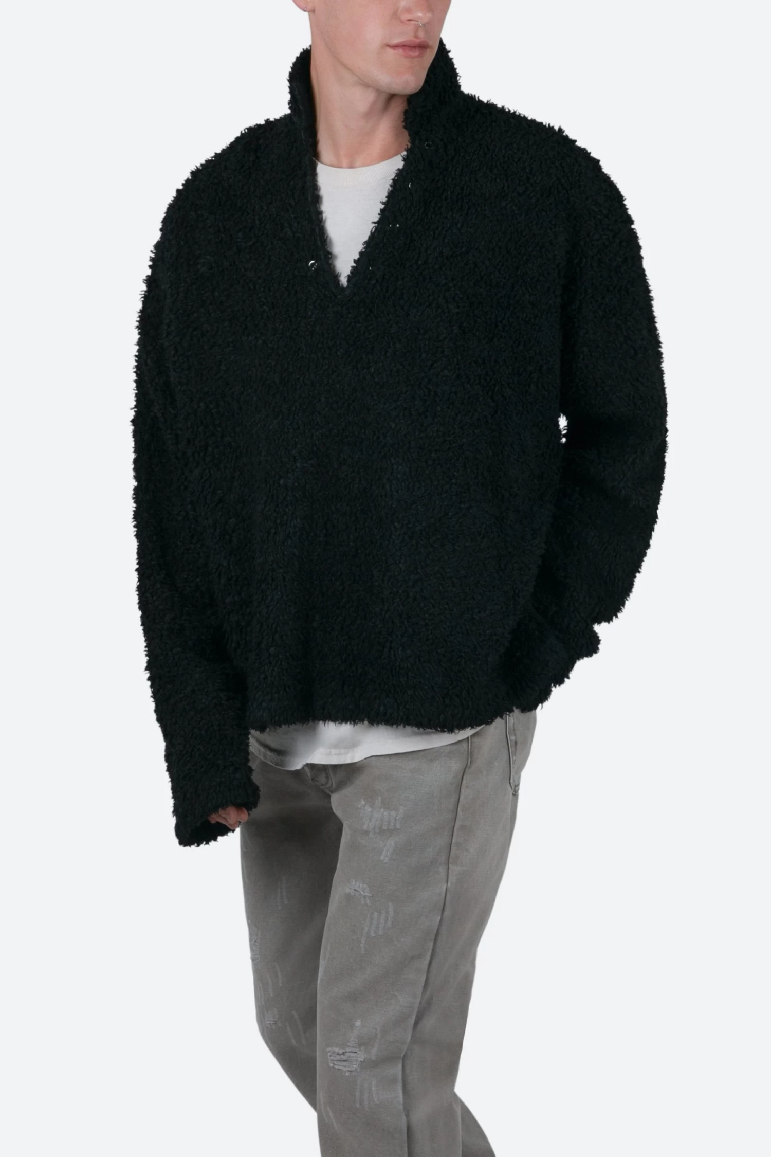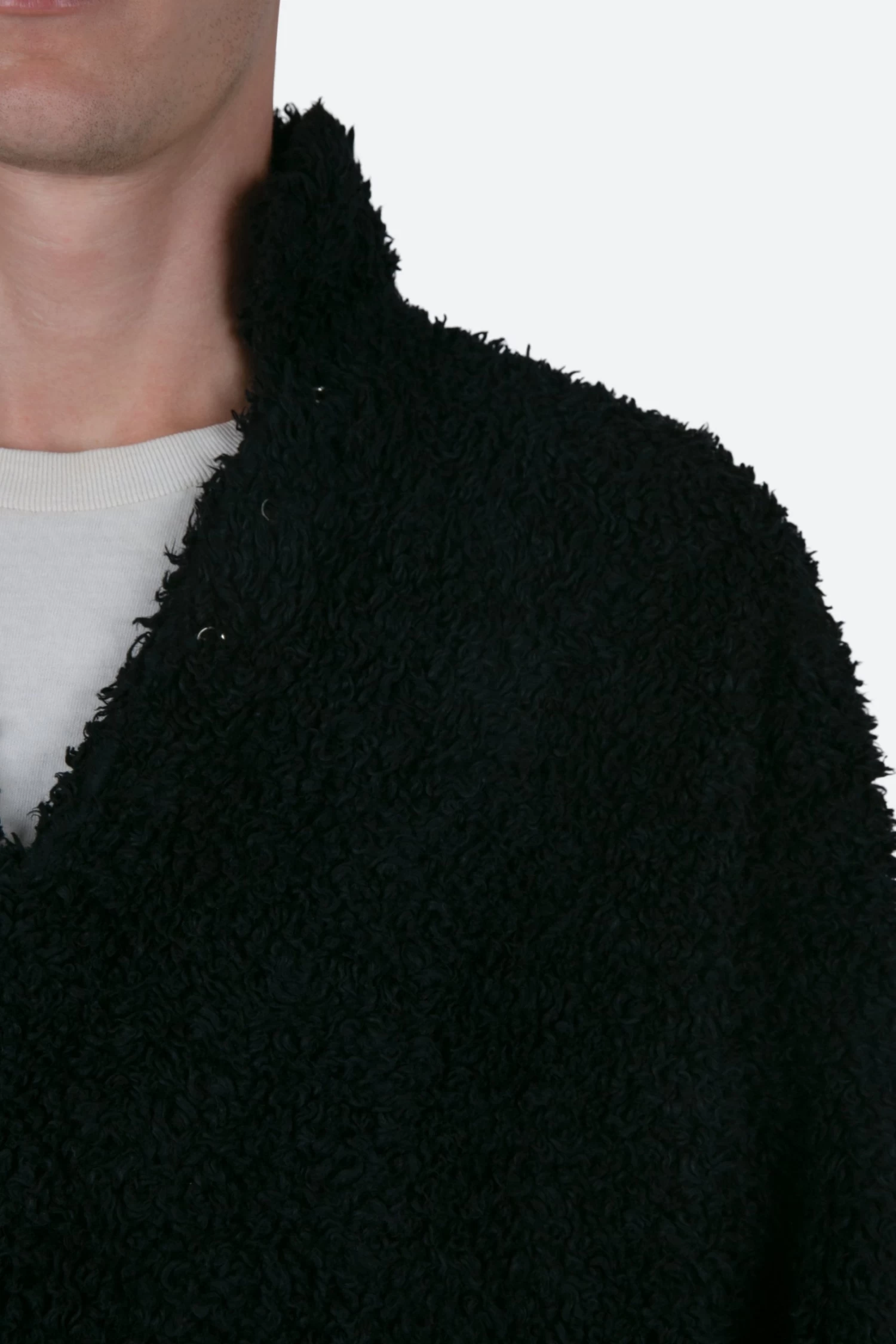 the Sherpa Pullover is designed with a relaxed fit, an open placket, standing collar, and constructed from a custom developed sherpa fabric.