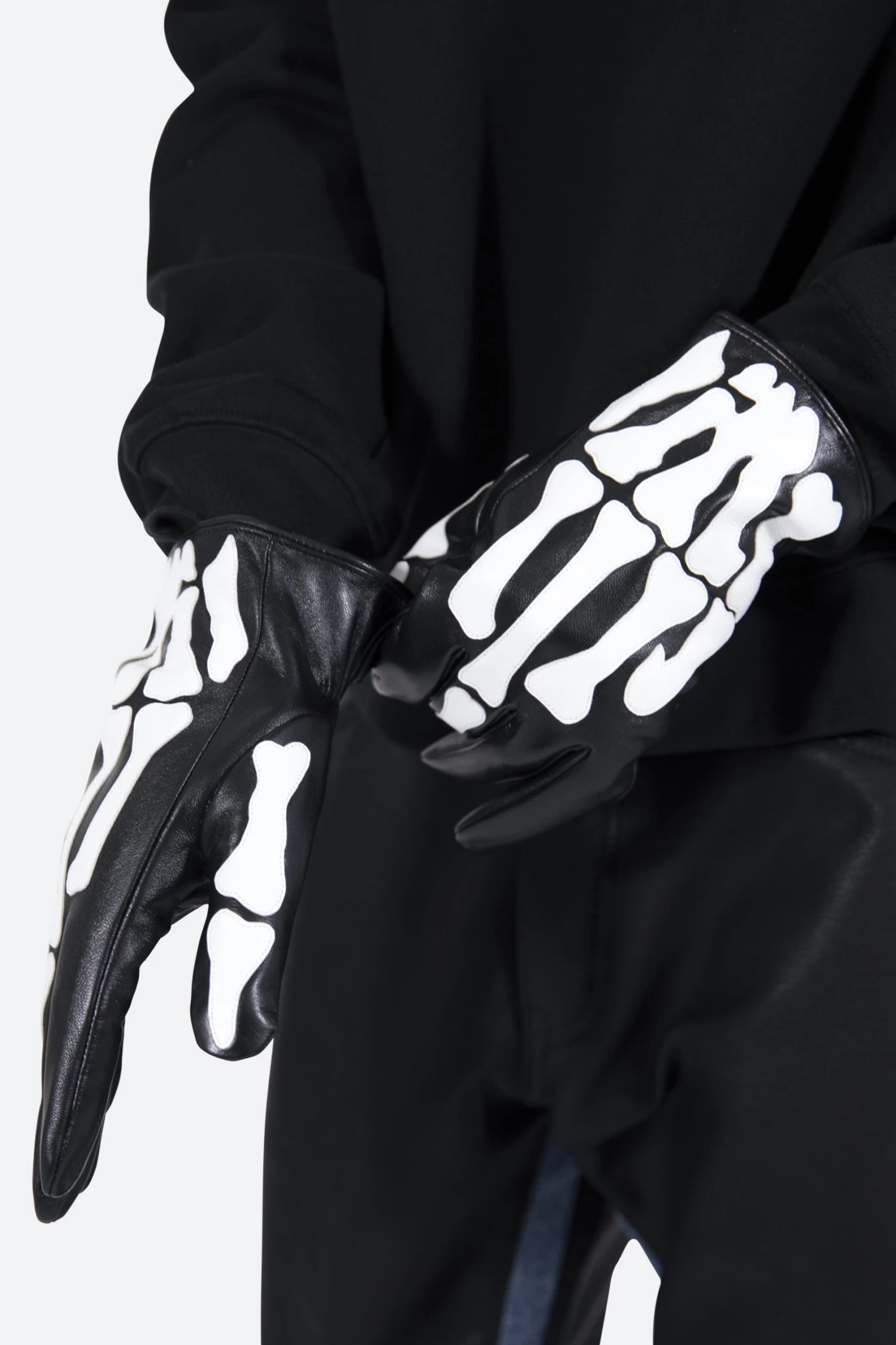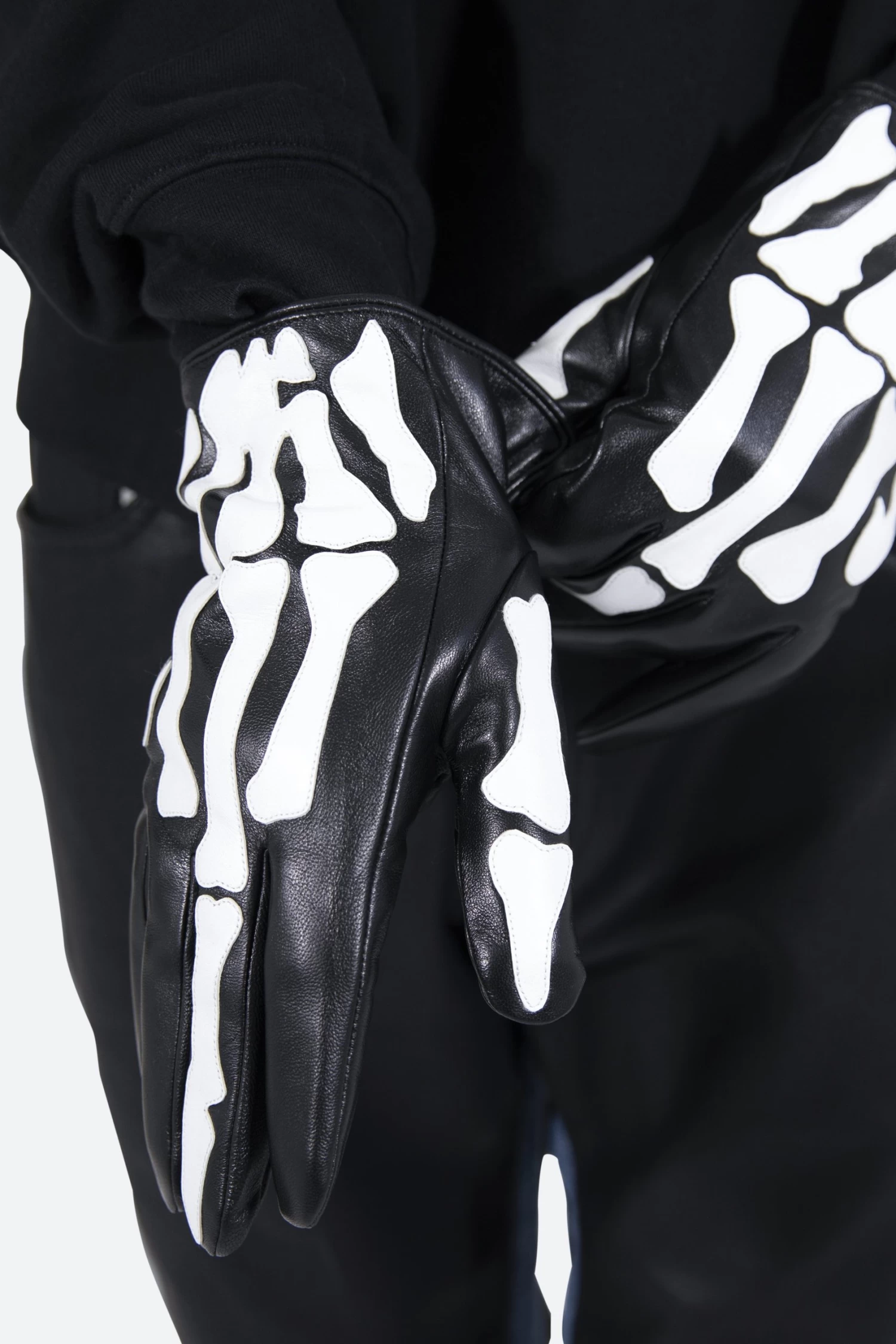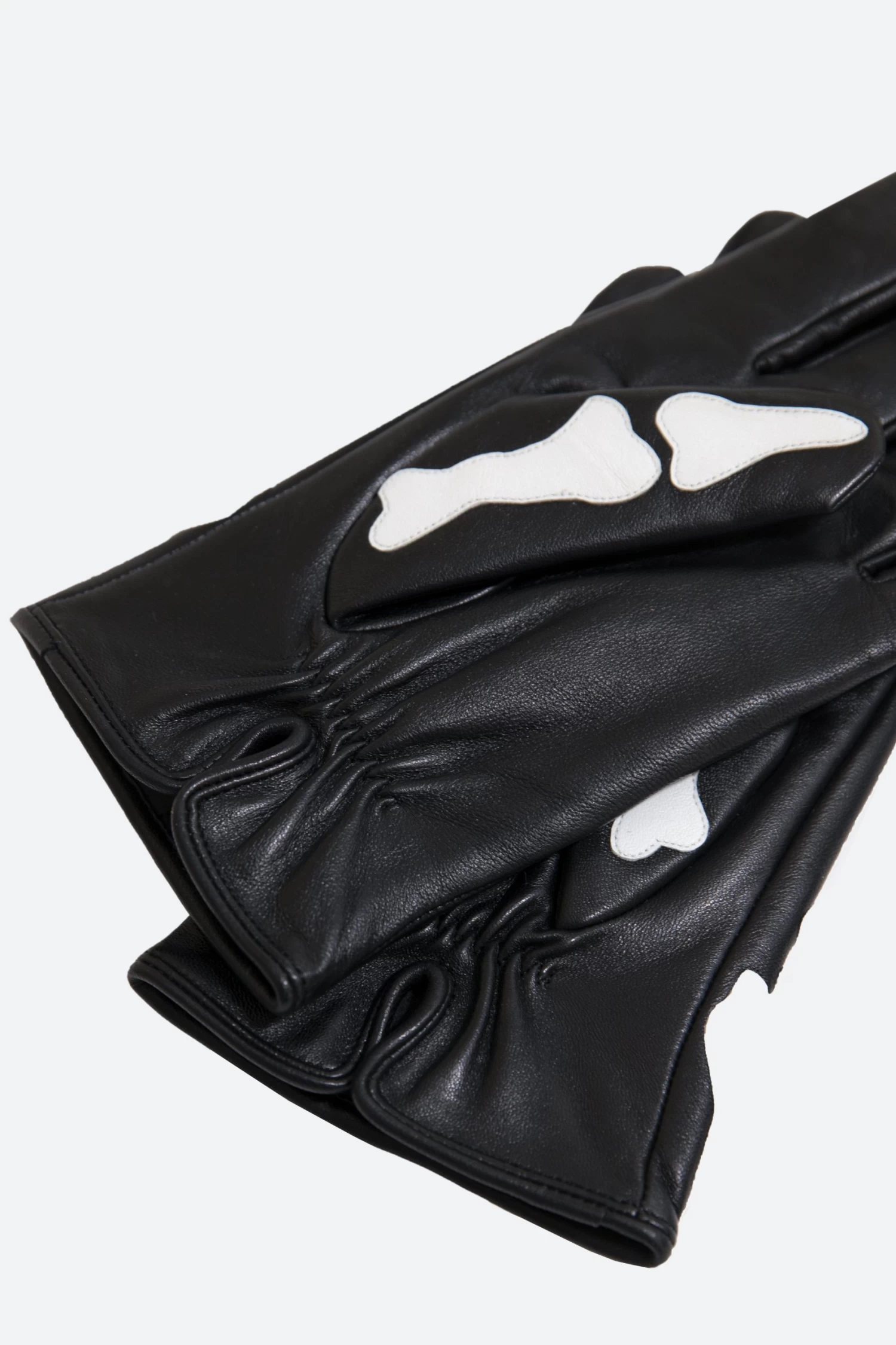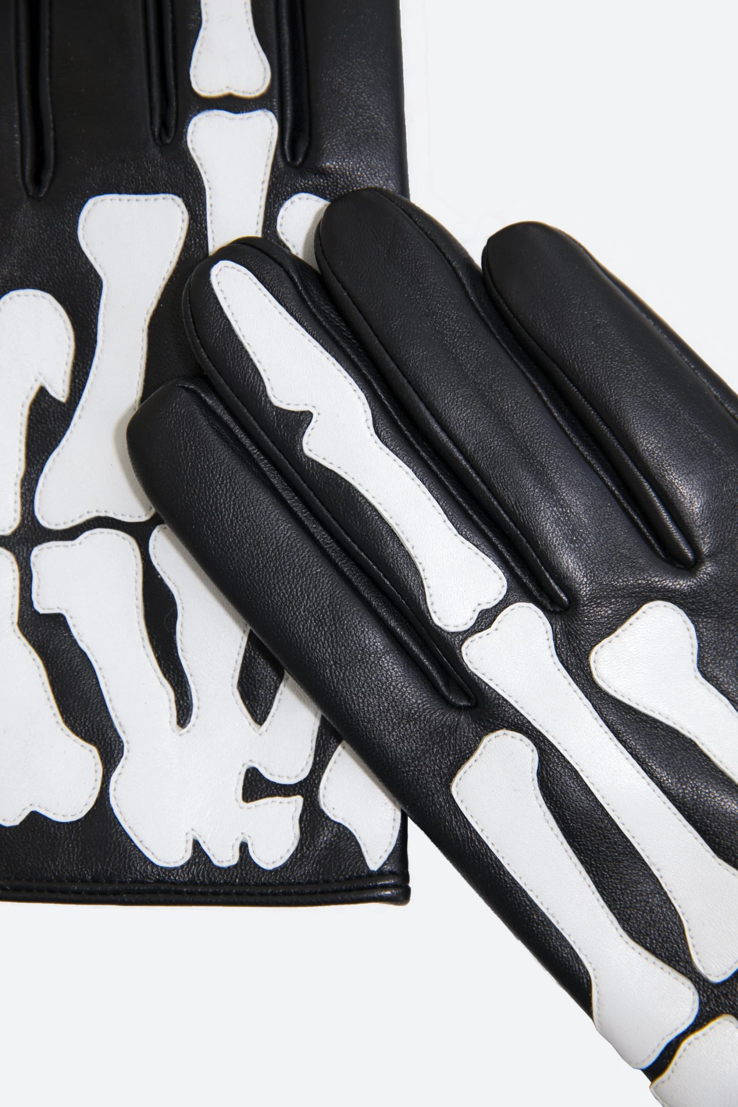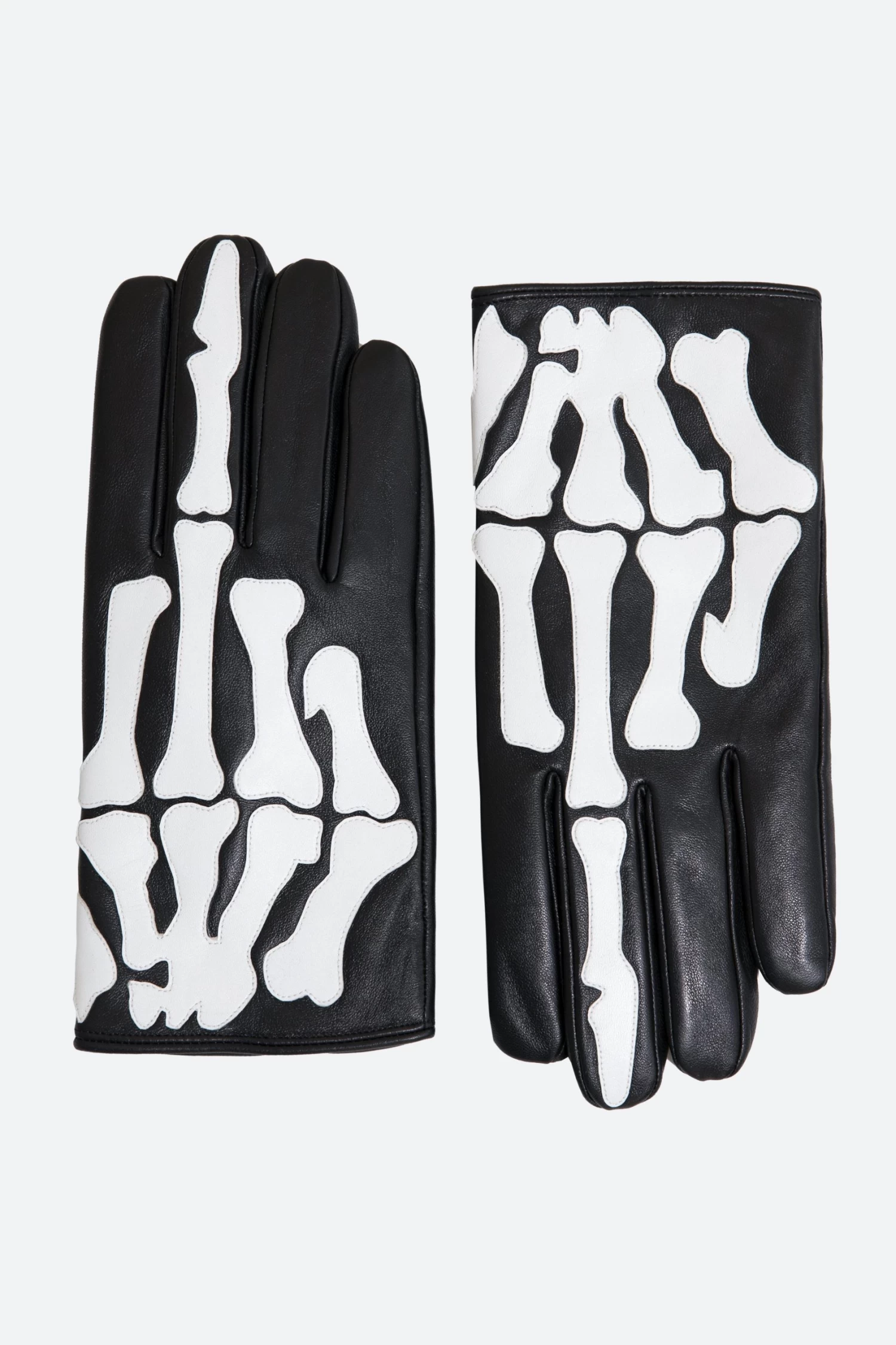 the Skeleton Gloves are constructed from vegan pu leather and have an elasticized closing at the wrist and are finished with white vegan pu leather skeleton applique.