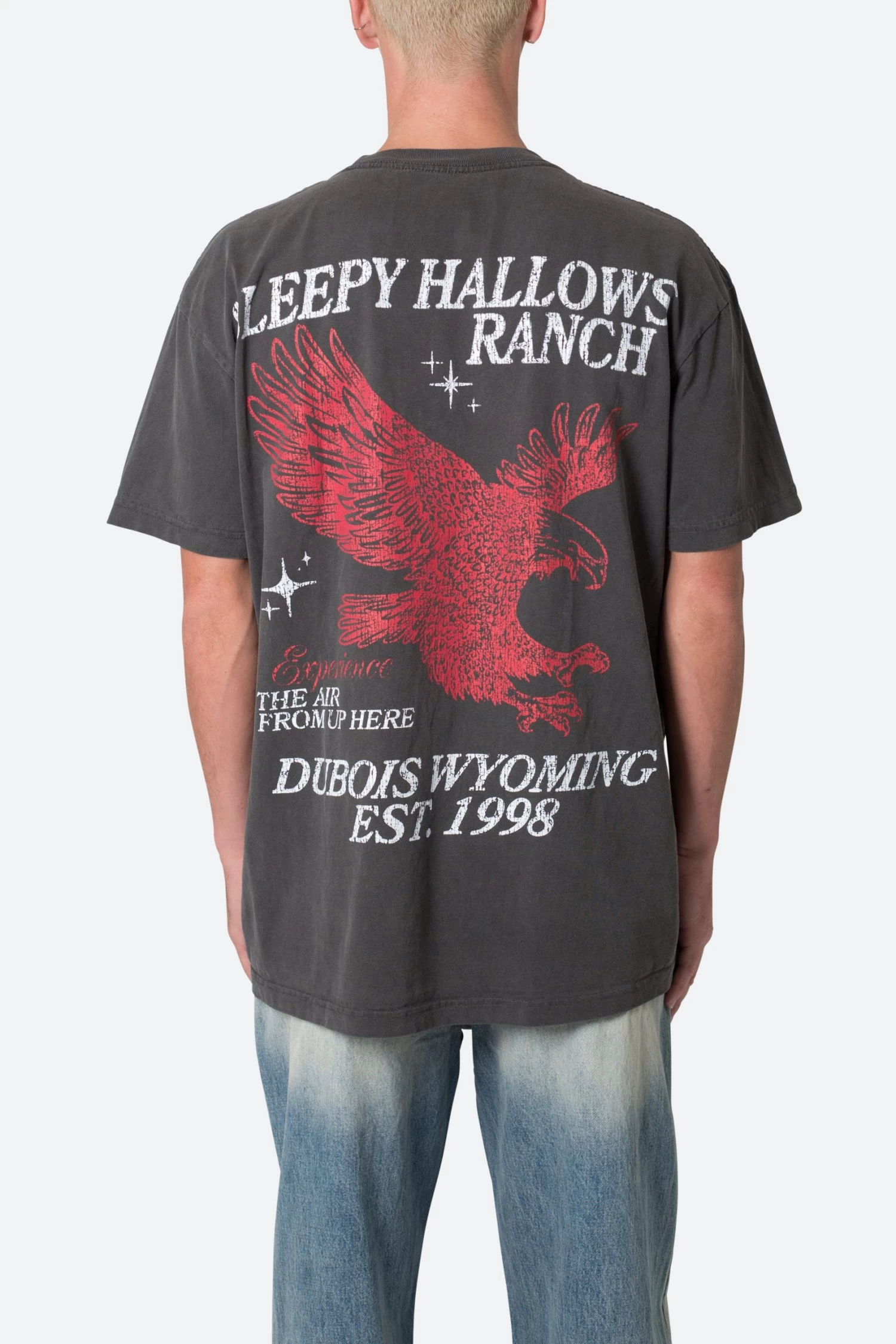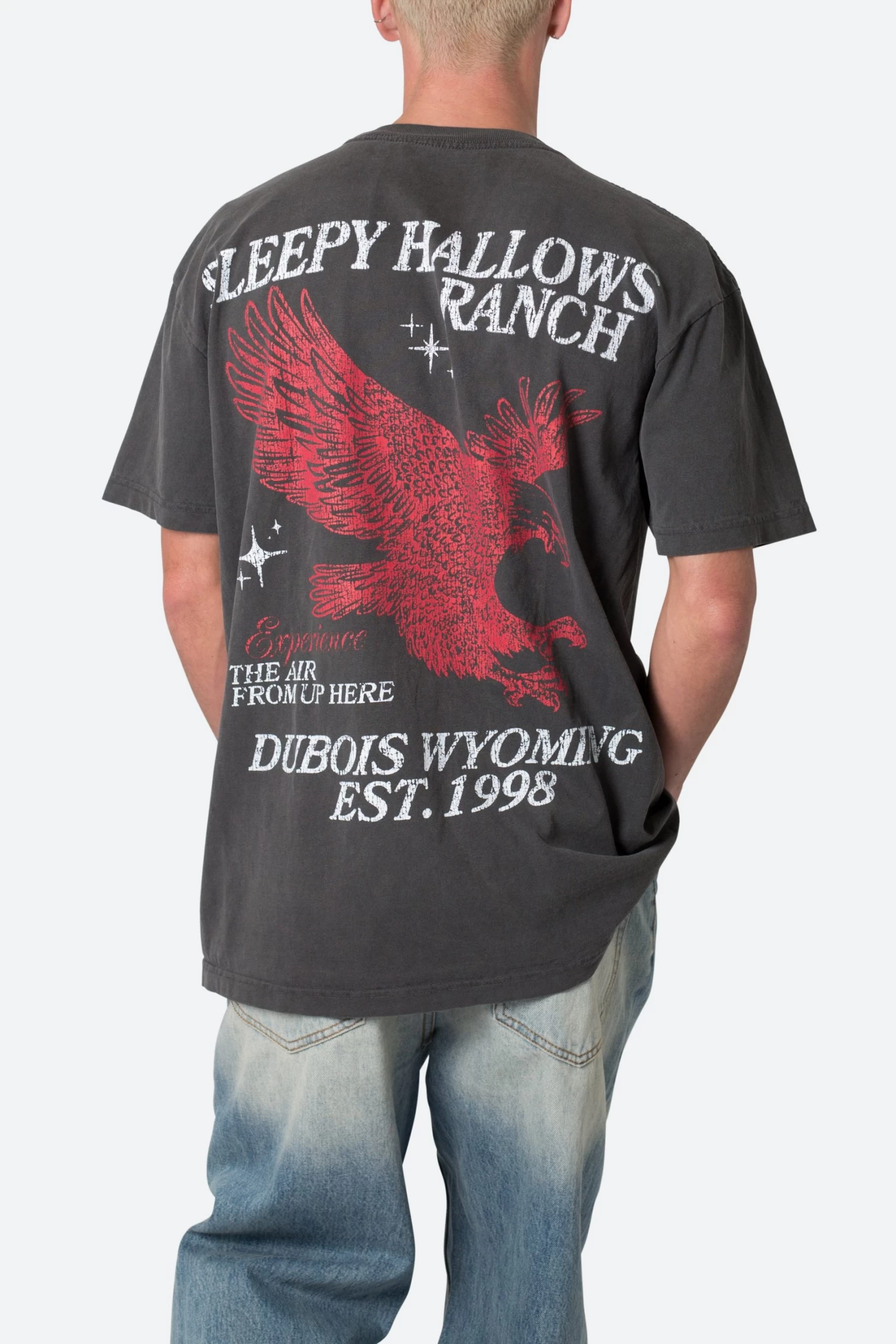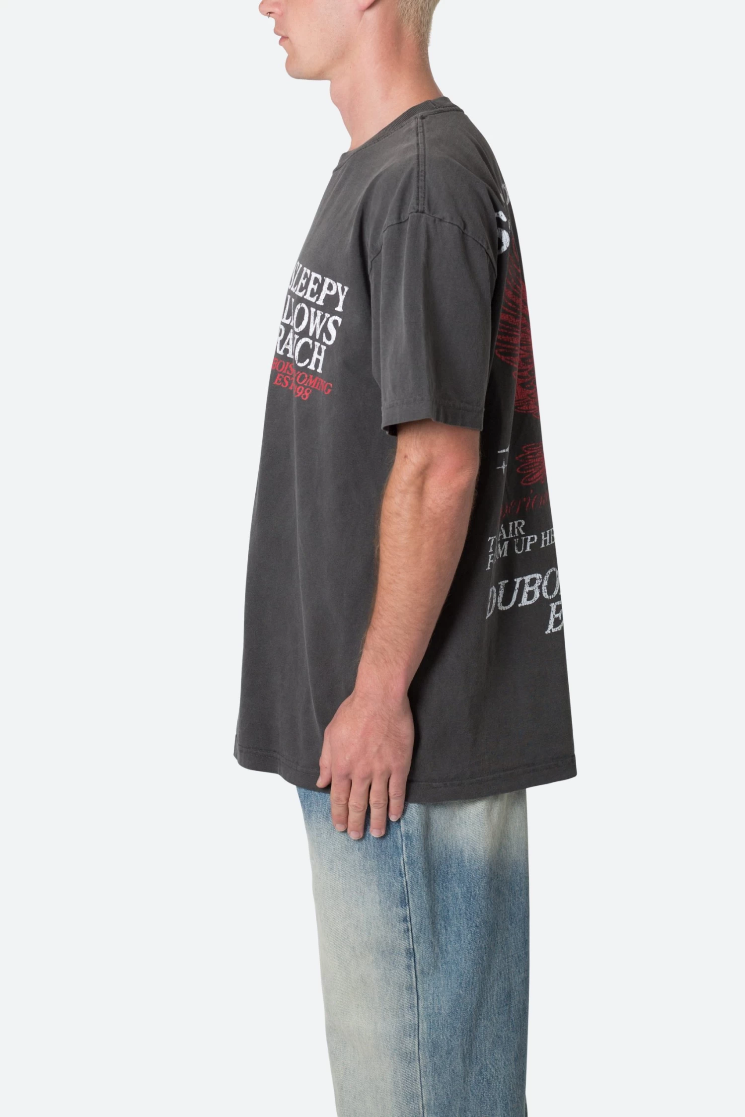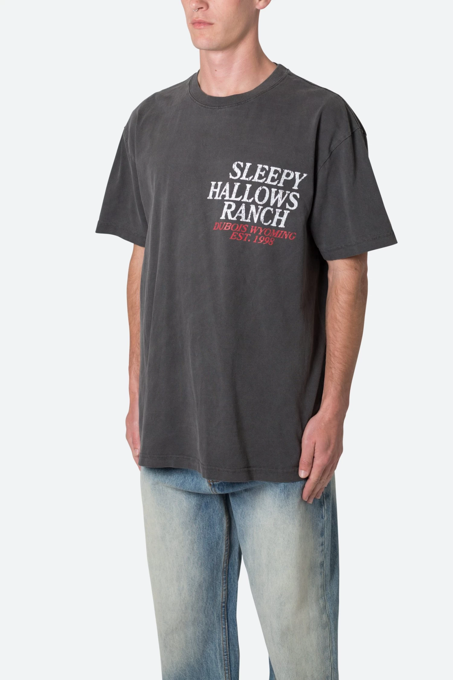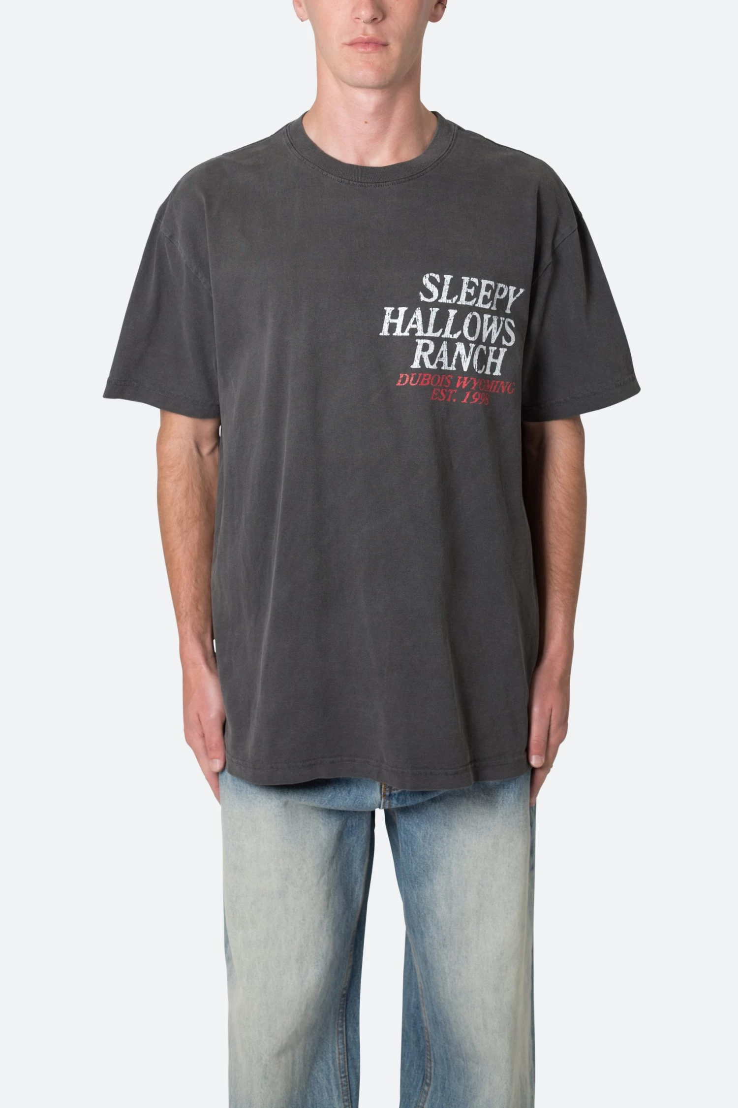 The Sleepy Hallows Tee is printed and washed in the USA. The tee features a relaxed and boxy fit, ribbing at the neck, a standard hem, printed graphics on the front and back, and finished with a custom developed wash for a vintage like hand-feel and color.