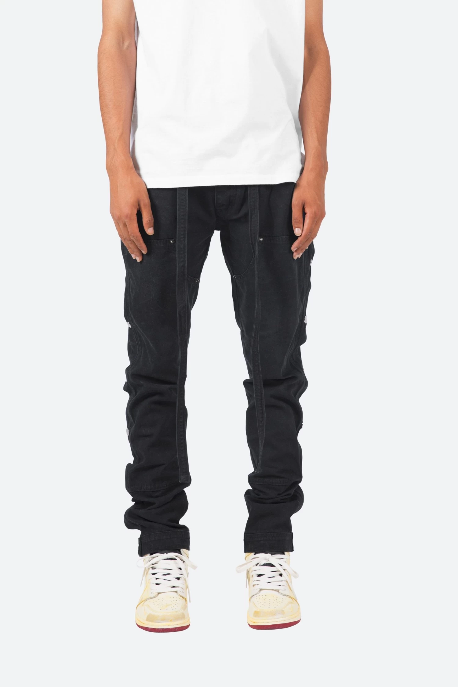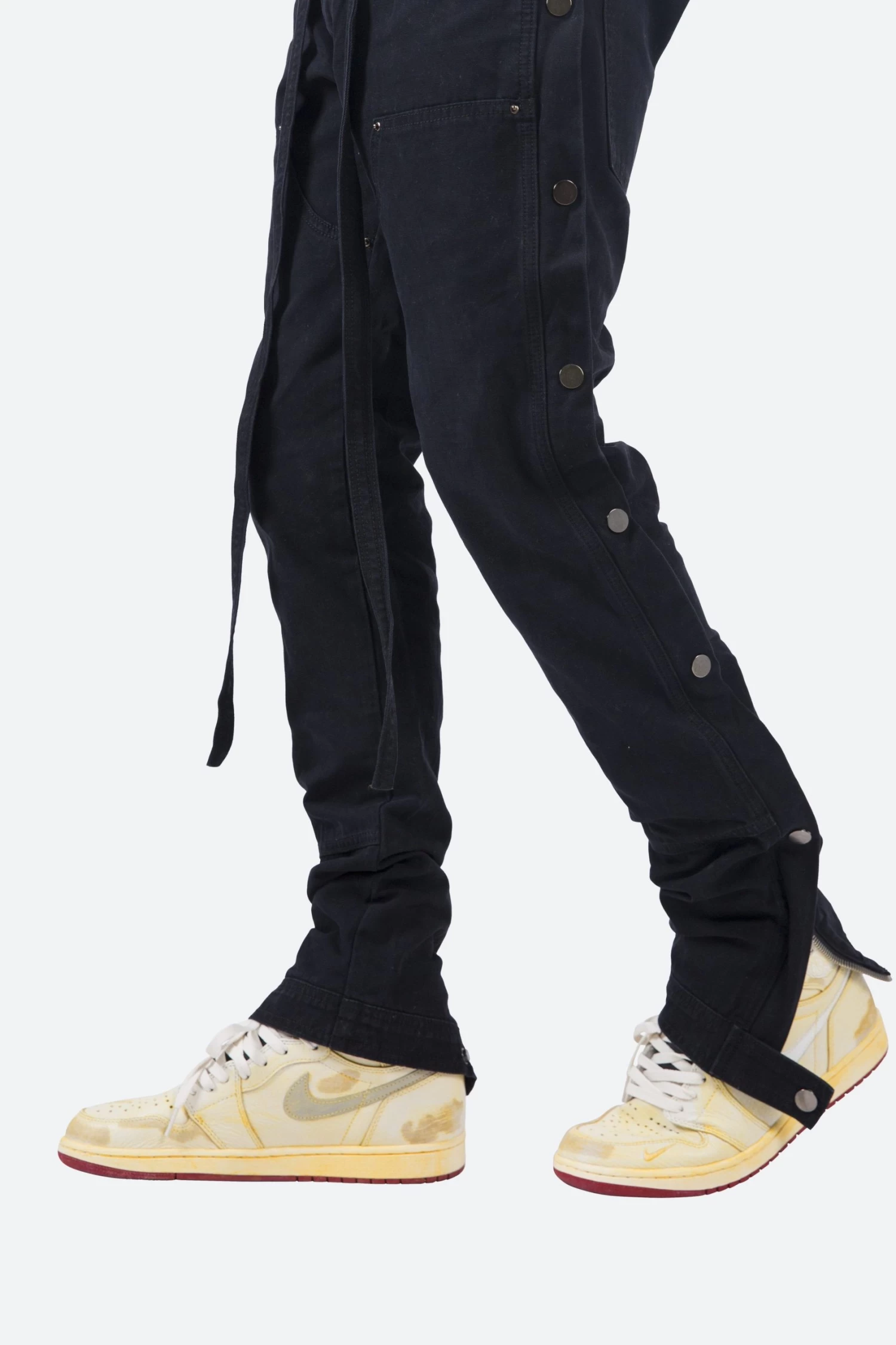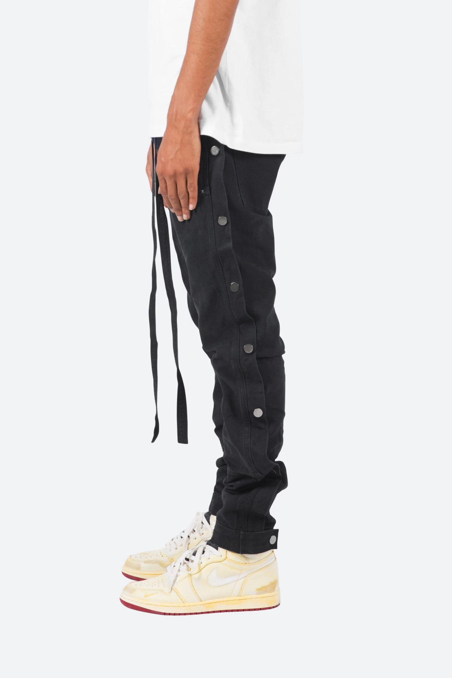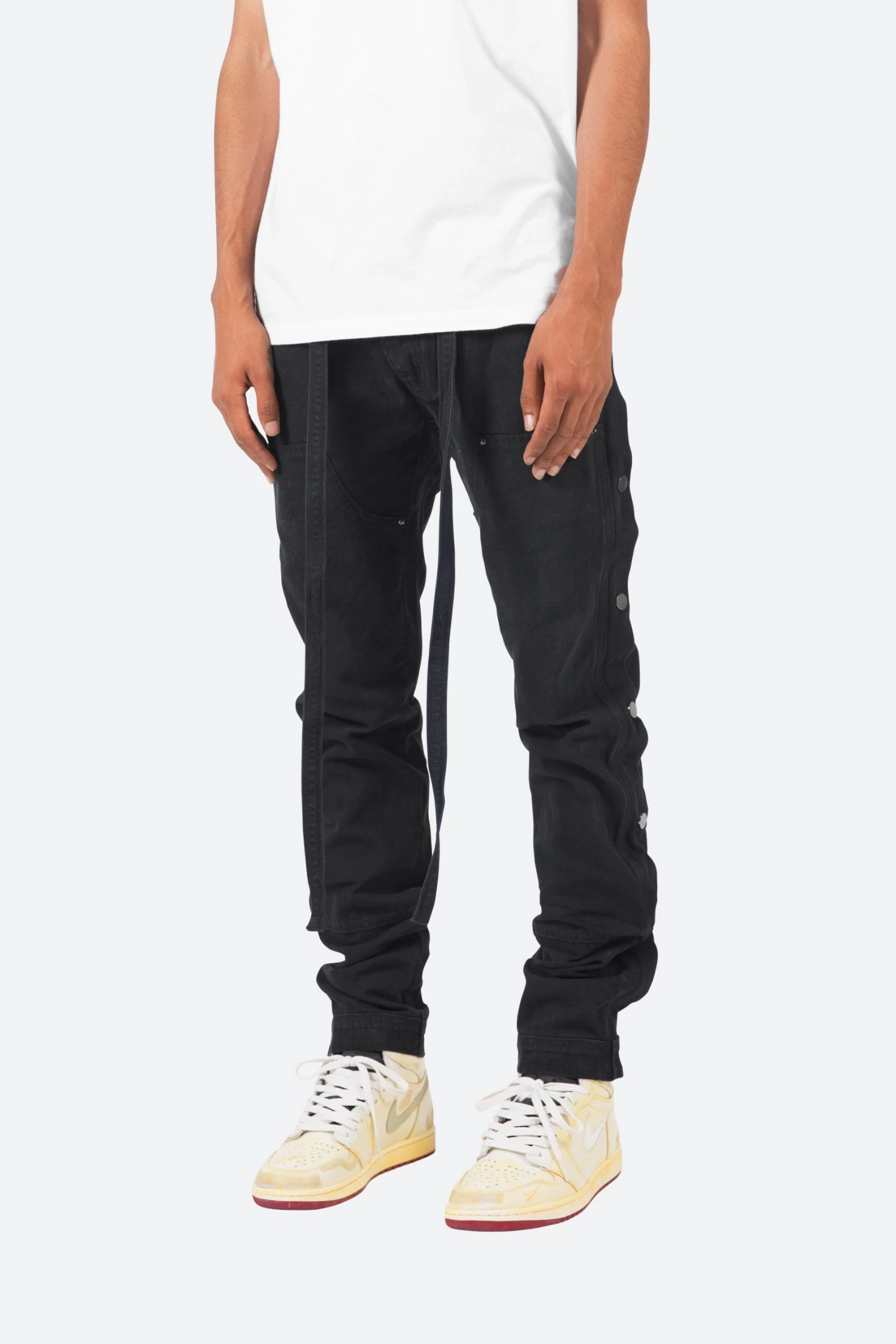 the Snap Western Pants are designed with a relaxed fit throughout, self-fabric paneling on the front with rivets, snap closures on the outseam with a 10″ zipper underneath, and finished with a built in belt made of self material.