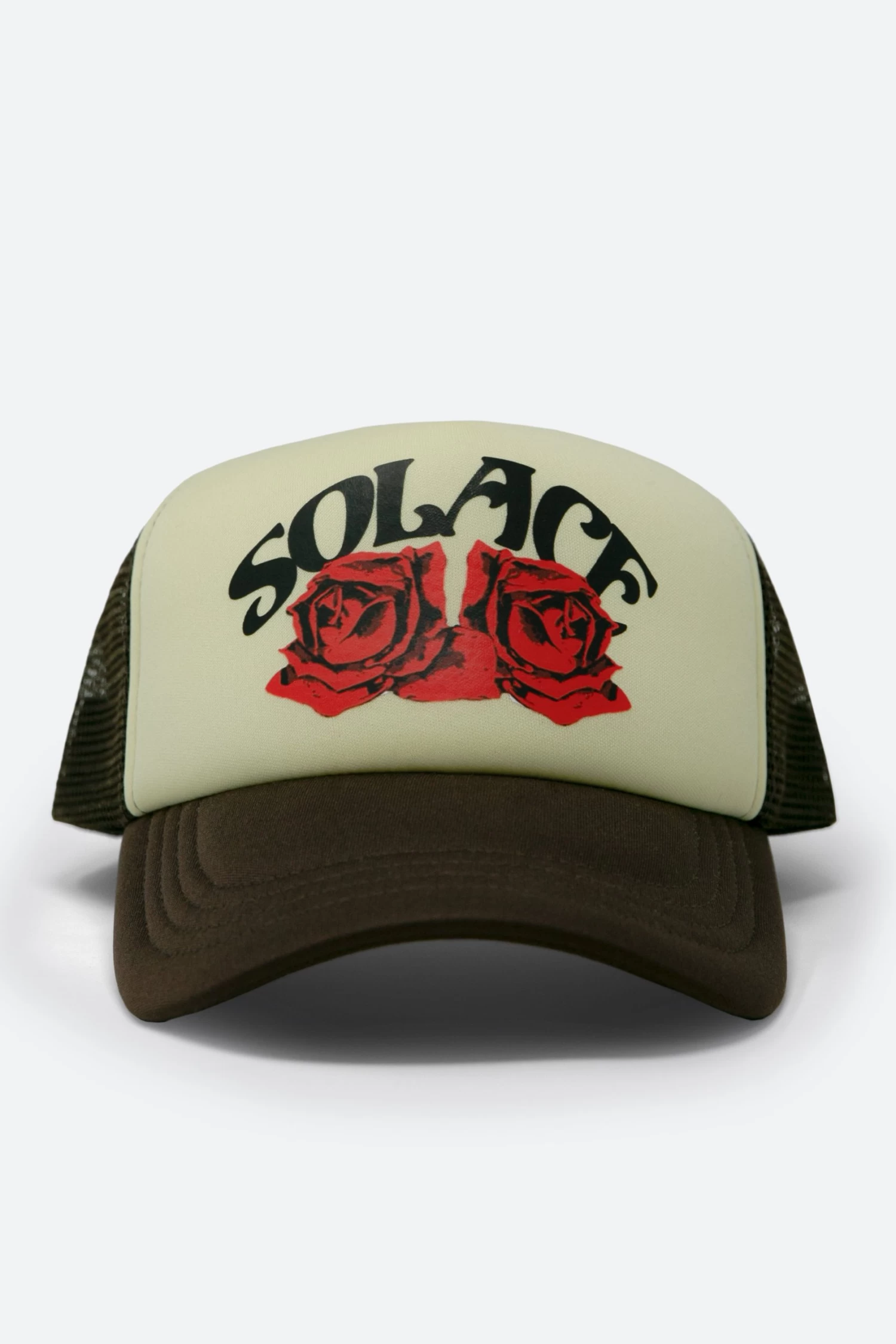 the Solace Trucker Cap is constructed from a contrasting neoprene front panel, tonal neoprene brim, mesh back, and finished with a multi colored screen print at the front.