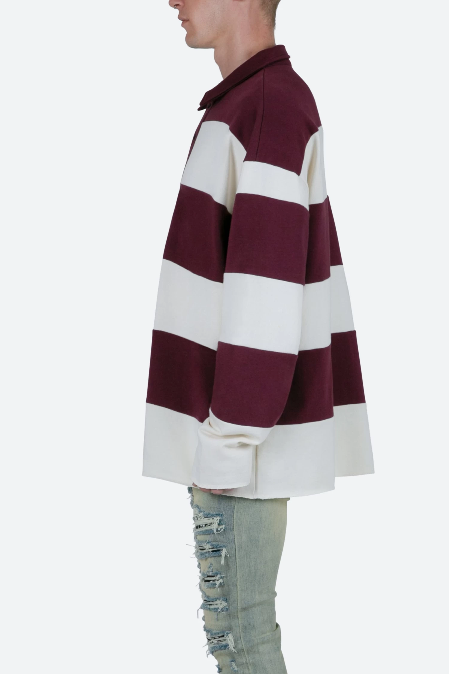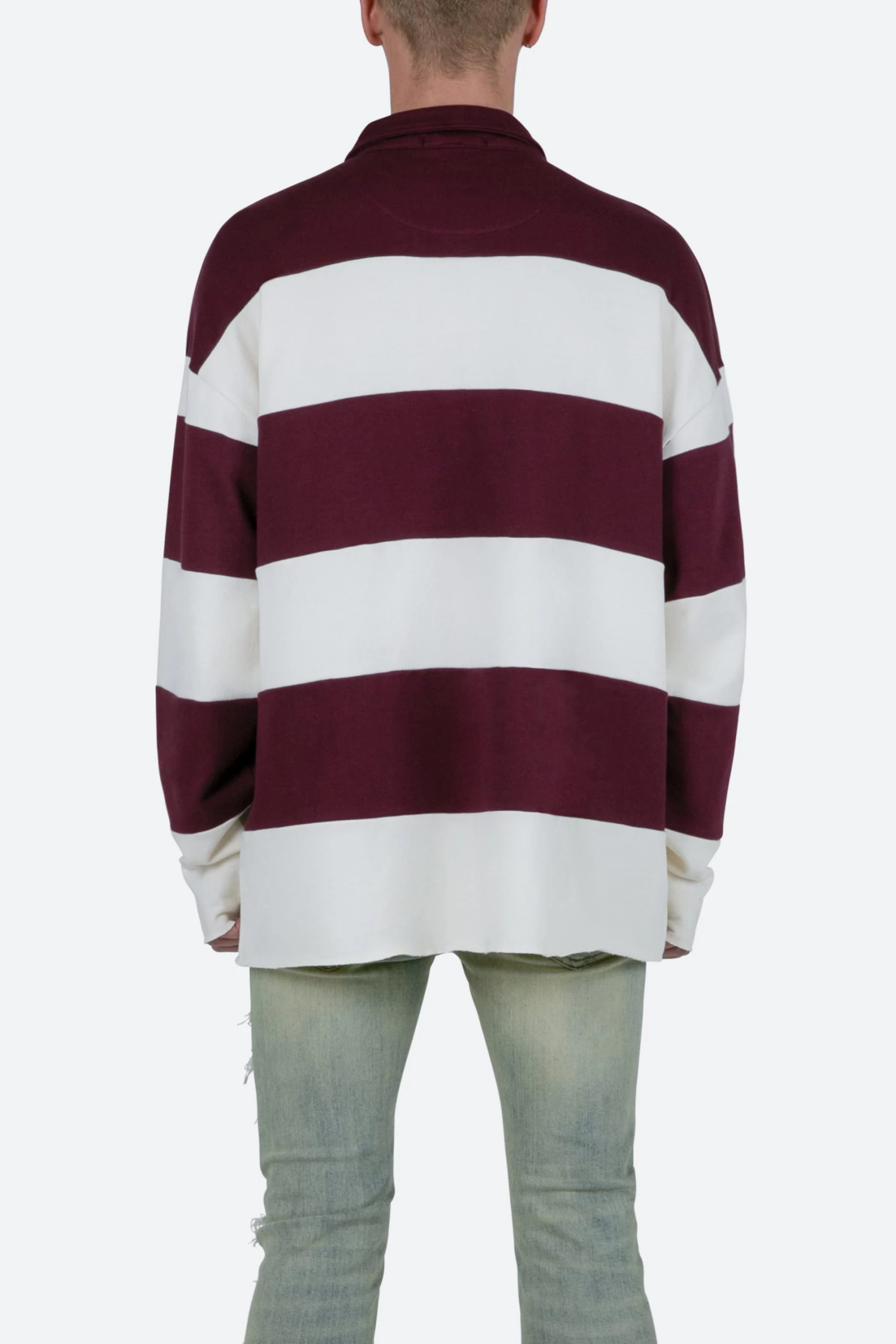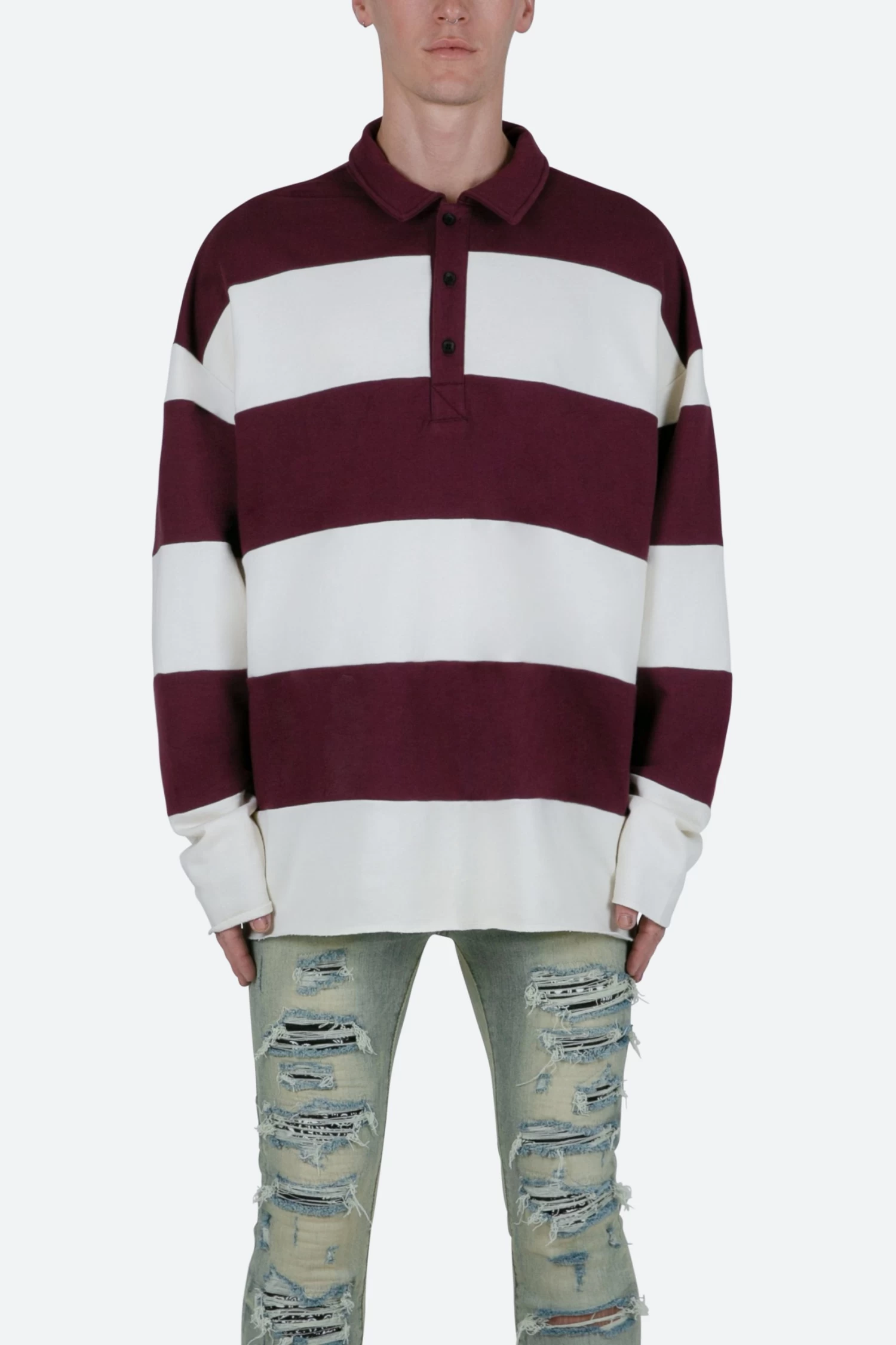 the Stiped L/S Rugby Shirt is made from 100% lightweight cotton terry, featuring ribbing at the wrist, contrasting panels throughout, contrasting collar and placket, and is finished in an oversized fit with a dropped shoulder design.