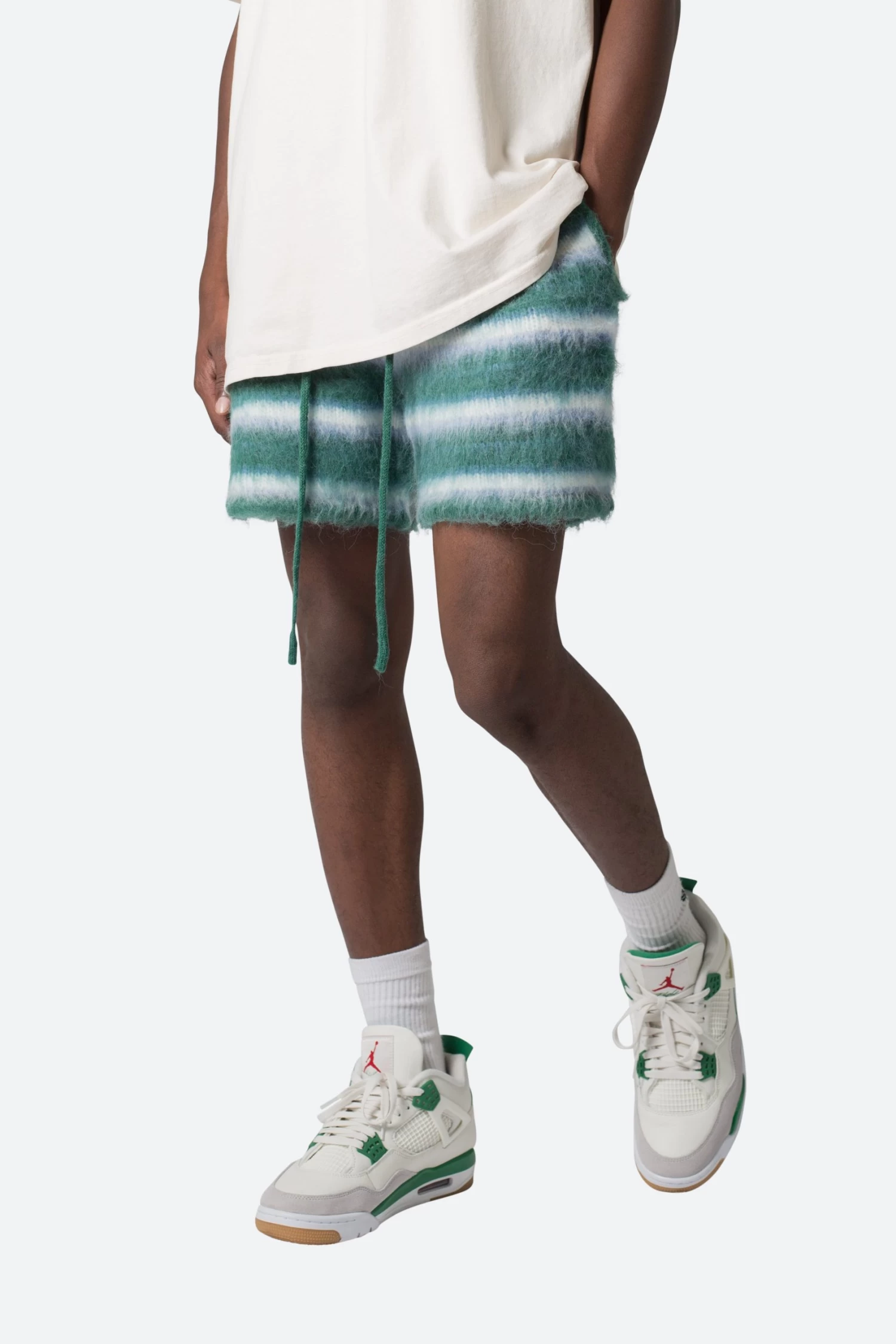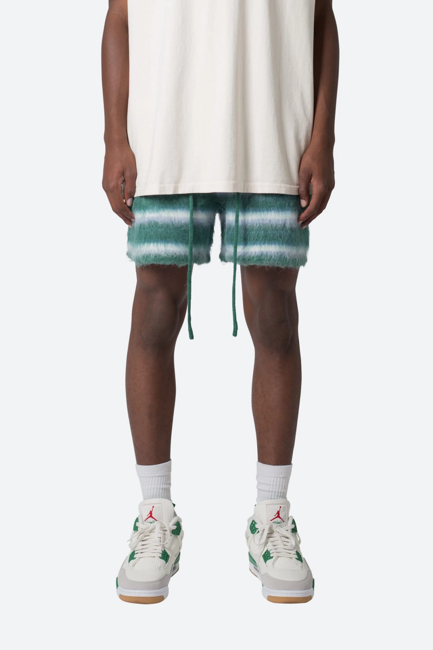 the Striped Mohair Shorts are constructed from a brushed mohair sweater knit fabric. The shorts feature an elasticized waist, welt pockets at the outseam and back, a jacquard striped pattern, and finished with a drawcord.