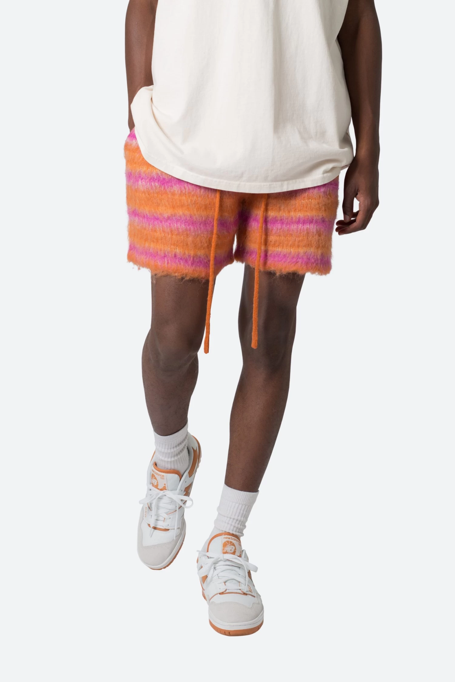 the Striped Mohair Shorts are constructed from a brushed mohair sweater knit fabric. The shorts feature an elasticized waist, welt pockets at the outseam and back, a jacquard striped pattern, and finished with a drawcord.