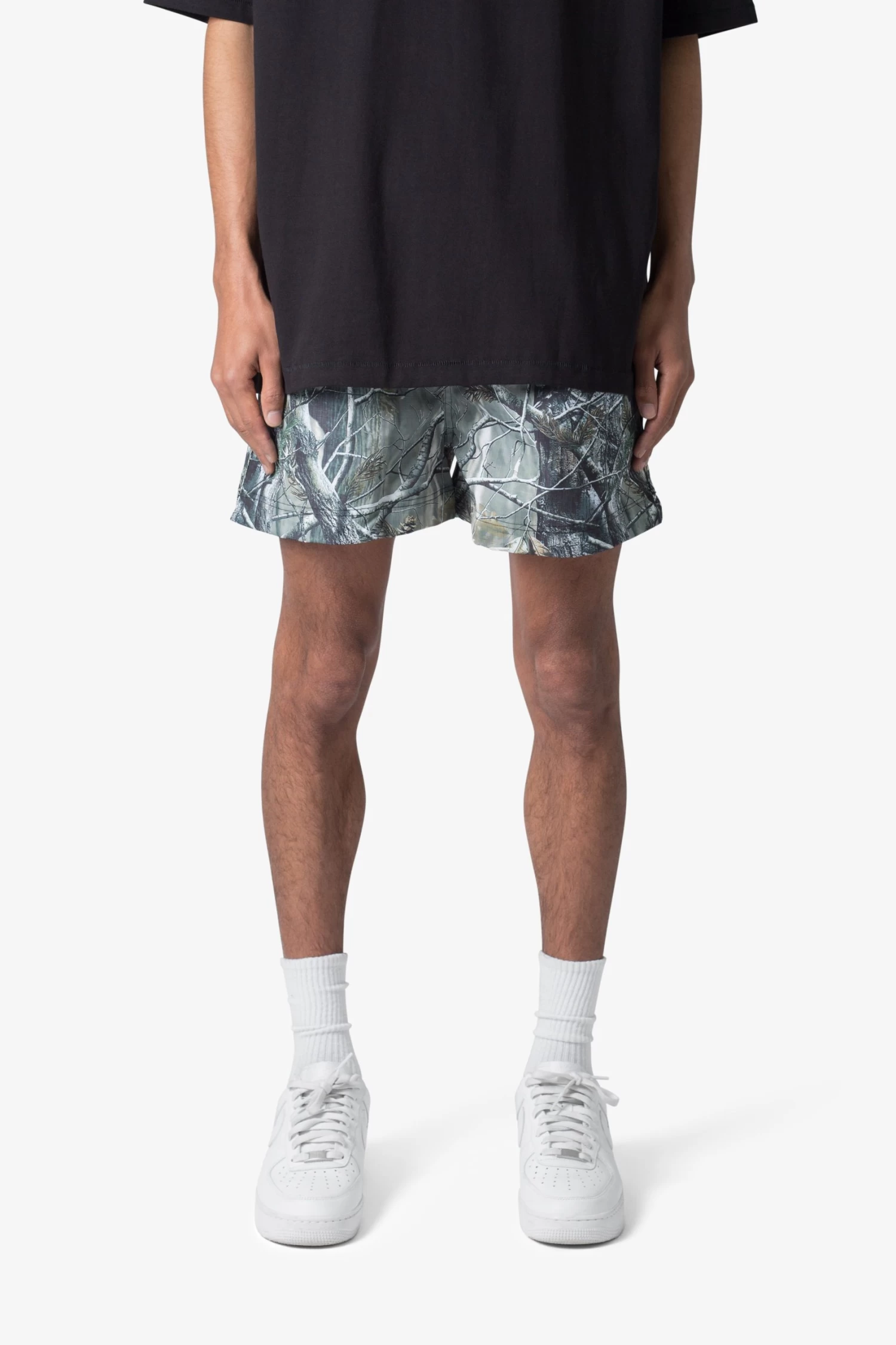 the Summer Shorts are constructed with a polyester fabric in a relaxed fit. The shorts feature an elasticized waist, welt pockets, all-over print hunter camo pattern, and finished with a contrasting orange drawcord with a metal aglets.