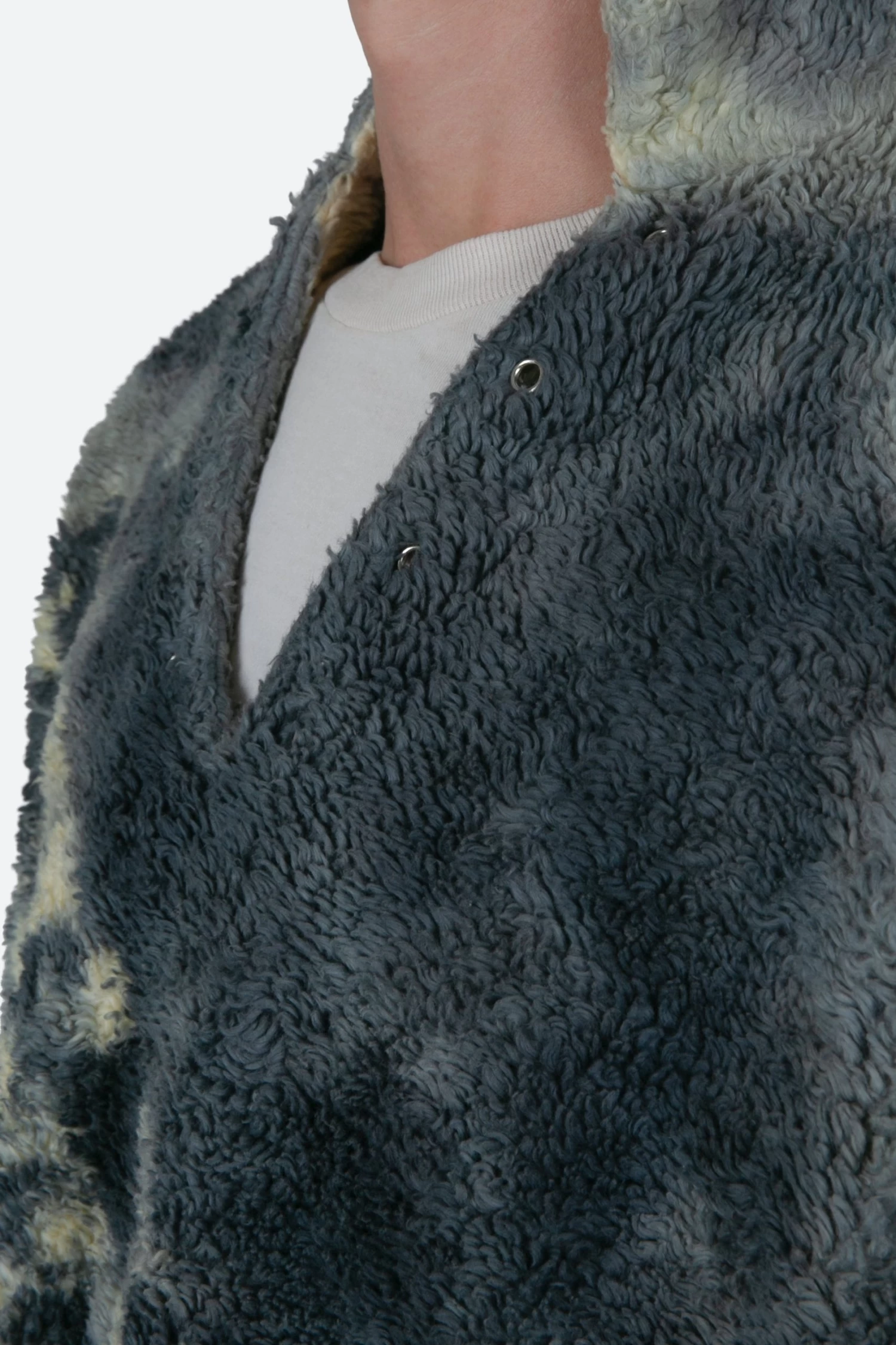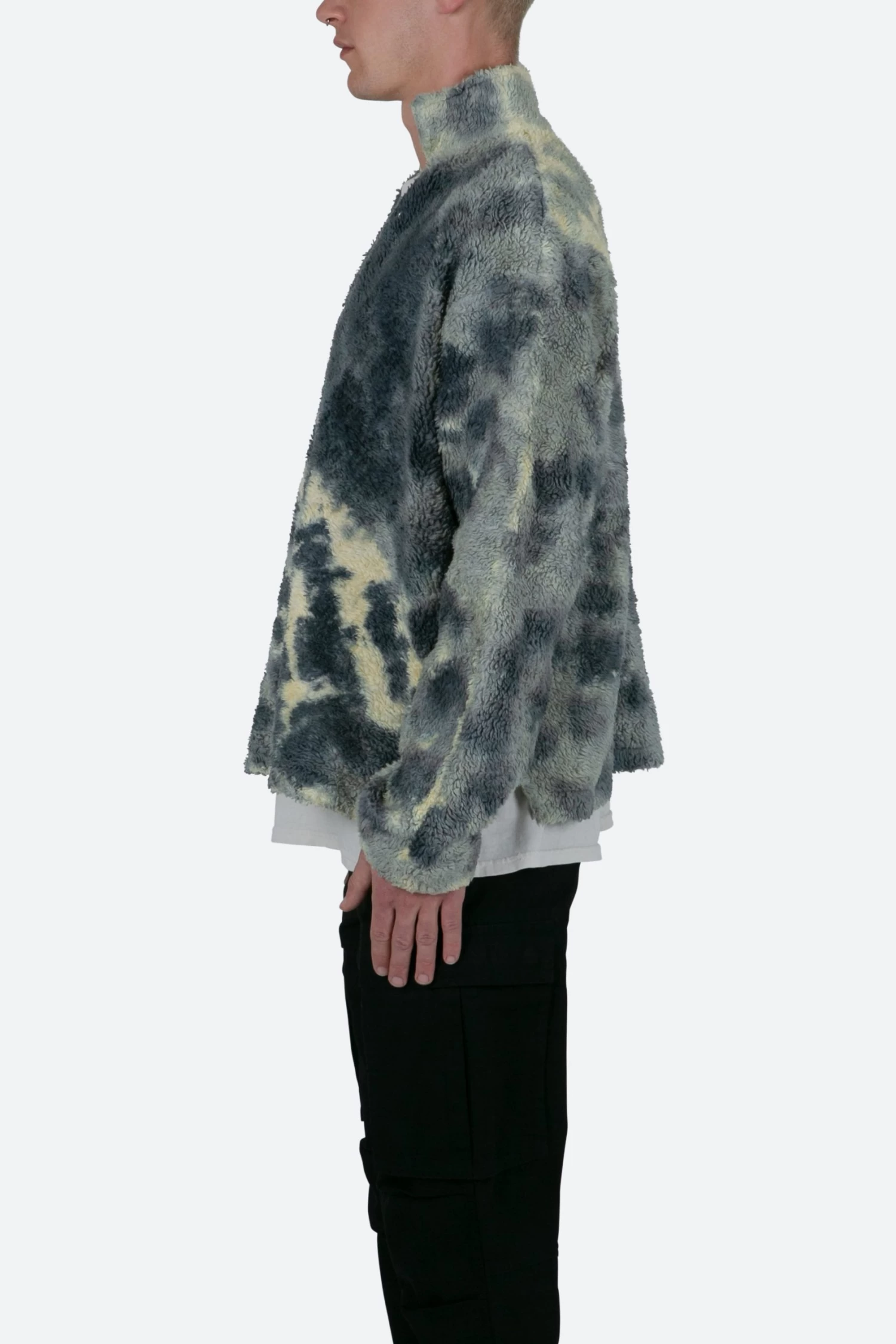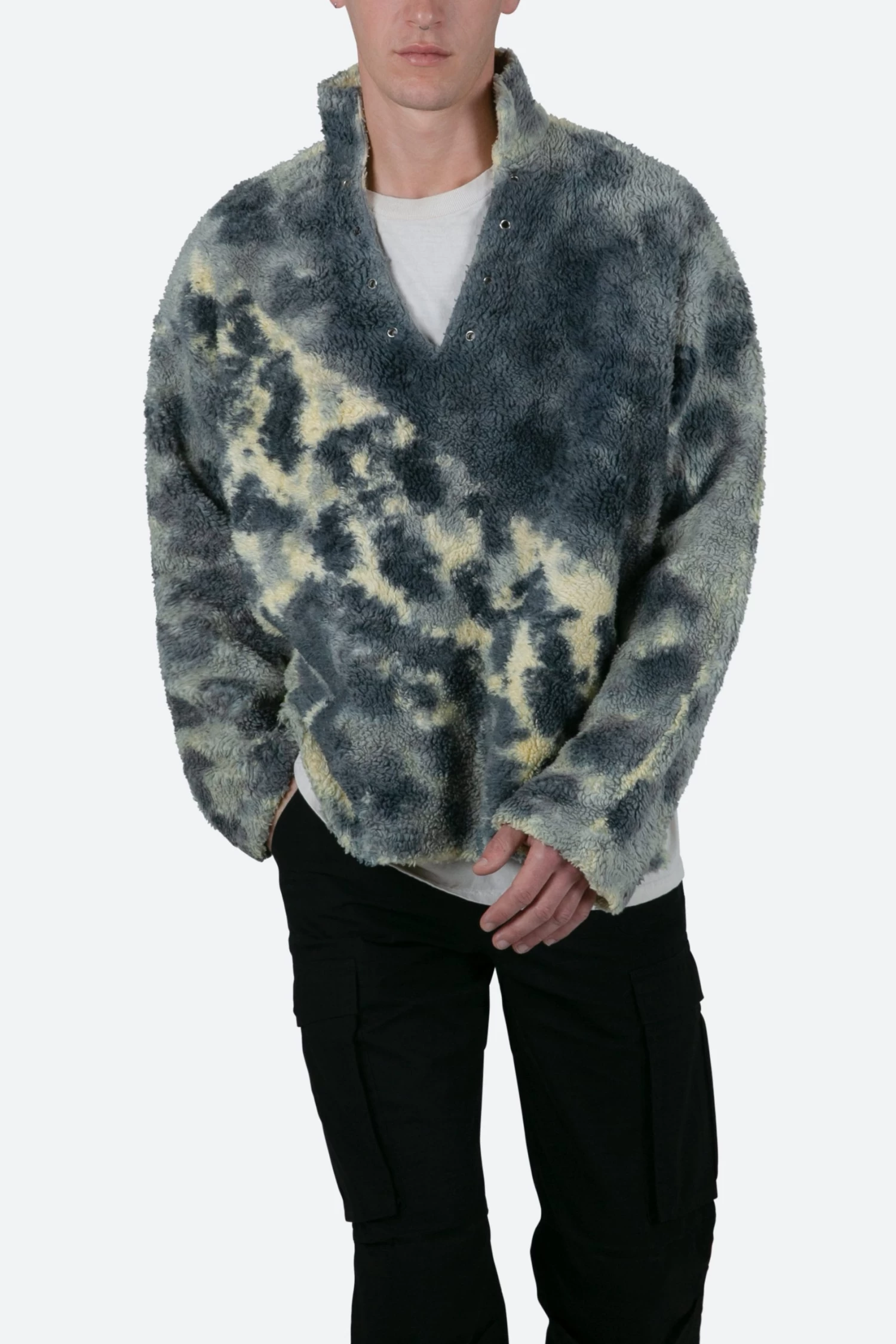 the Tie Dye Sherpa Pullover is designed with a relaxed fit, an open placket, standing collar, and constructed from a custom dyed sherpa fabric.