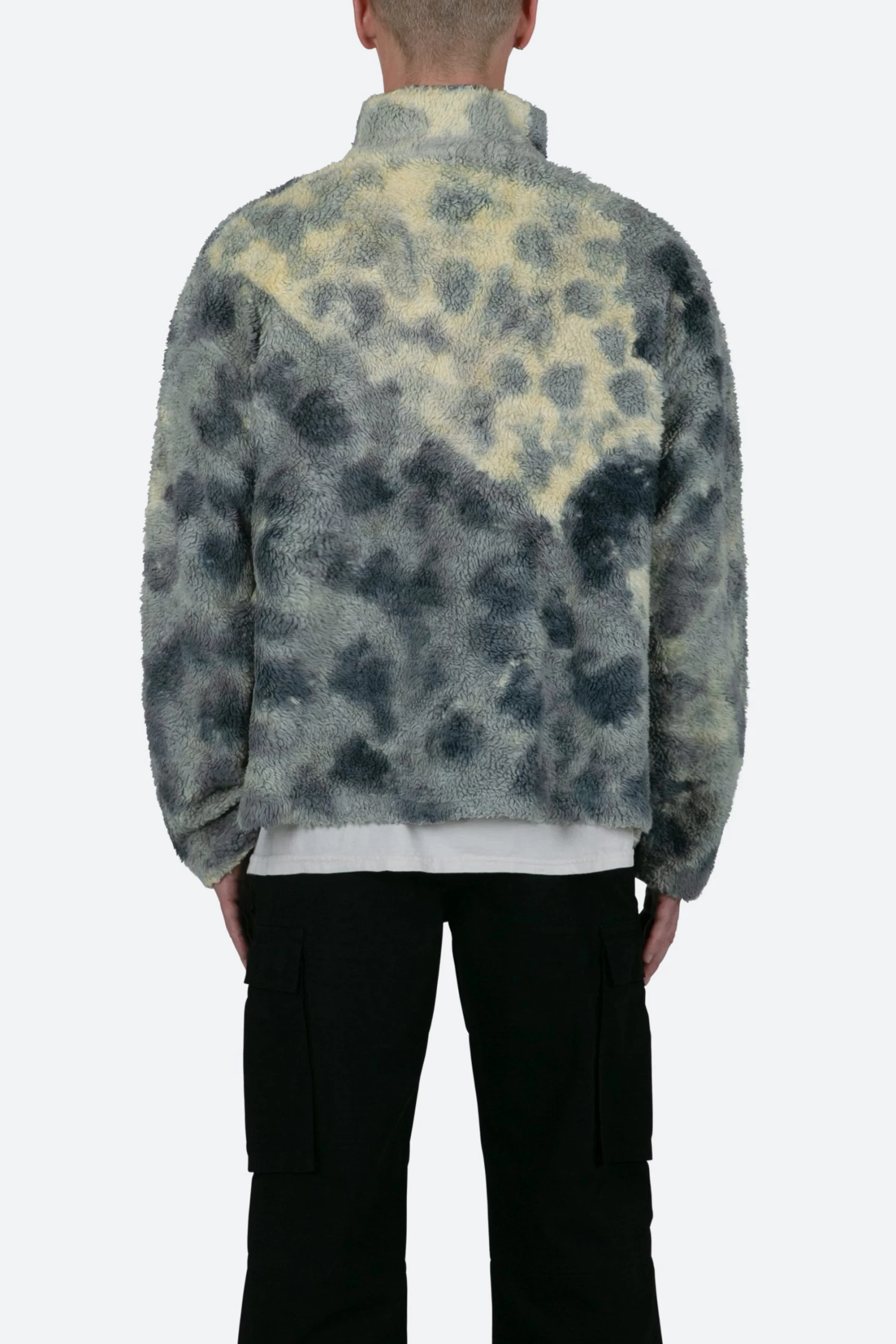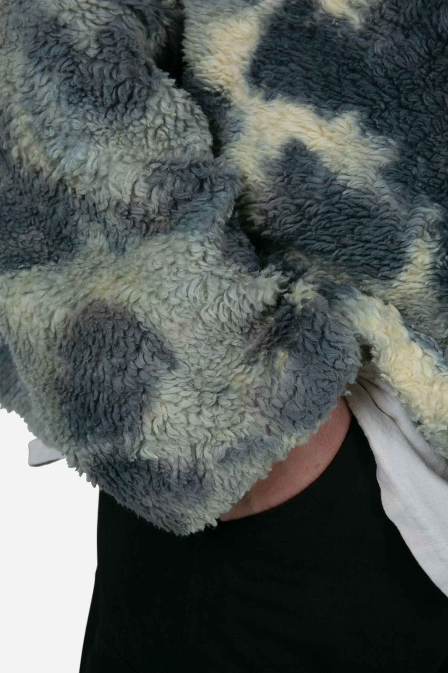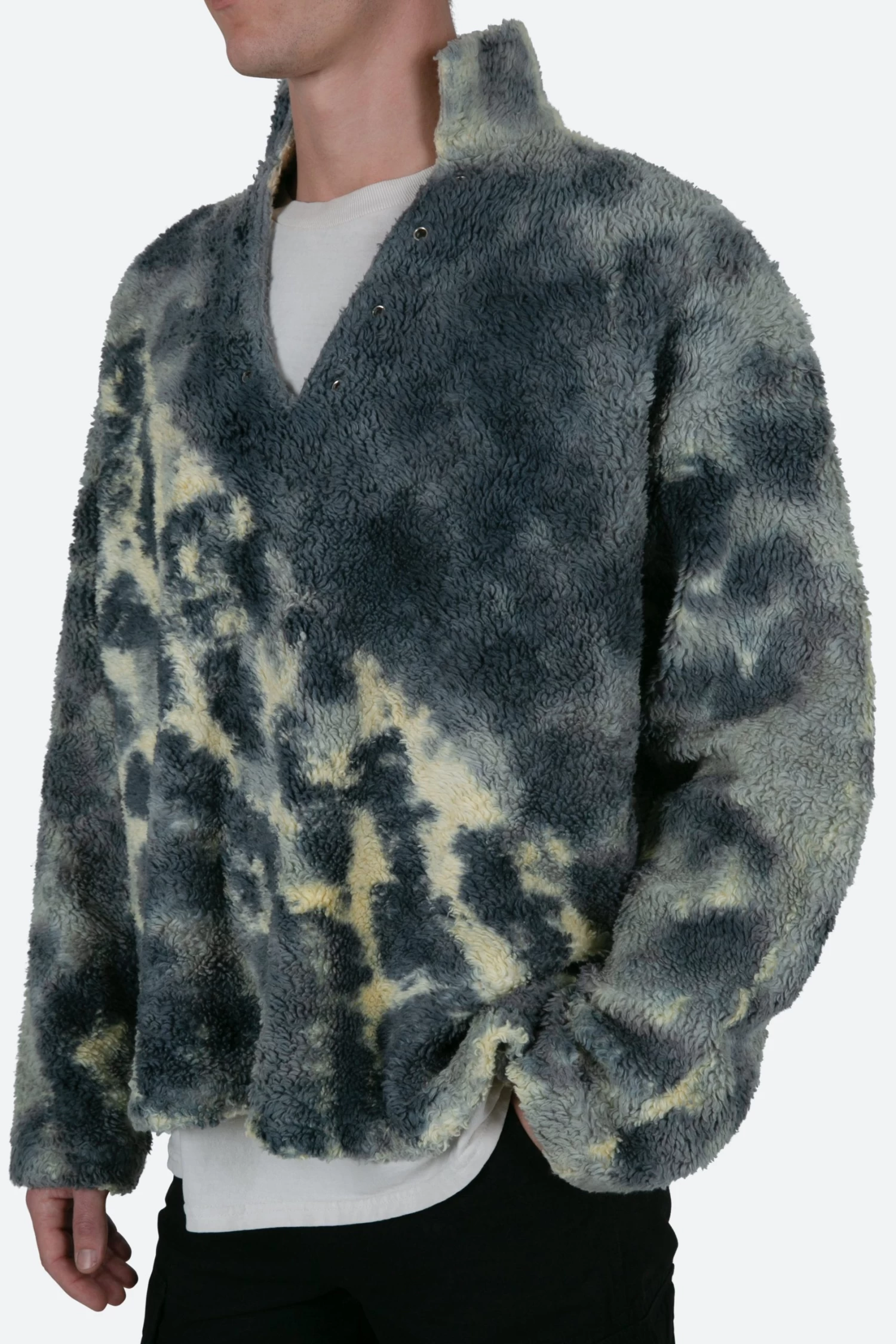 the Tie Dye Sherpa Pullover is designed with a relaxed fit, an open placket, standing collar, and constructed from a custom dyed sherpa fabric.