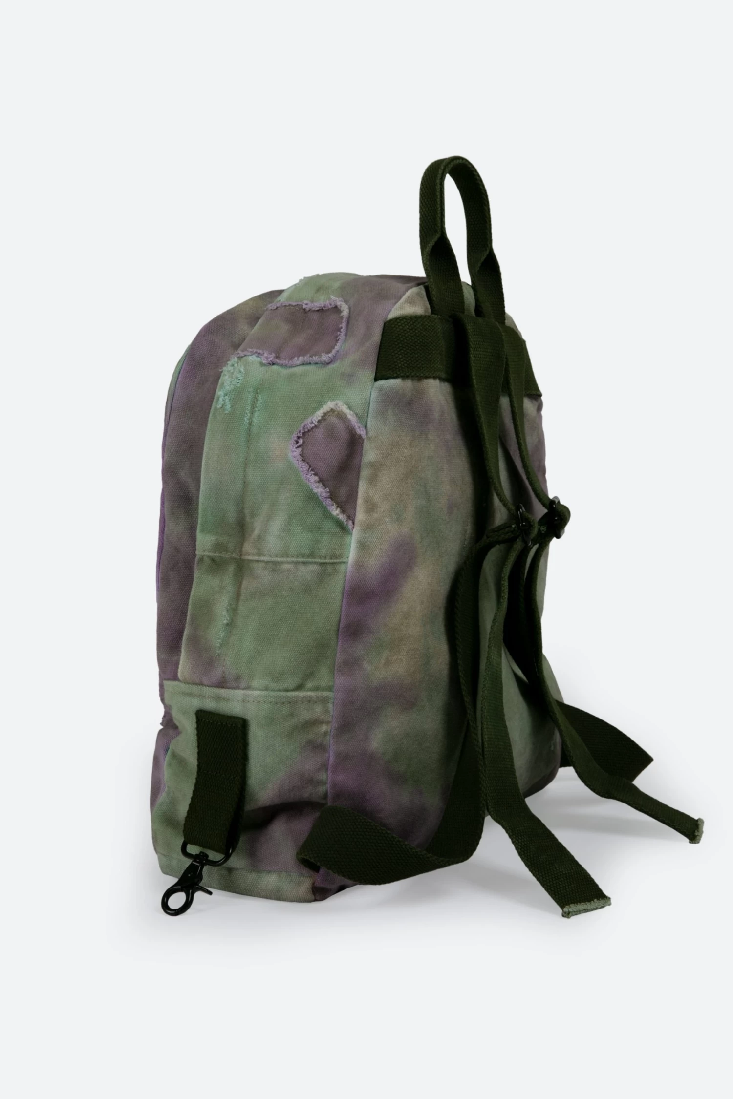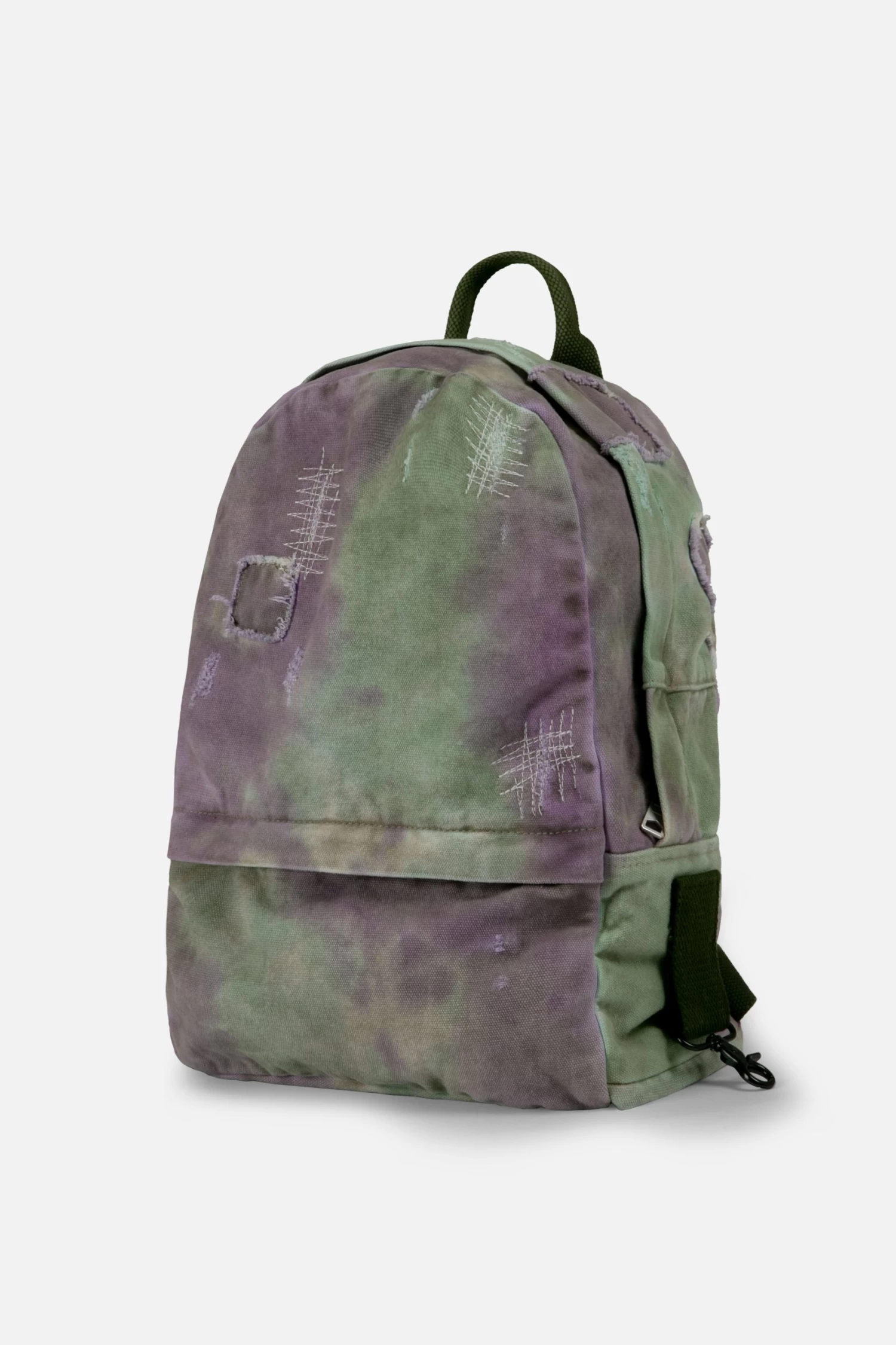 the Tie Dyed Backpack is constructed from cotton fabric shell and contrasting nylon lining and features one large compartment that is closed with a metal zipper, smaller pocket on the front, straps and reinforcement from an olive cotton webbing, metal clip on the wearer’s right, repairs and stitching details throughout and is finished in a custom tie dye wash.