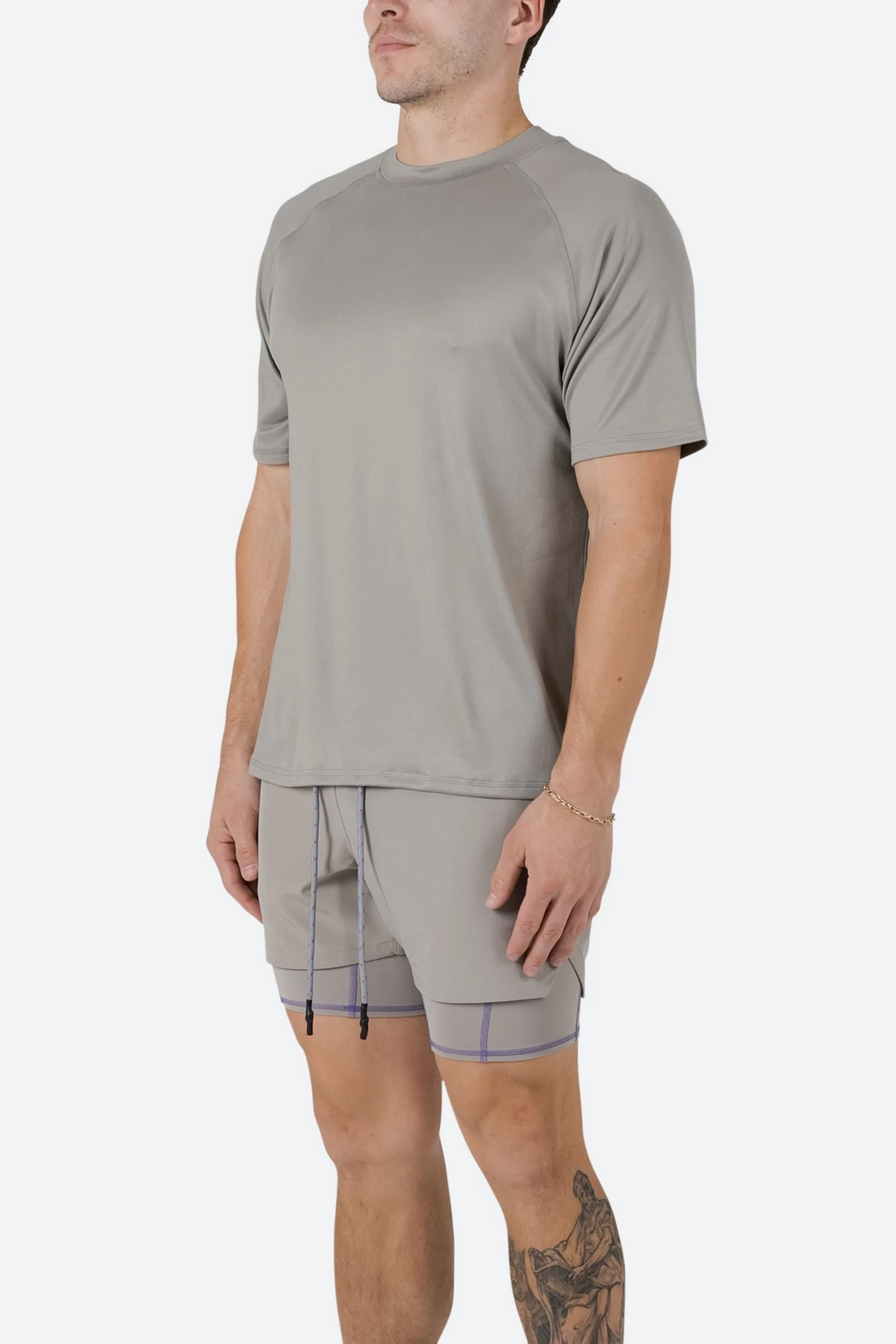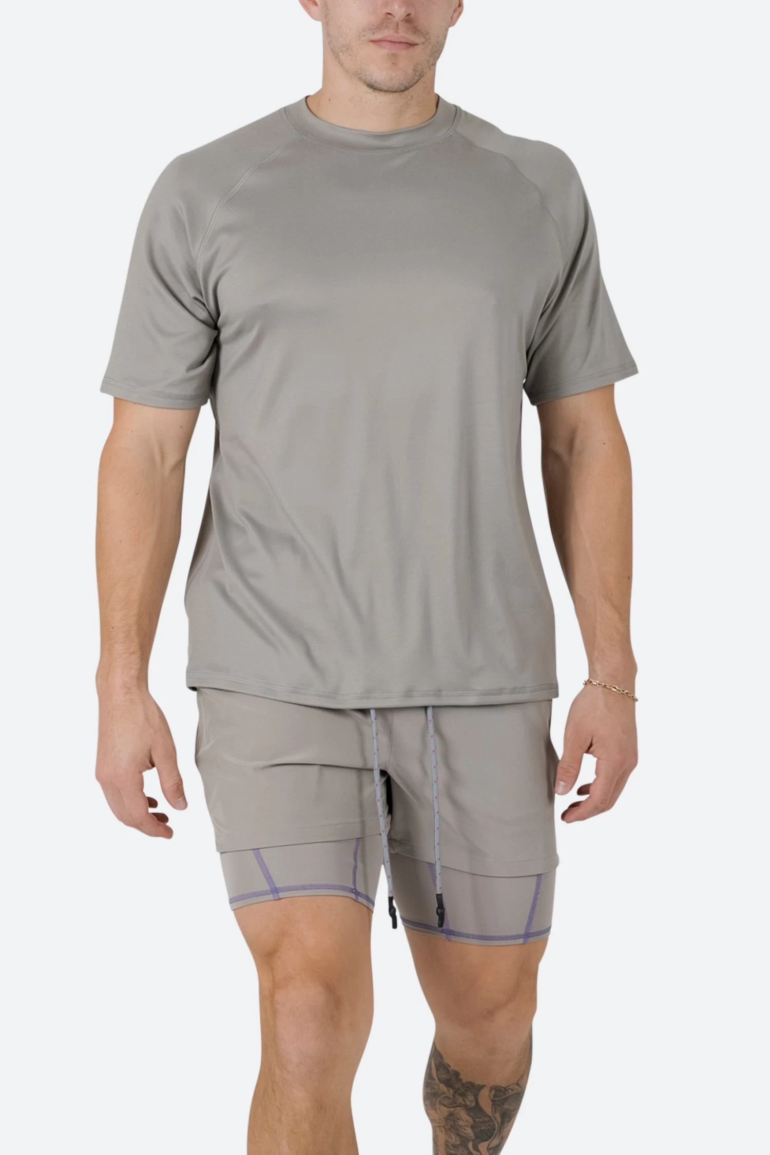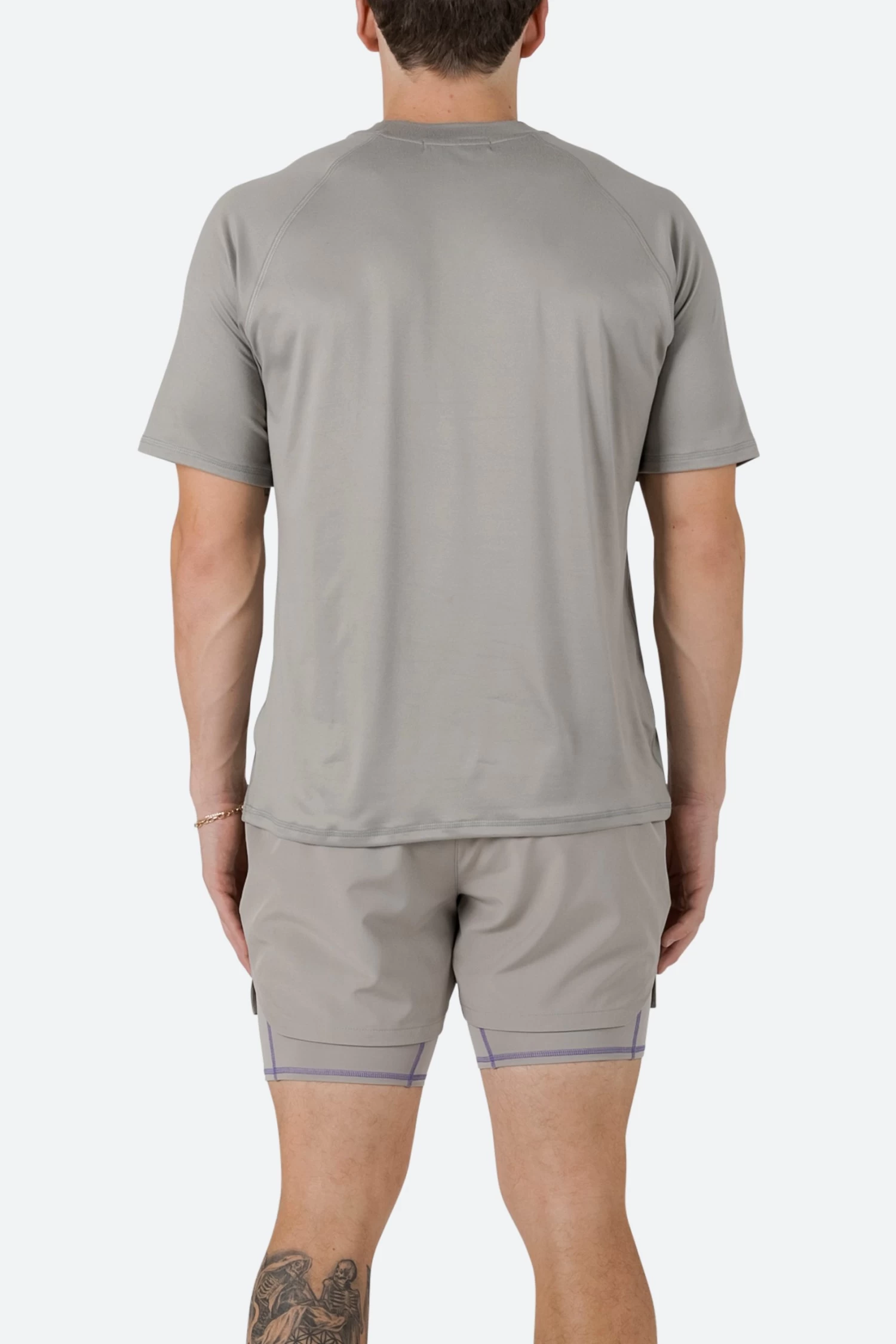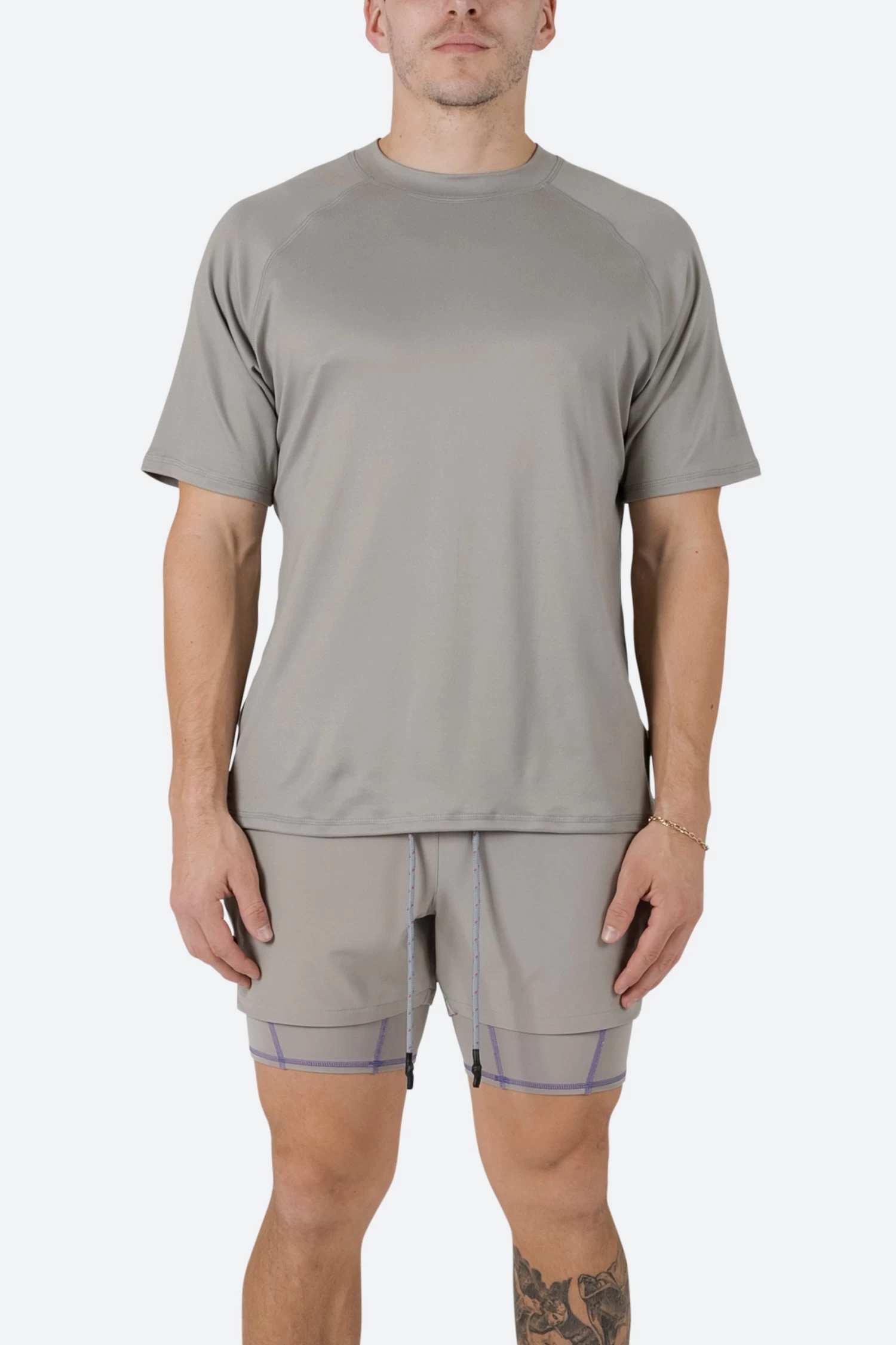 the Training Tee is constructed from a soft touch 4-way stretch fabric in a relaxed fit with a high ribbed neckline and raglan sleeves.