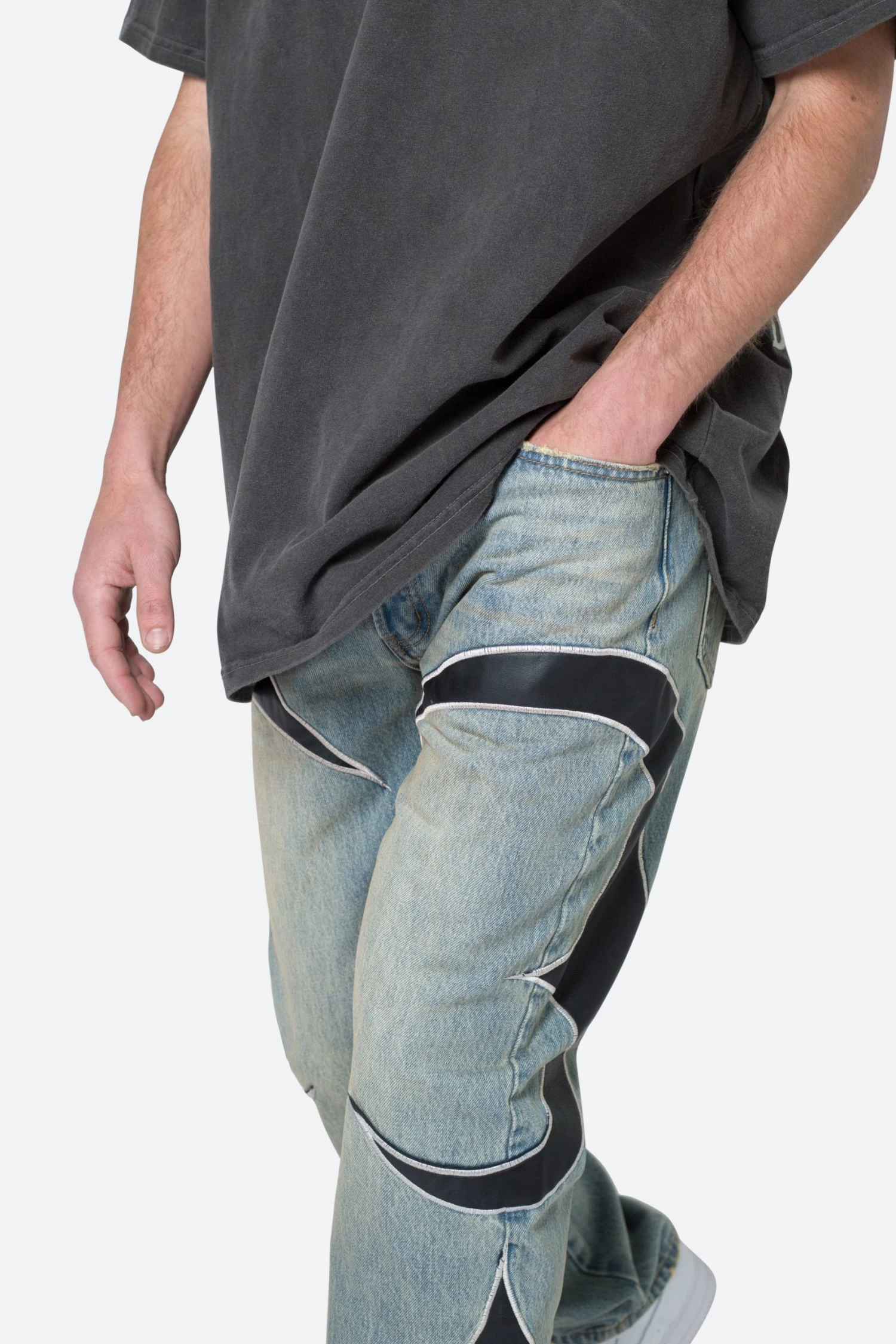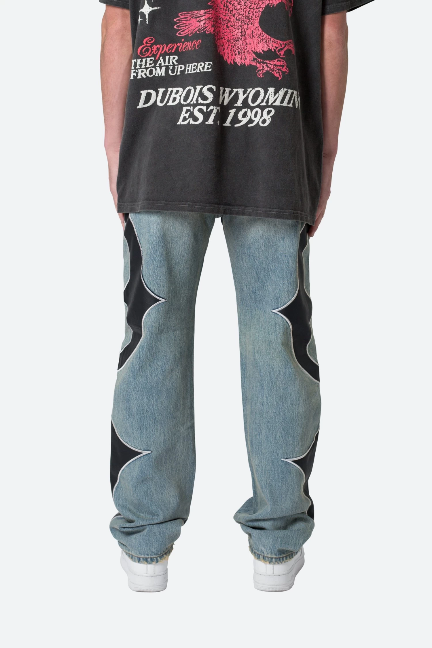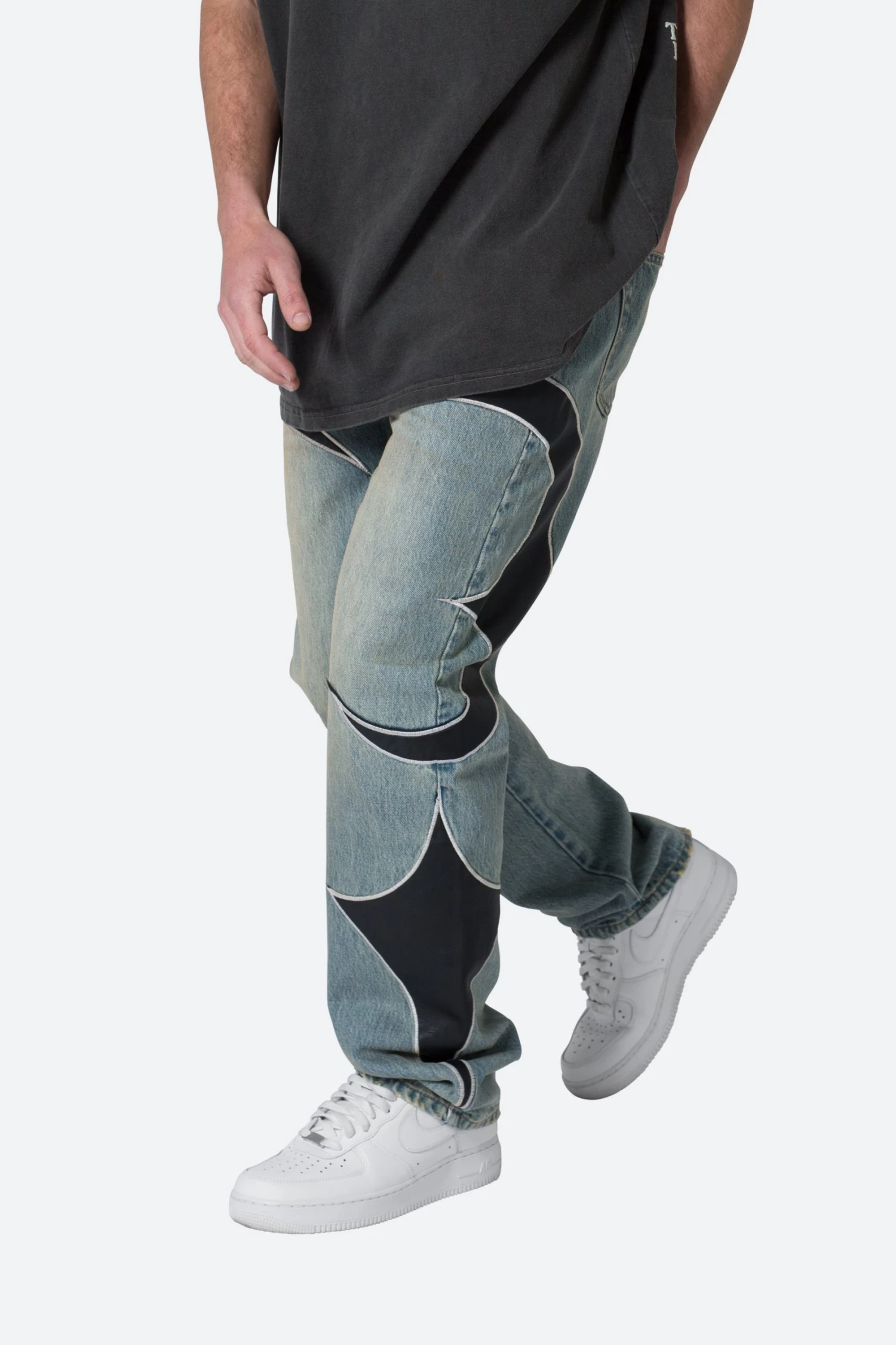 the Tribal Patched Denim is designed with our new V fit which is relaxed throughout and features a medium vintage wash, sanding and whisker details, and finished with contrasting tribal panels throughout
