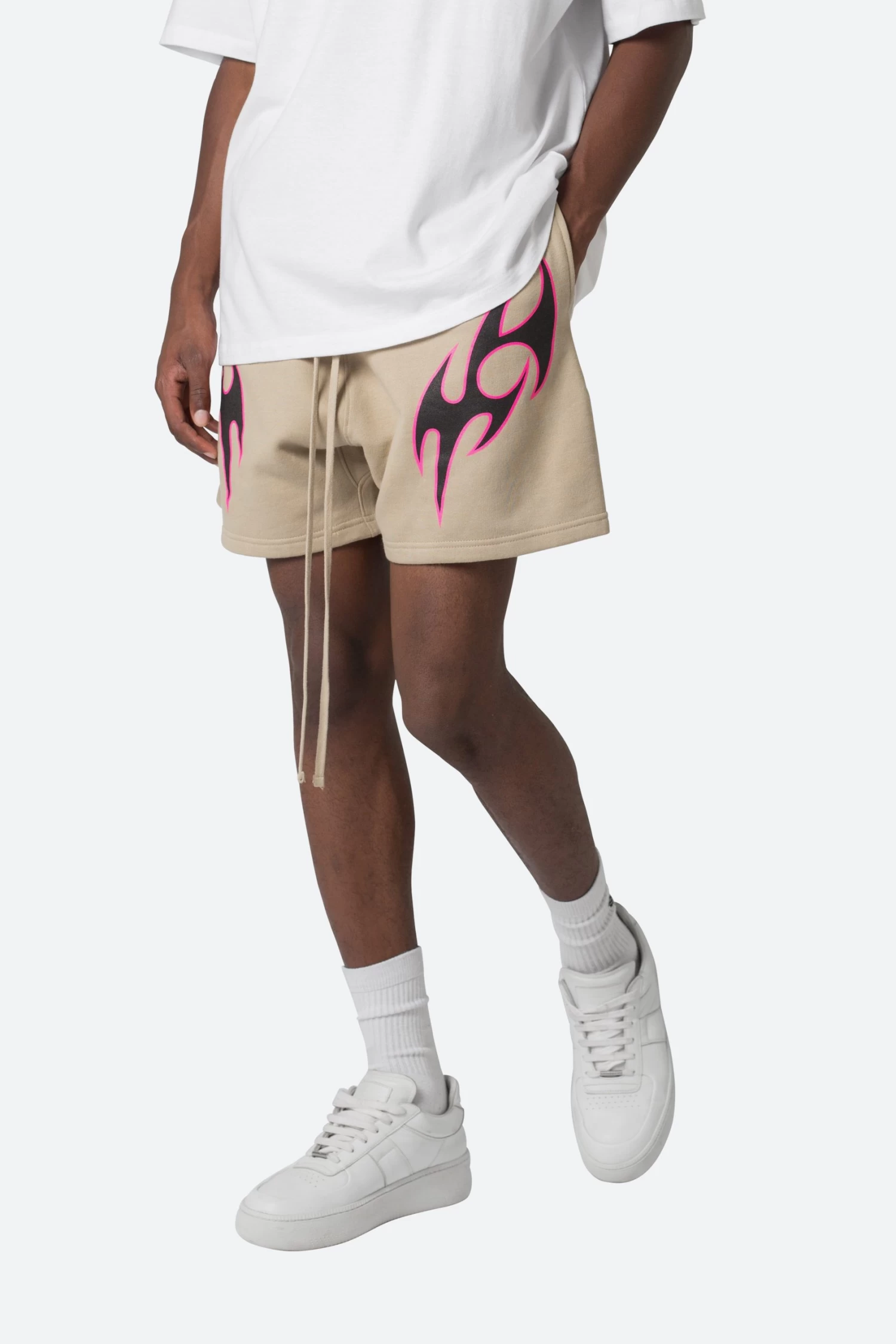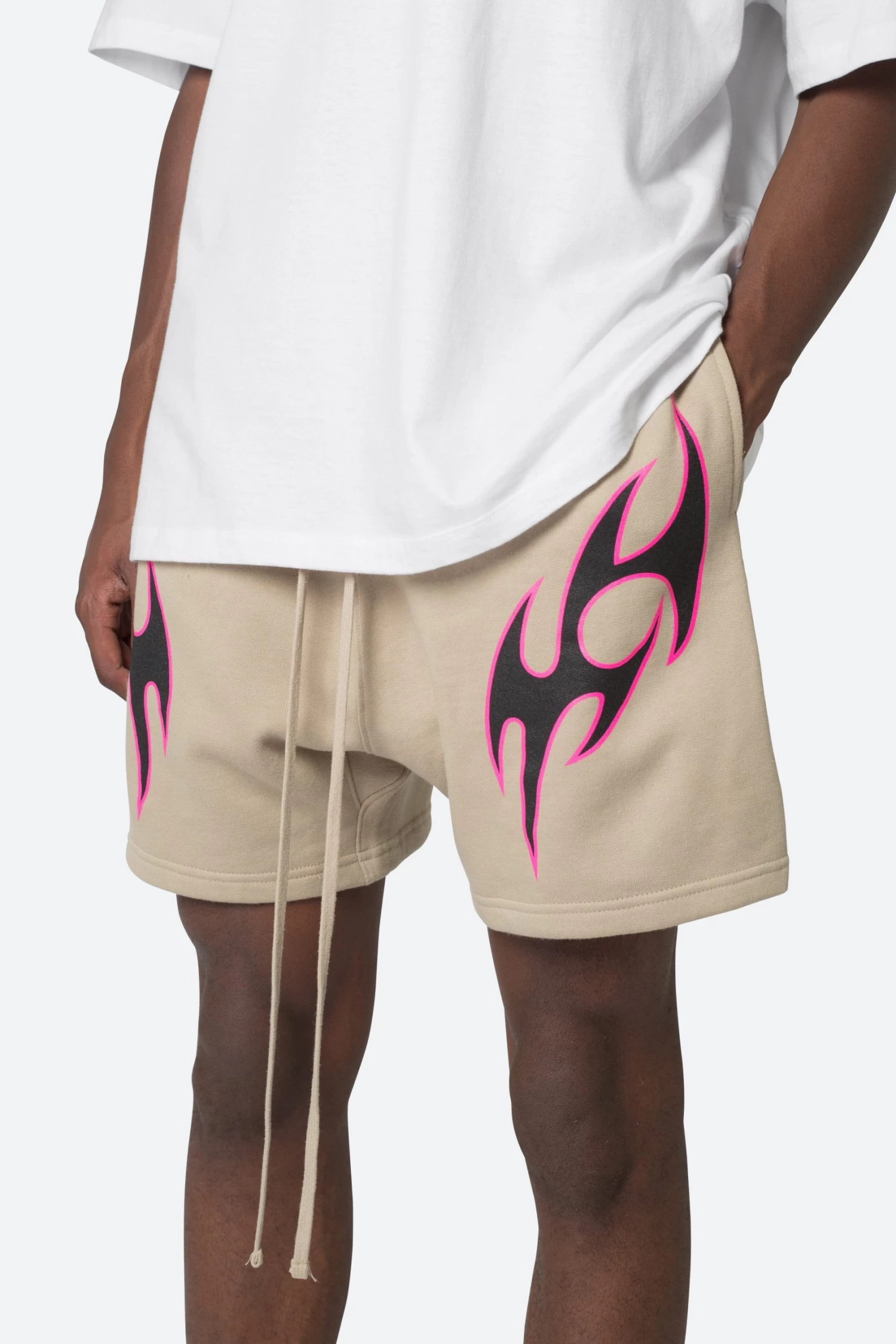 the Tribal Sweatshorts are constructed with a custom-knit french terry fabric in a relaxed fit. The short feature an elasticized waist in self fabric, welt pockets at the outseam, a cotton drawstring, and fishished with a multi color tribal screen print.