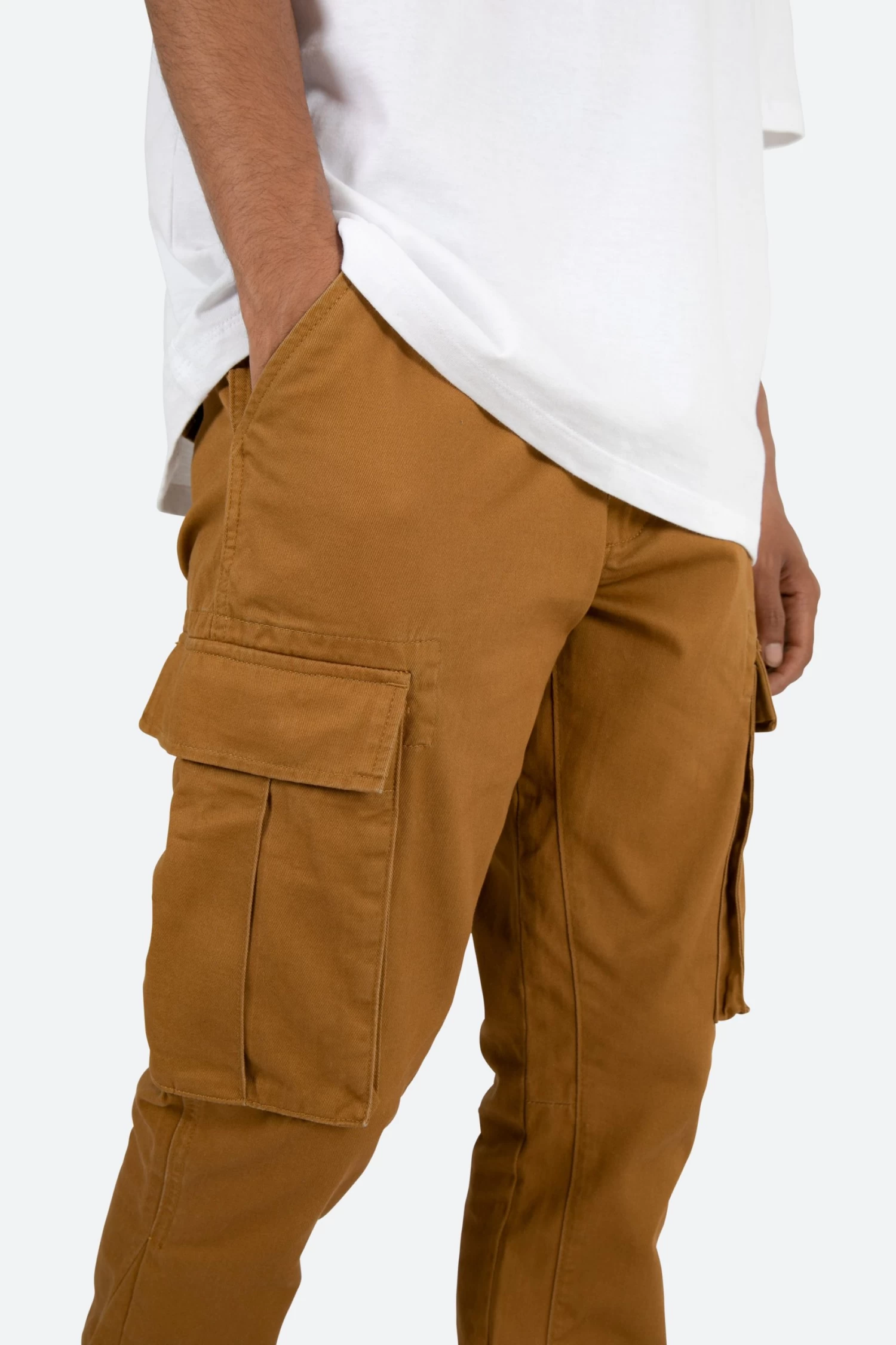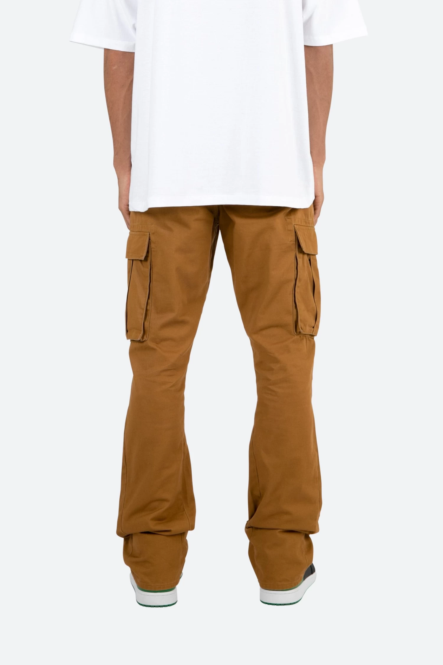the Twill Flare Cargo Pants are designed with our new B fit, which is slim through the thigh and features a slight flare at the leg opening and is constructed from washed twill, panelling at the inseam and outseam for a slight flare, cargo pockets at the outseam, and finished with a deconstructed hem.