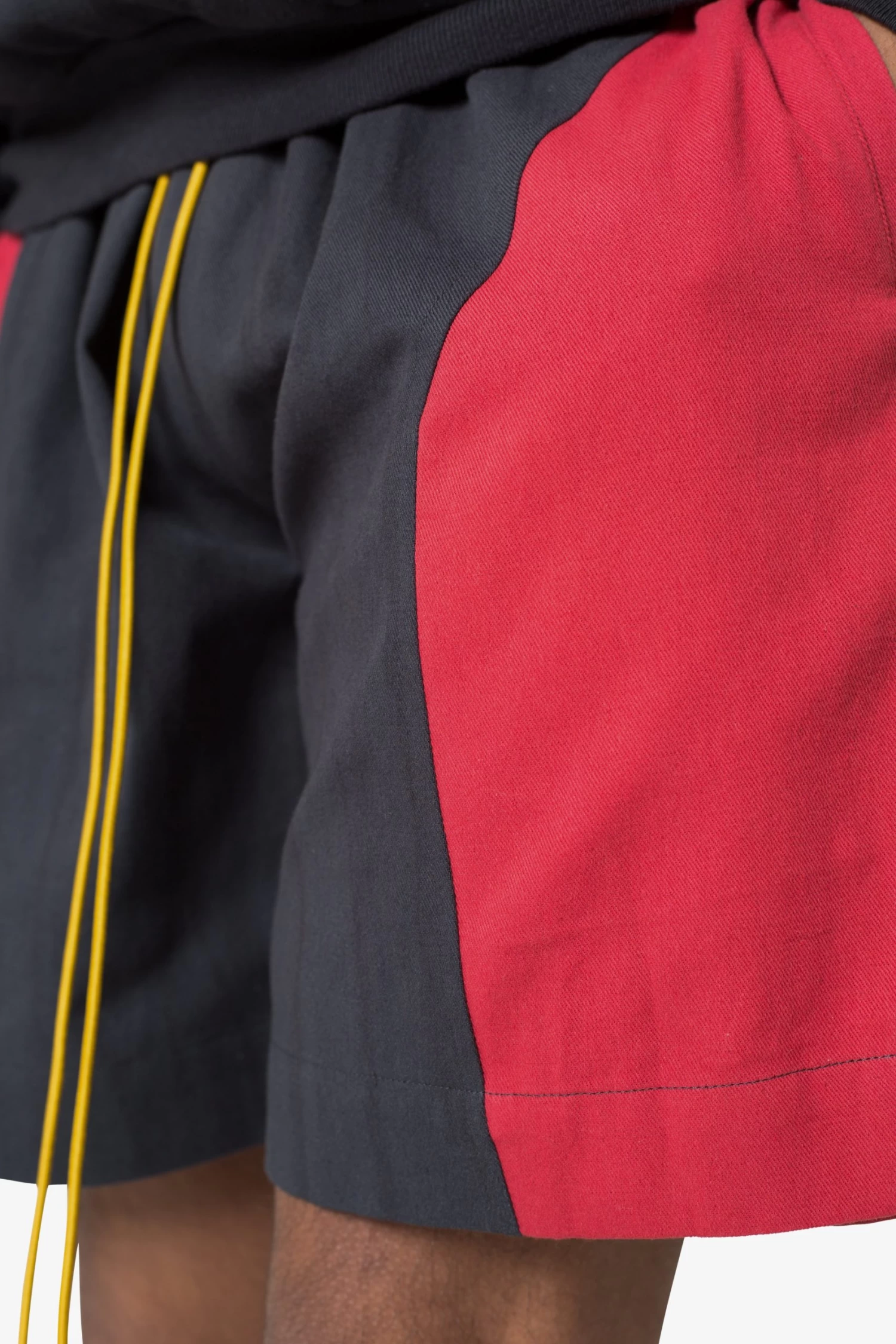 the Twill Racing Shorts are constructed from a cotton fabric in a relaxed fit. The short feature an elasticized waist, welt pockets at the front, welt pockets in the back, contrast panelling, and finished with an elastic drawcord.