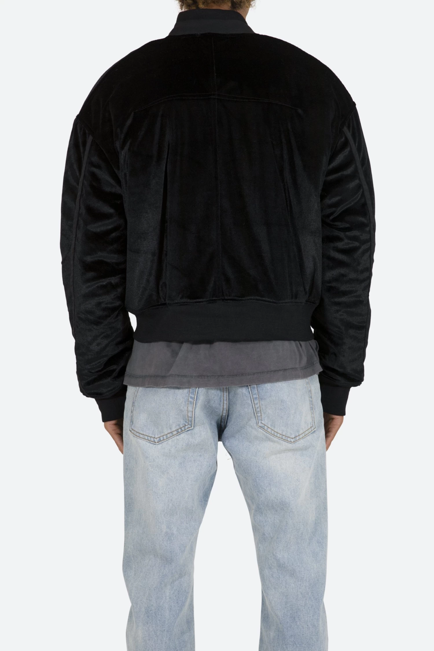 This Velour Bomber Jacket features a polished zipper at the chest with exposed taping, tonal lining, tonal ribbing at the waist, wrists, and collar, and finished with a double layered collar.