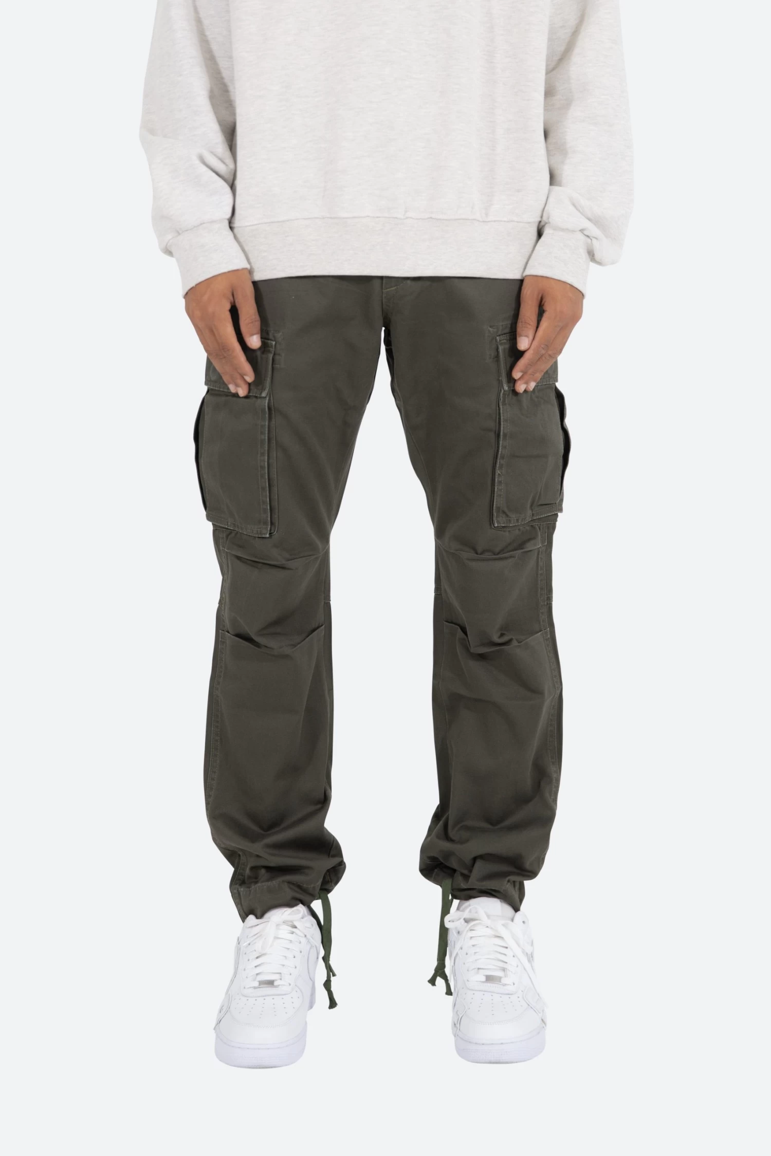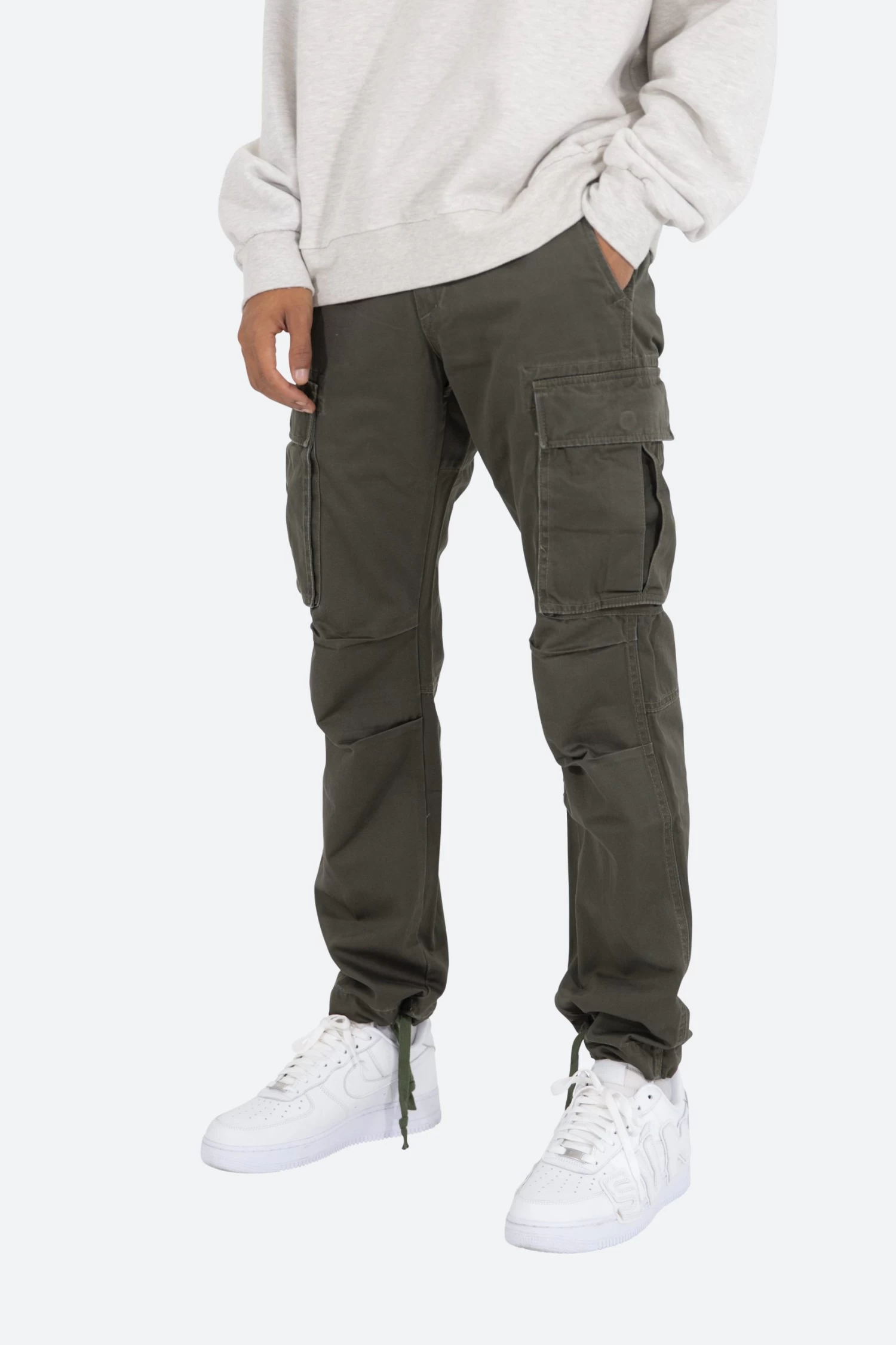 the Vintage Twill Cargo Pants are designed with a relaxed fit throughout with gusseting at the knee, cargo pockets at the side seam, a cinch-able waistband, zipper fly, and finishing off with elastic and cargo drawcords at the leg openings.