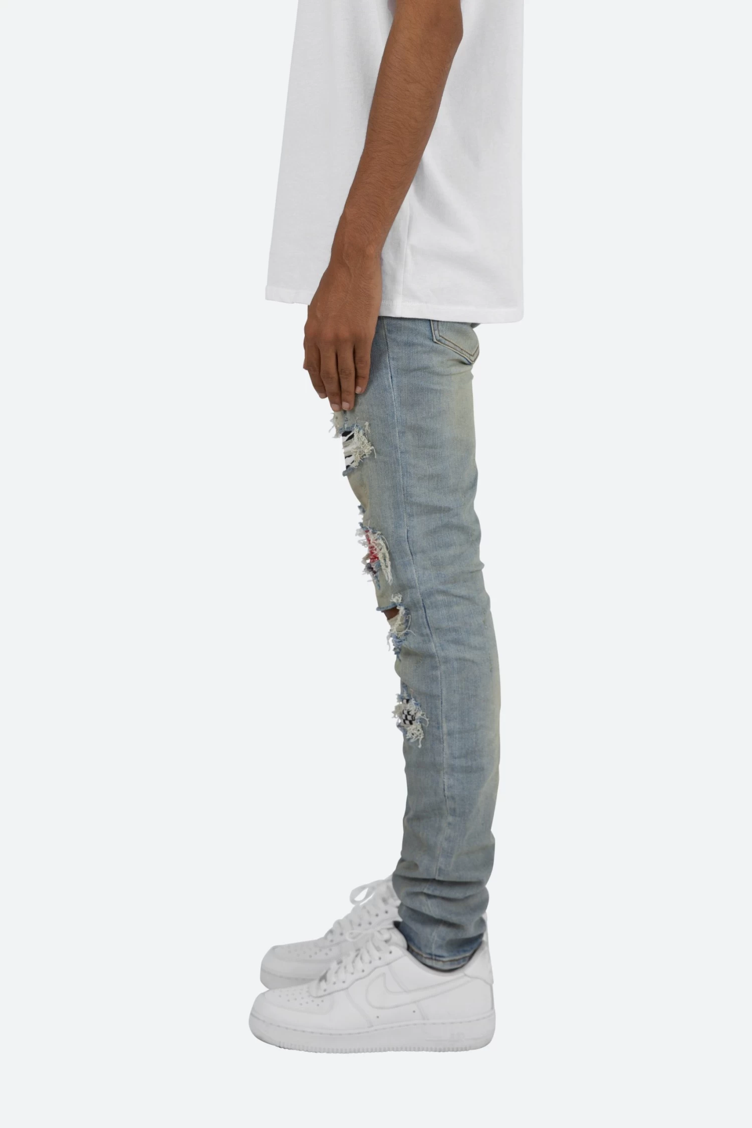 the X214 Stretch Denim is designed with our new X fit which is skinny throughout with an extended inseam for stacking, and features a medium wash, distressing throughout and finished with mixed printed fabric repairs in both the knees and thigh distressing.