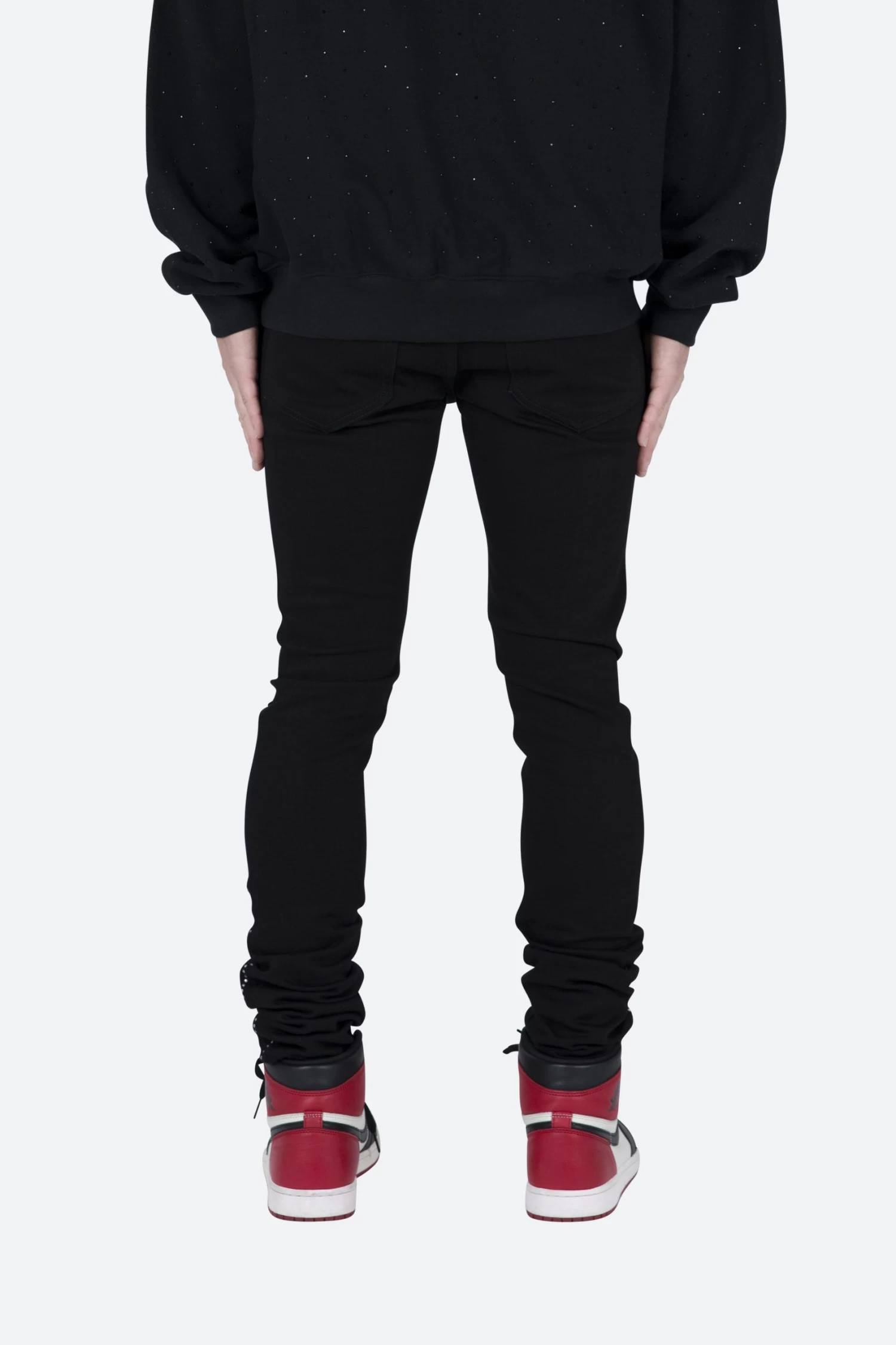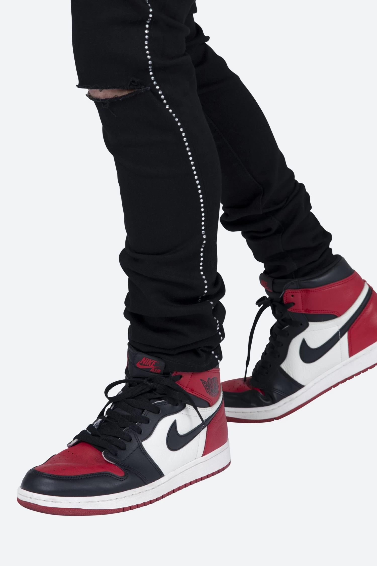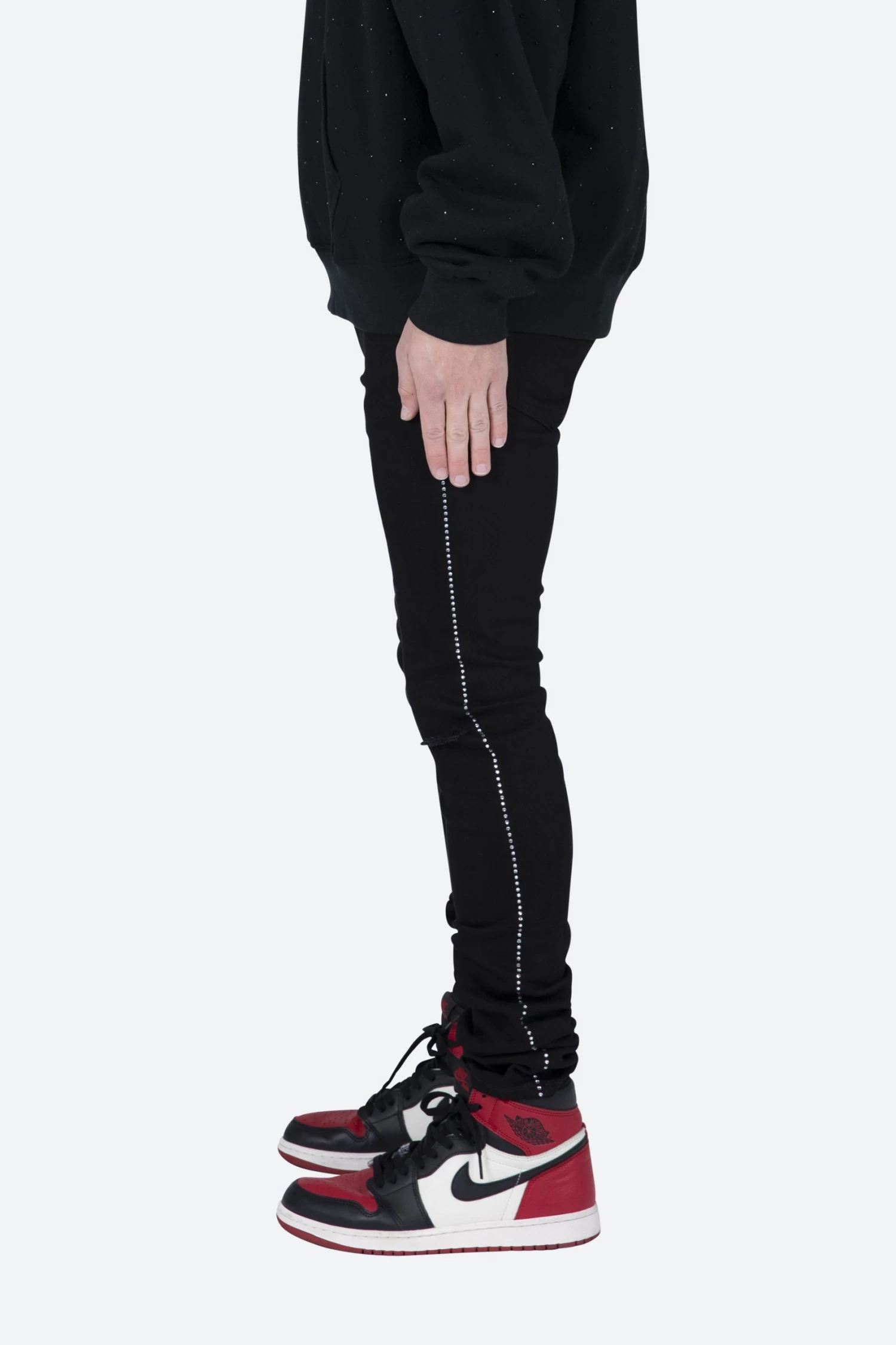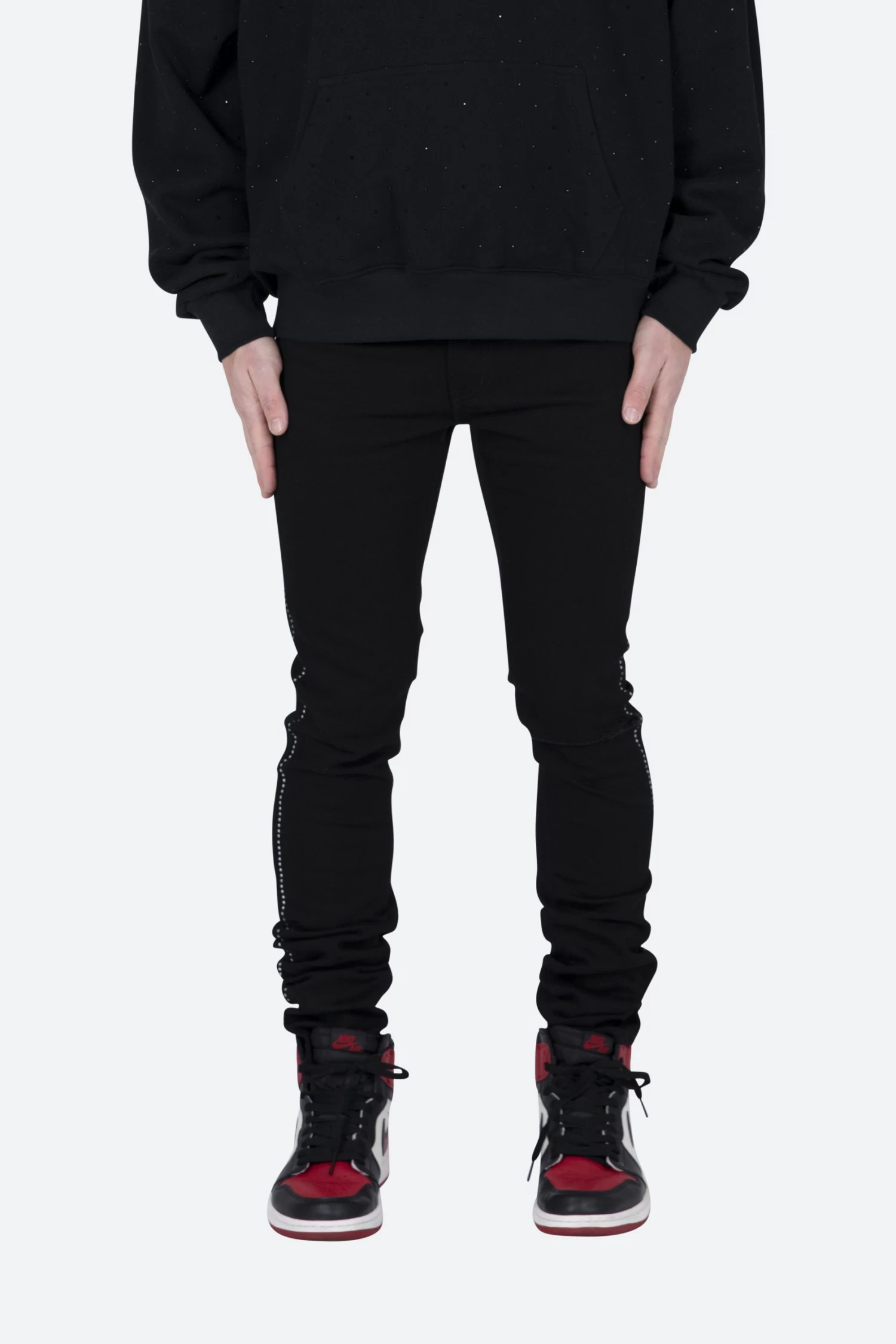 the X457 Rhinestone Stretch Denim is designed with our new X fit which is skinny throughout with an extended inseam for stacking, and constructed from black denim, and finished with rhinestones down the outseam.