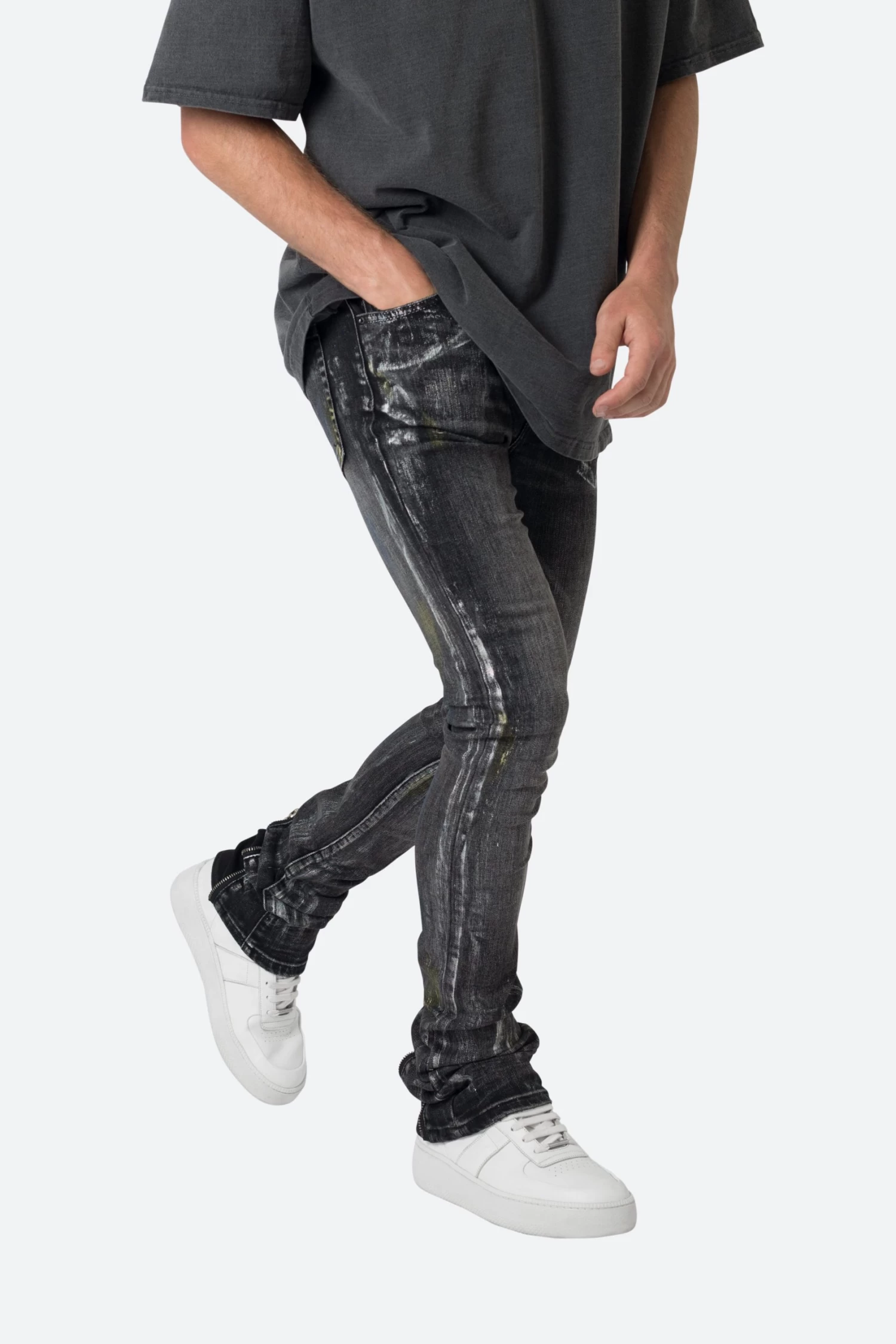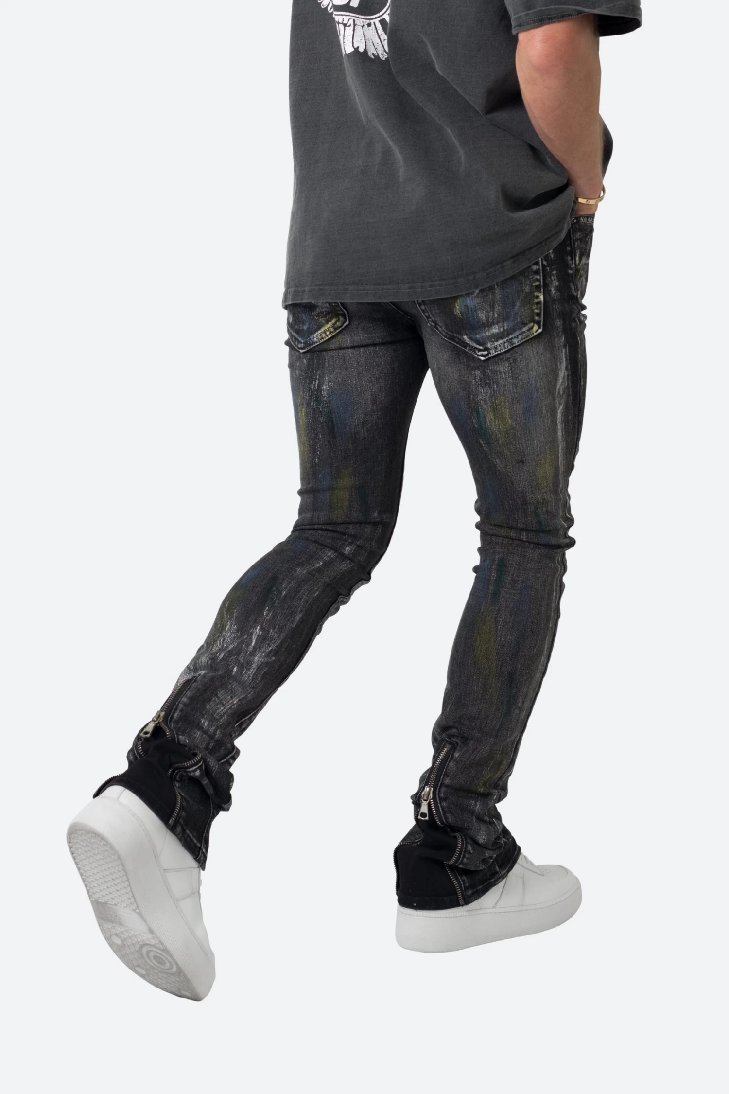 the X509 Convertible Skinny Denim is designed with our new X fit which is skinny throughout with an extended inseam for stacking, constructed from stretch denim, a zipper up the back that converts the pants to a flared leg opening, and finished with multi color paint details throughout.