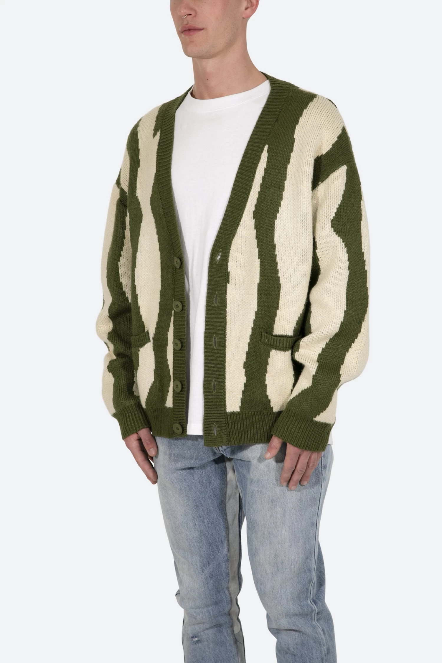 the Zebra Cardigan is a custom knit sweater that is constructed from acrylic and features a button placket, pockets on the front and is completed in a zebra pattern.