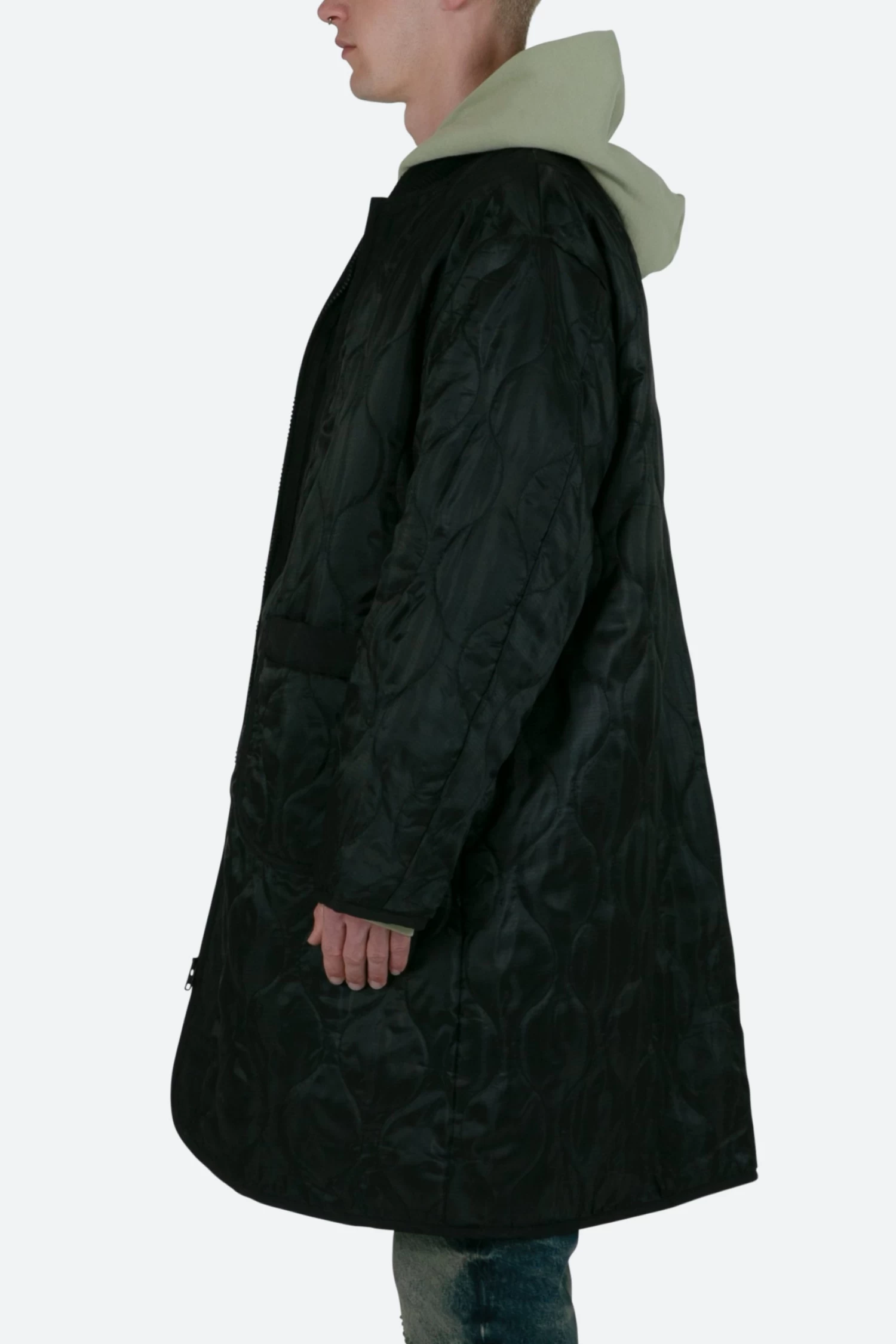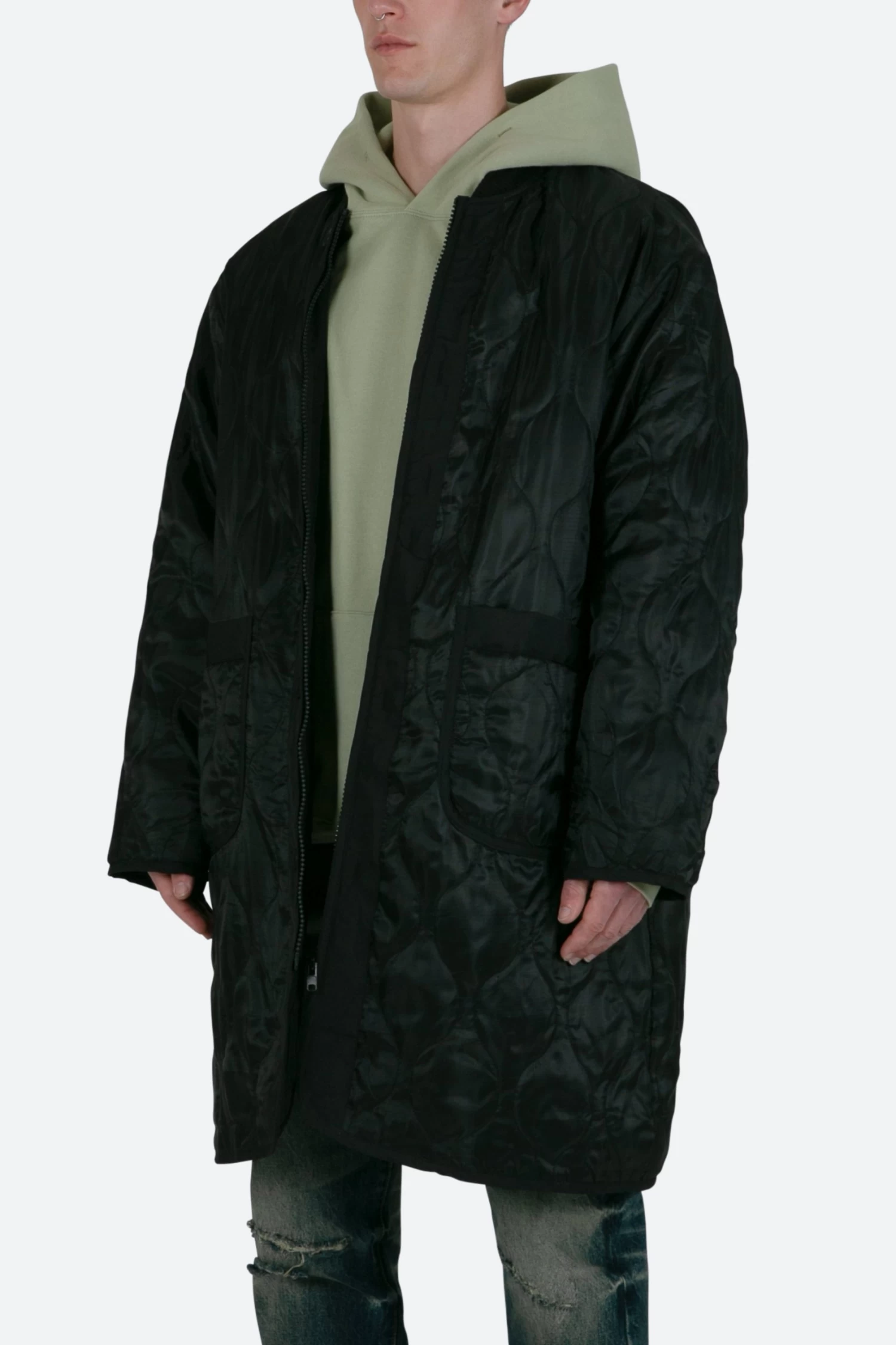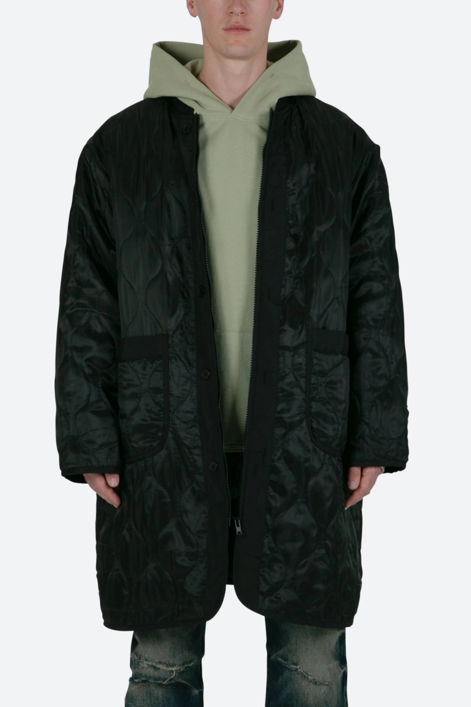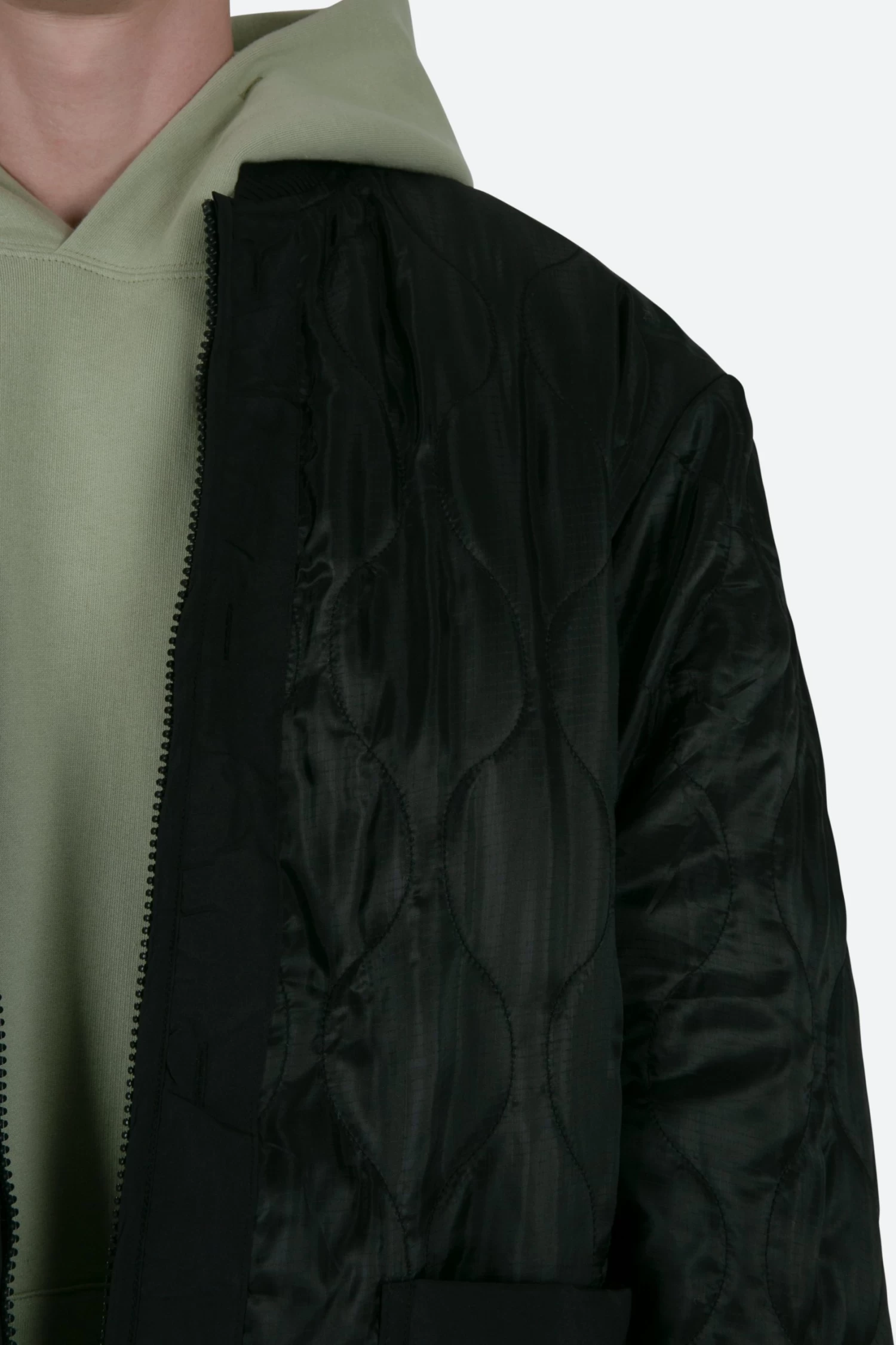 the Zip Up Bomber Trench is constructed in a relaxed fit from a quilted nylon fabric, both buttons and zipper closures on the placket, and finished with pockets at the waist.