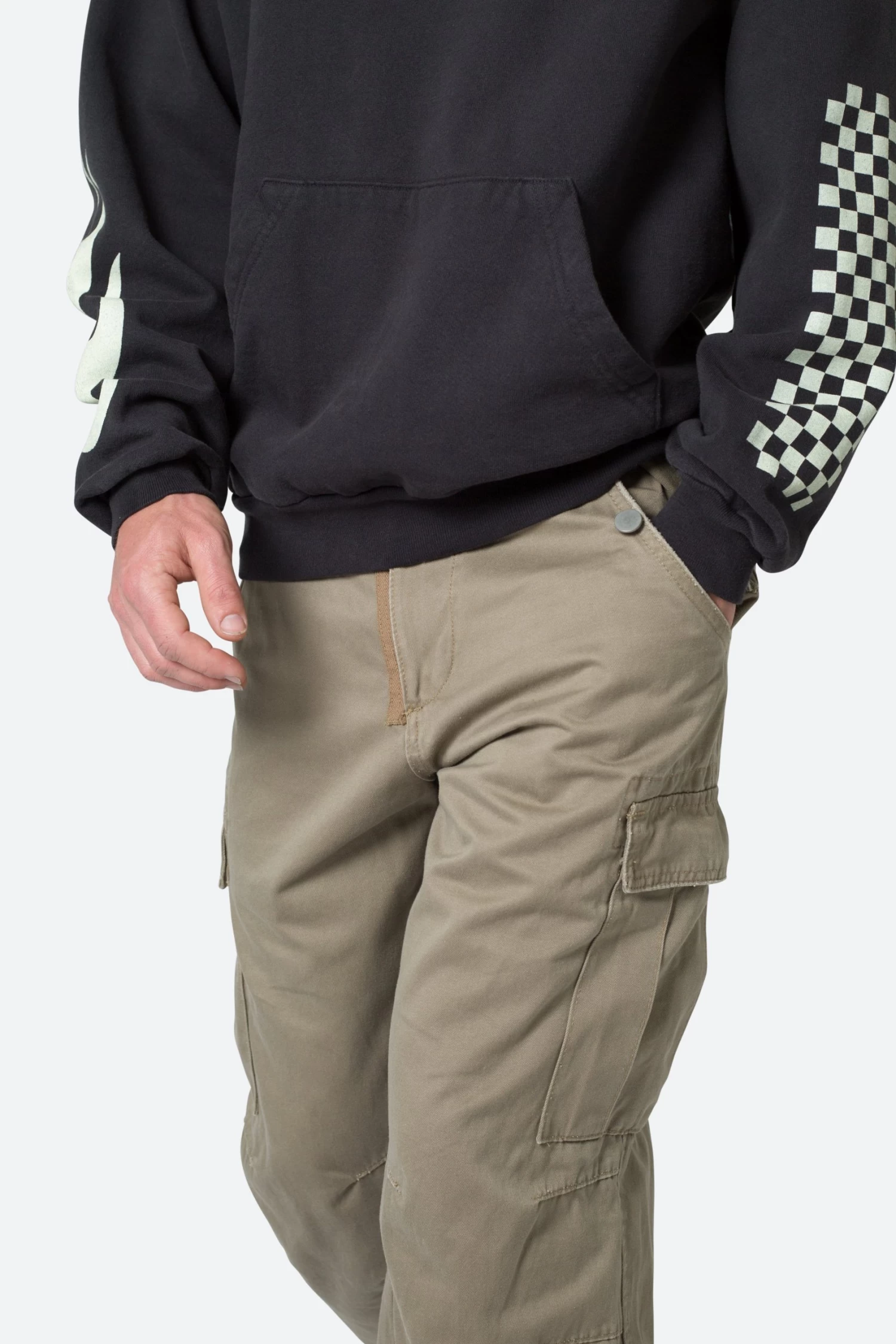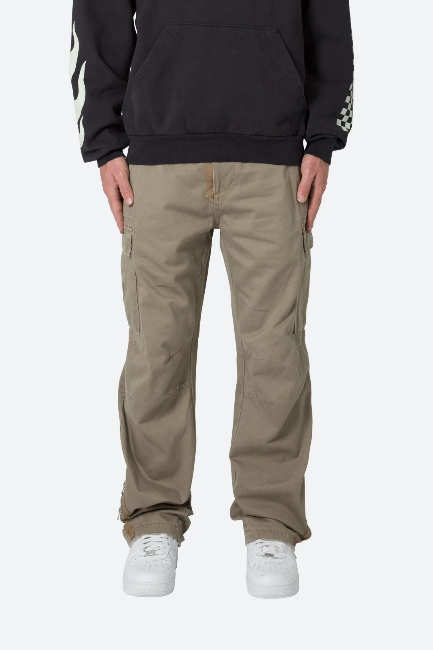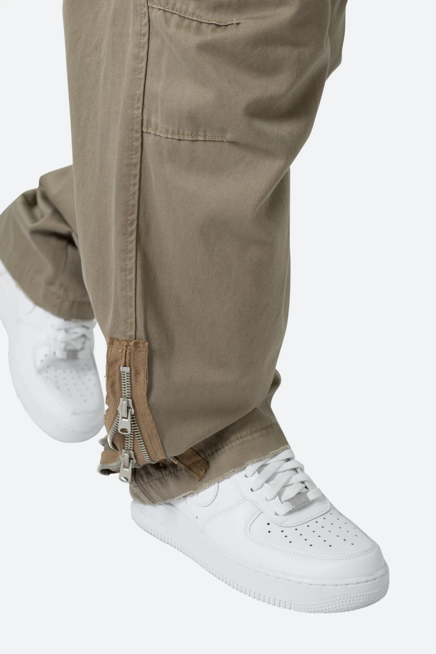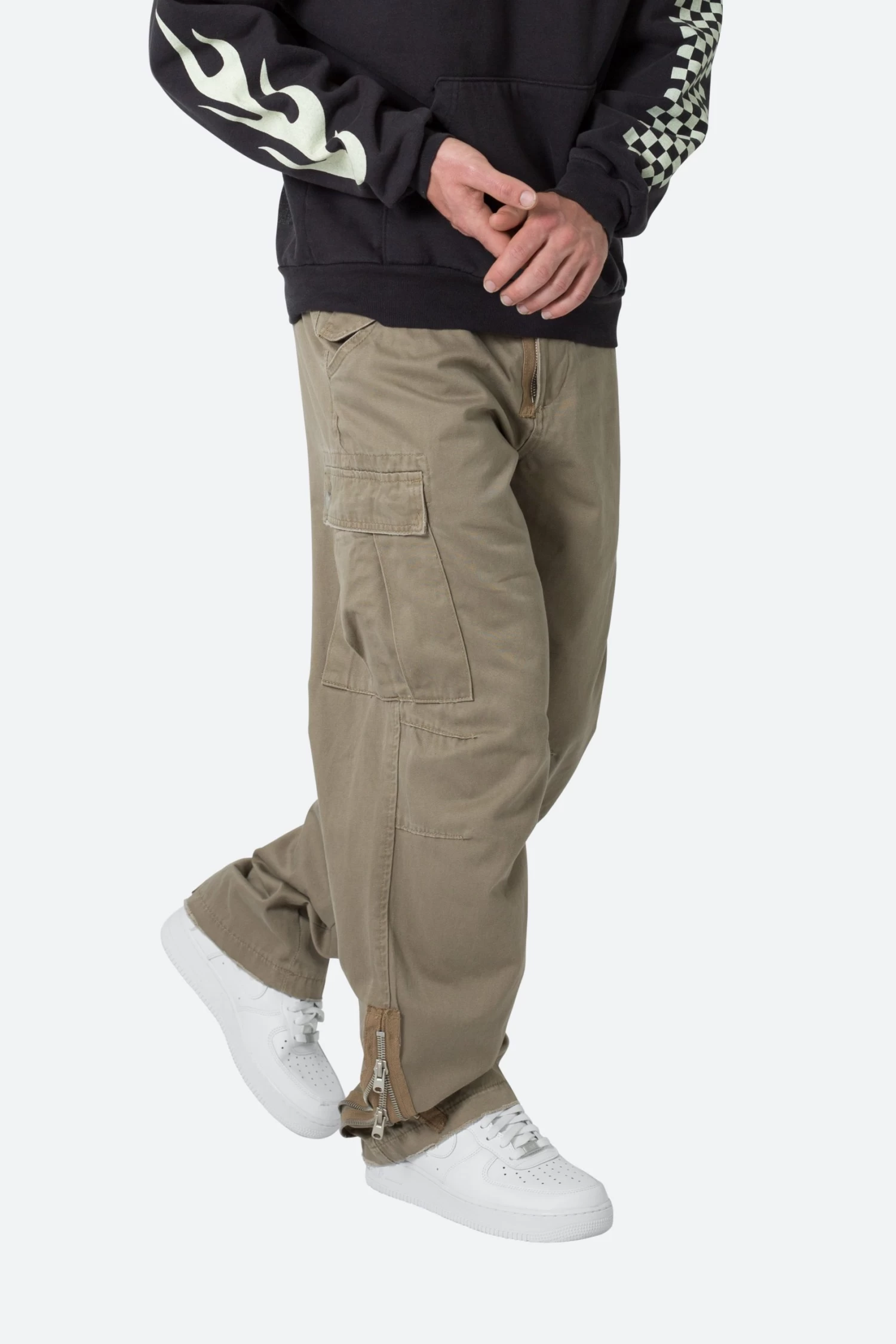 the Zipper Denim Cargo Pants are designed with a relaxed fit throughout, with cargo pockets located on the outseam, gusseting at the knees,  double exposed zippers at the outseam for a slight flare, deconstructed hem, and finished with a vintage wash.